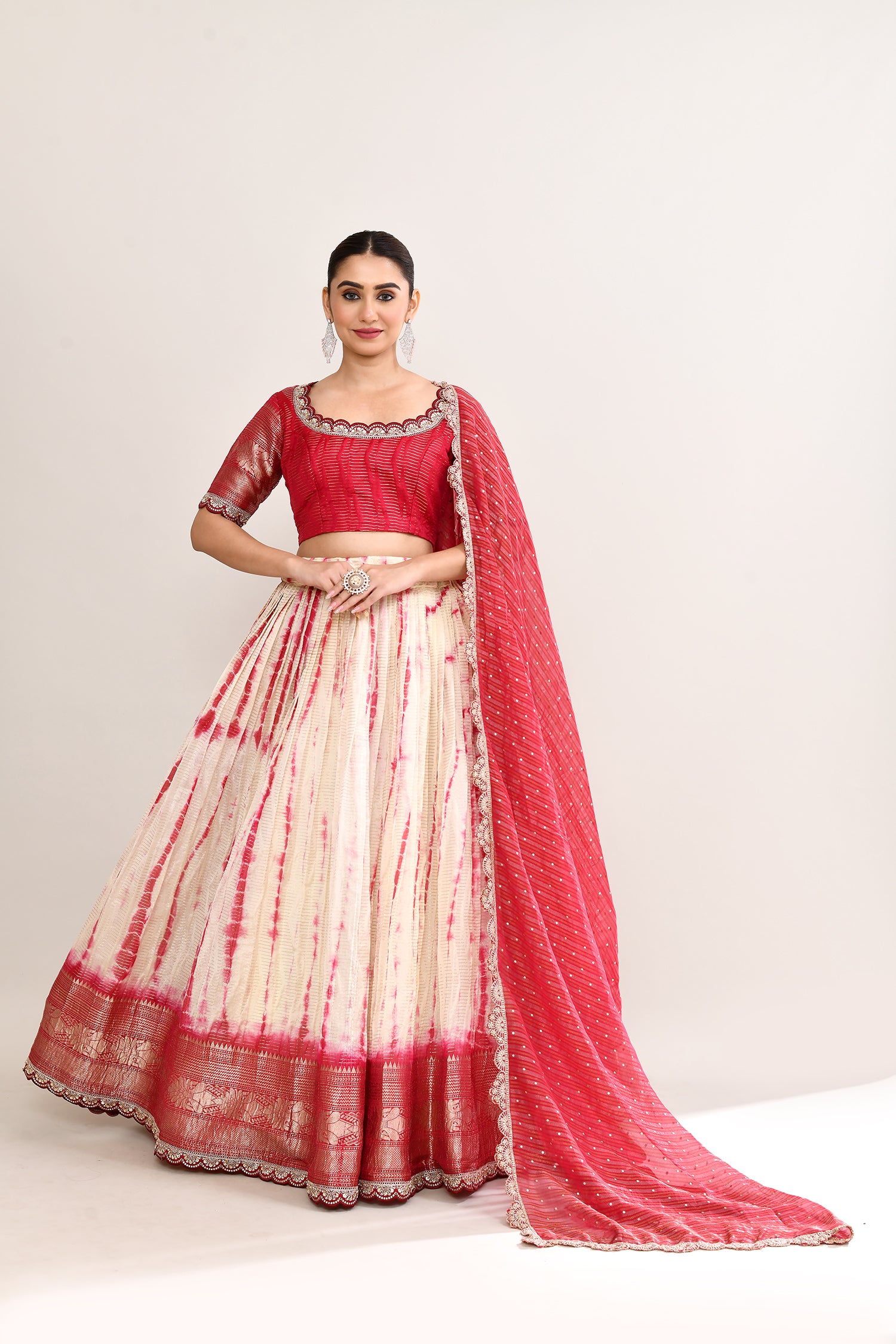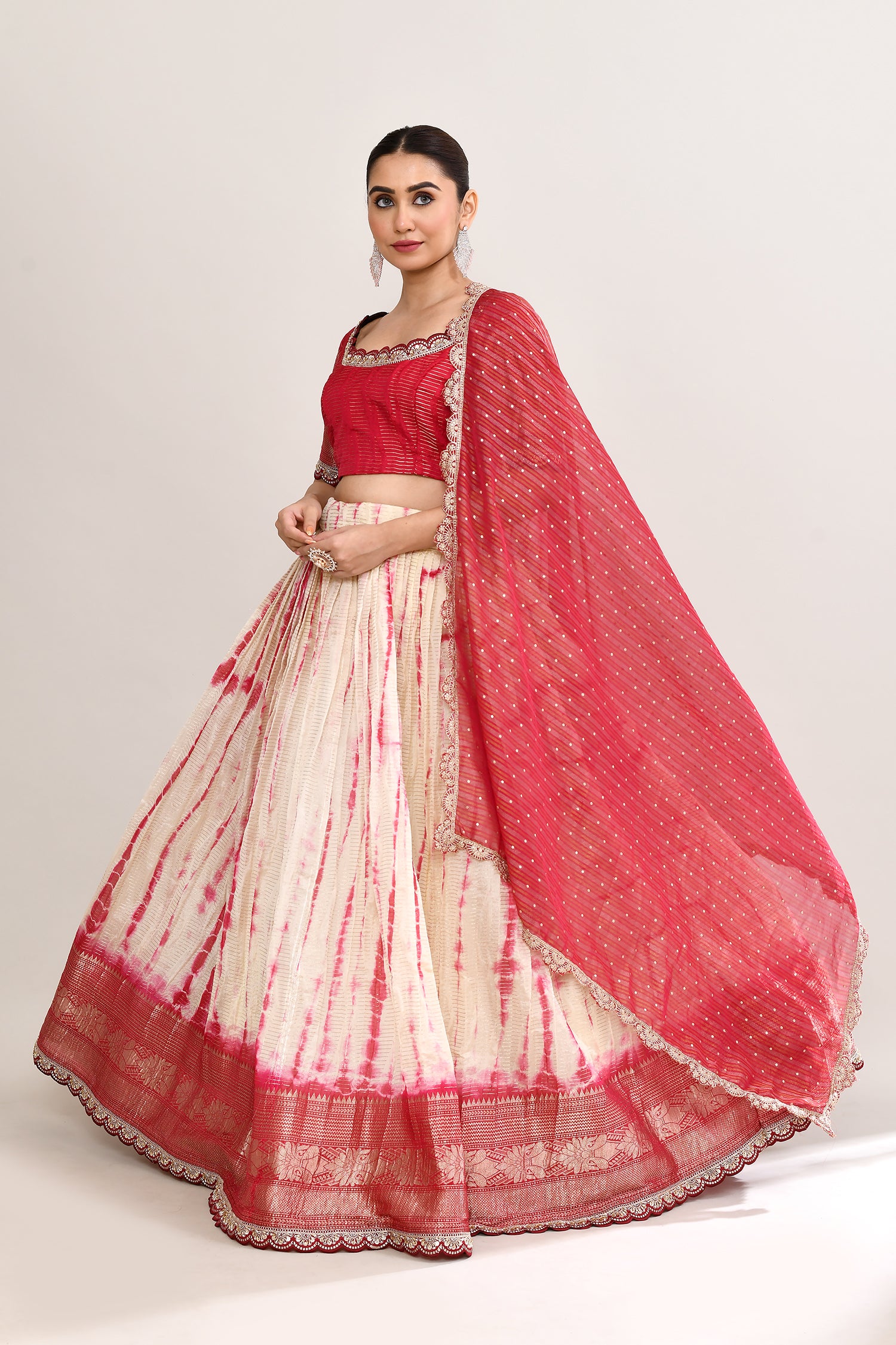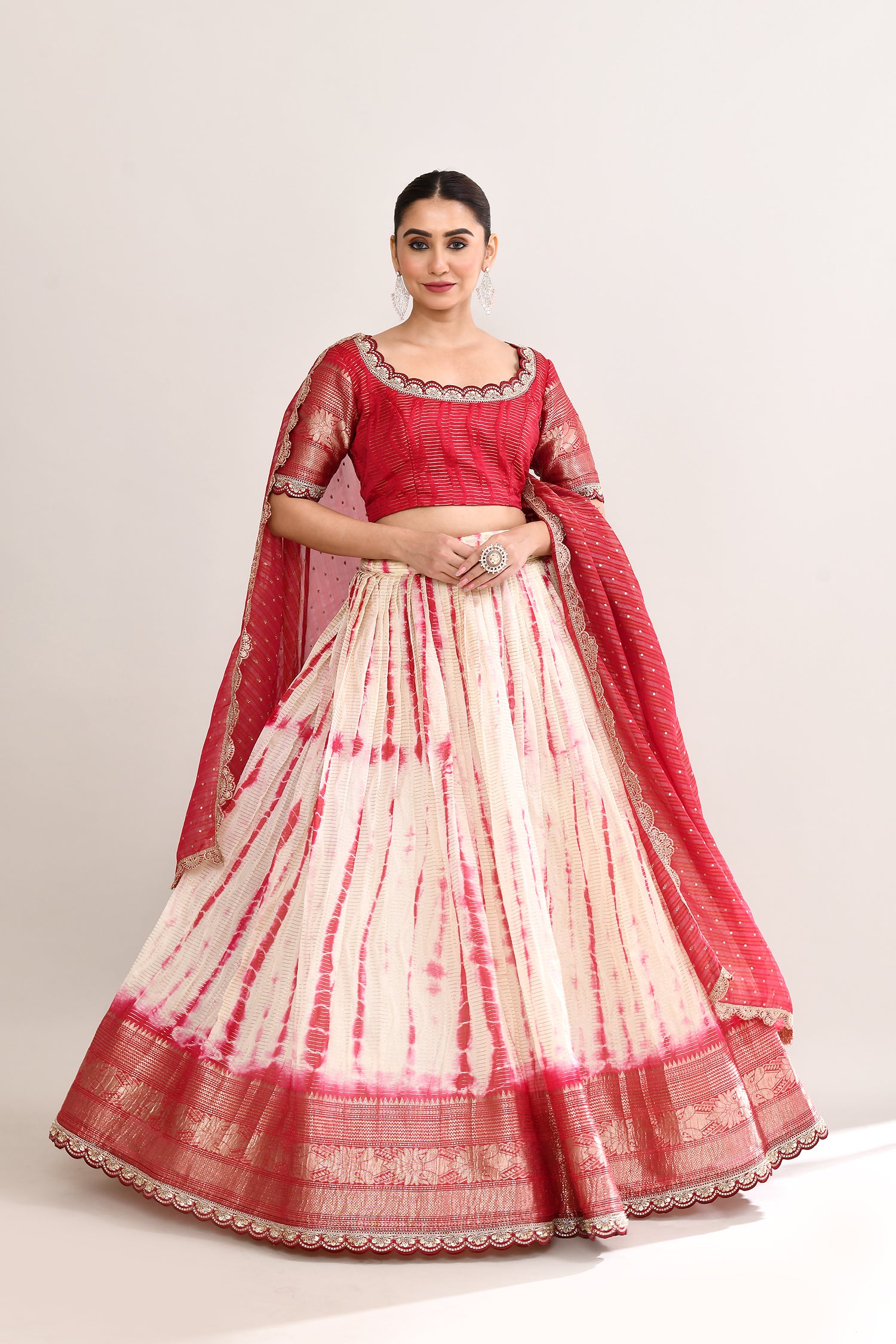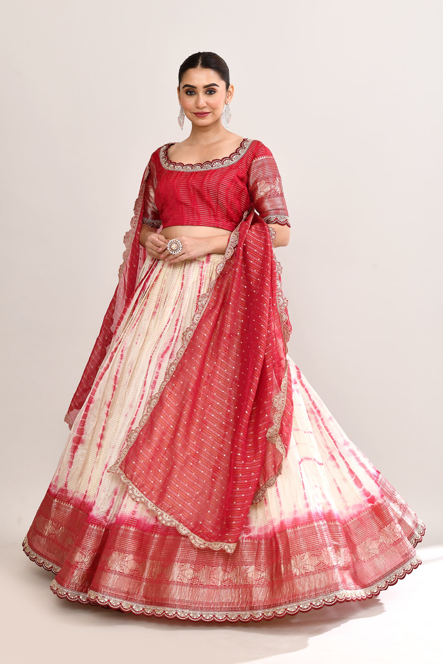The off white and red raw silk lehenga set with organza dupatta for a beautiful look with grace.