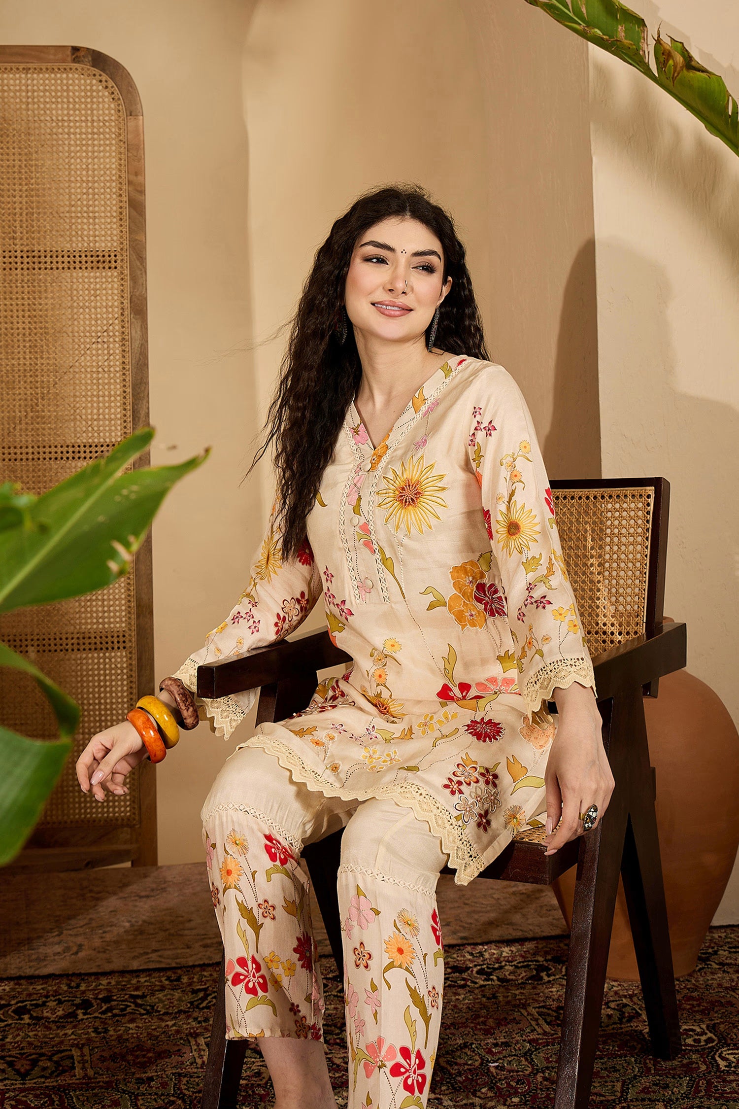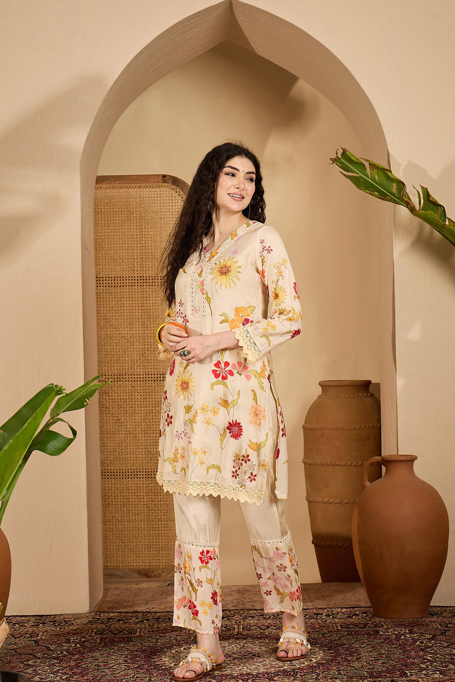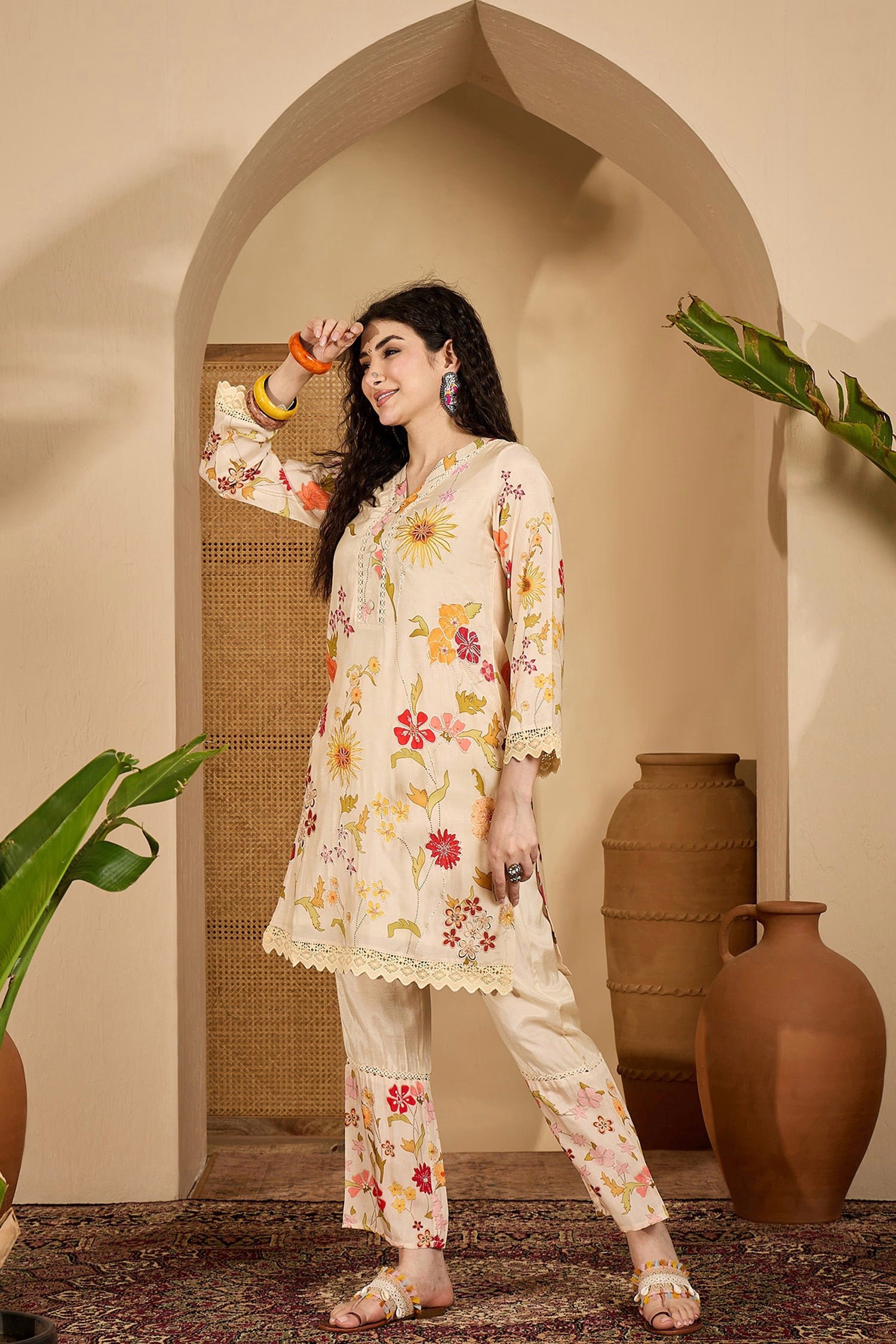 The off-white multicolour printed cotton short kurta set with floral prints along with a matching pant for an ethnic chic look with elegance.