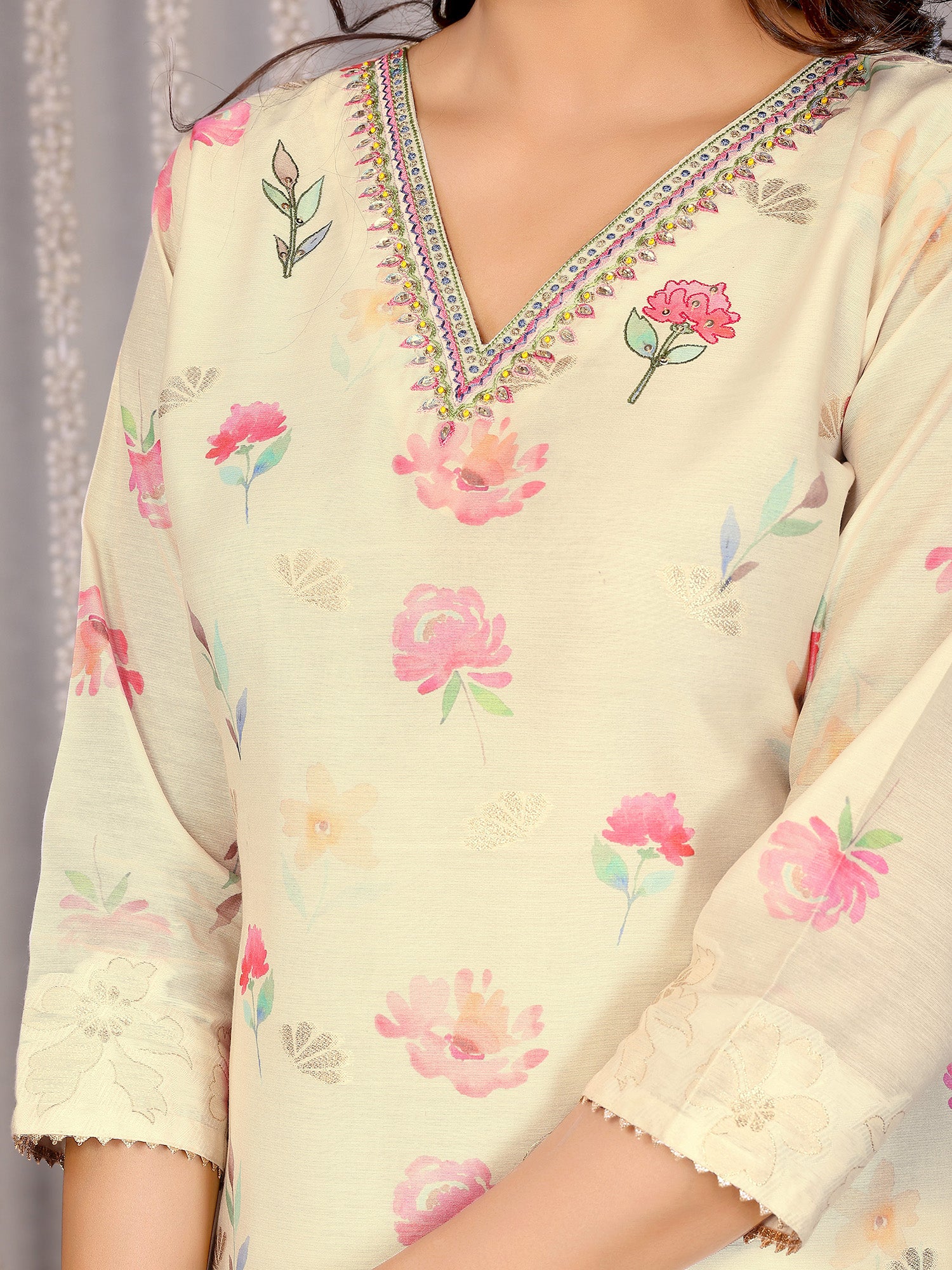 The off white floral printed chanderi kurta set with V-neck along with solid matching pant for an ethnic look with graceful appearance.