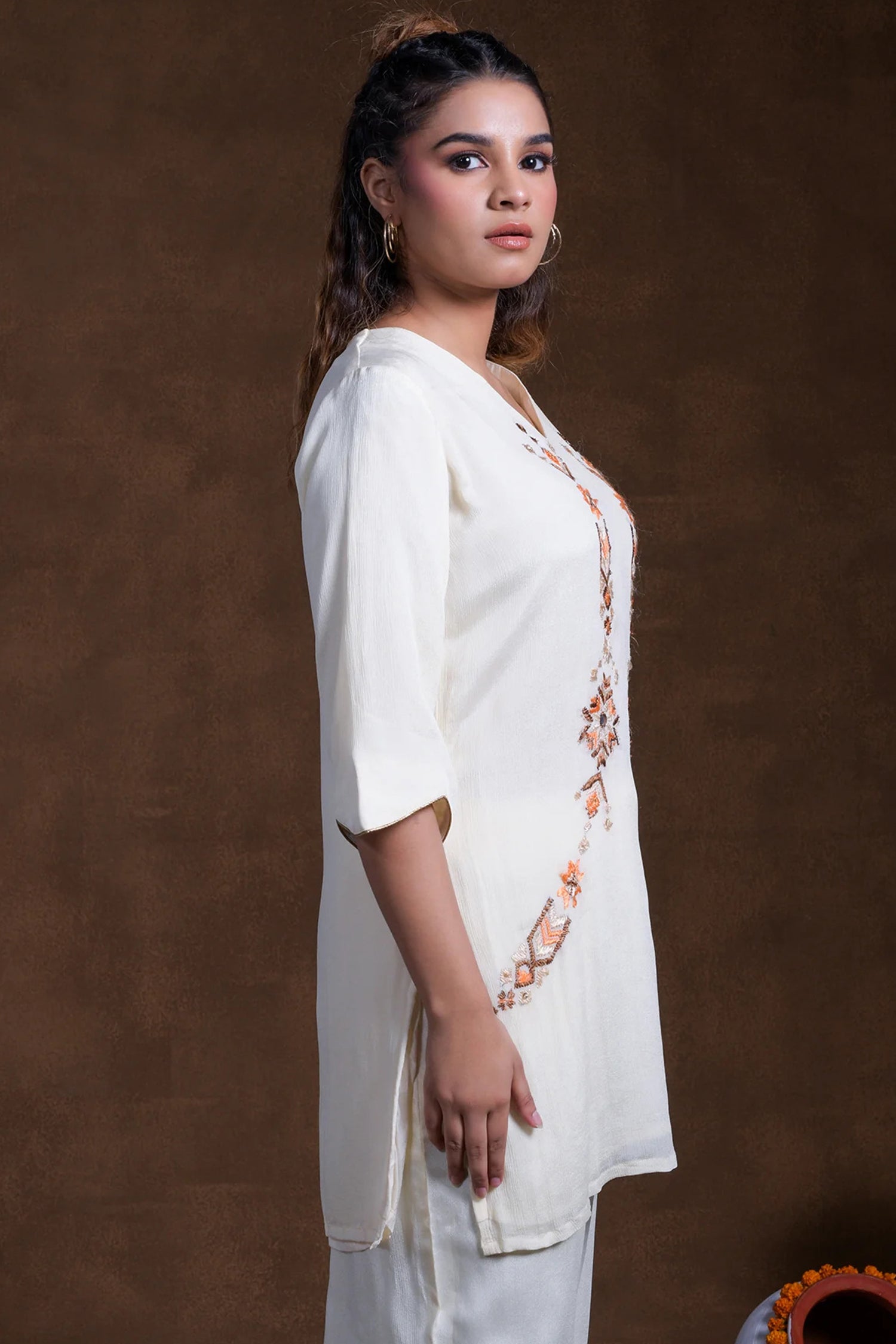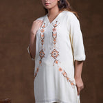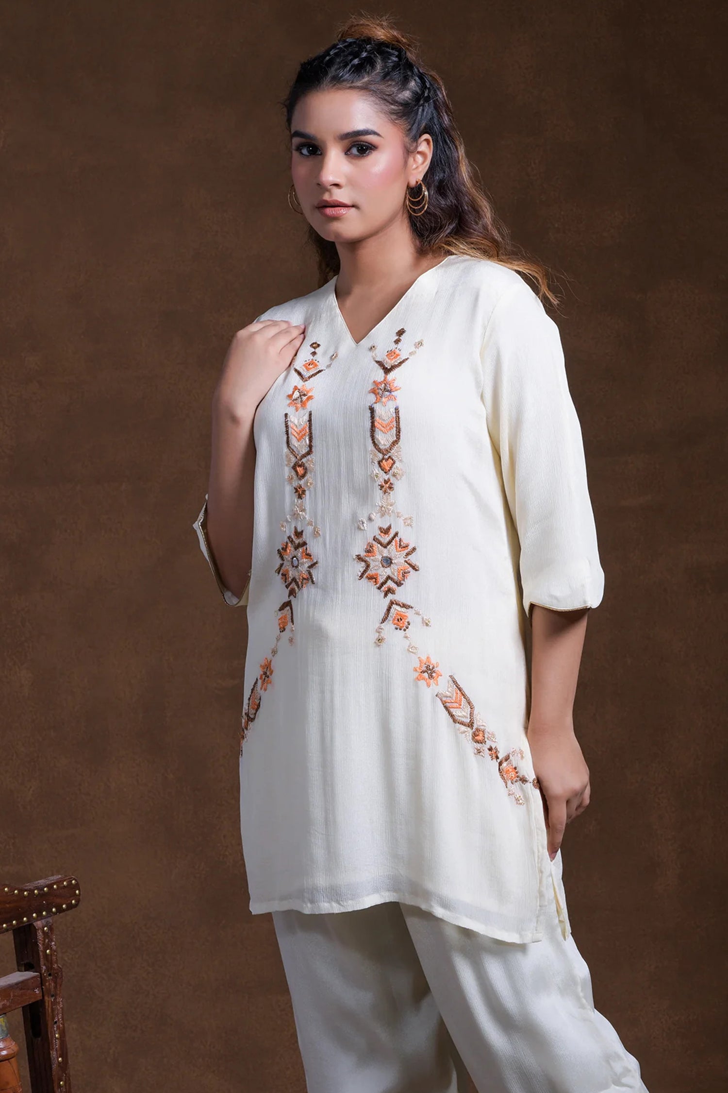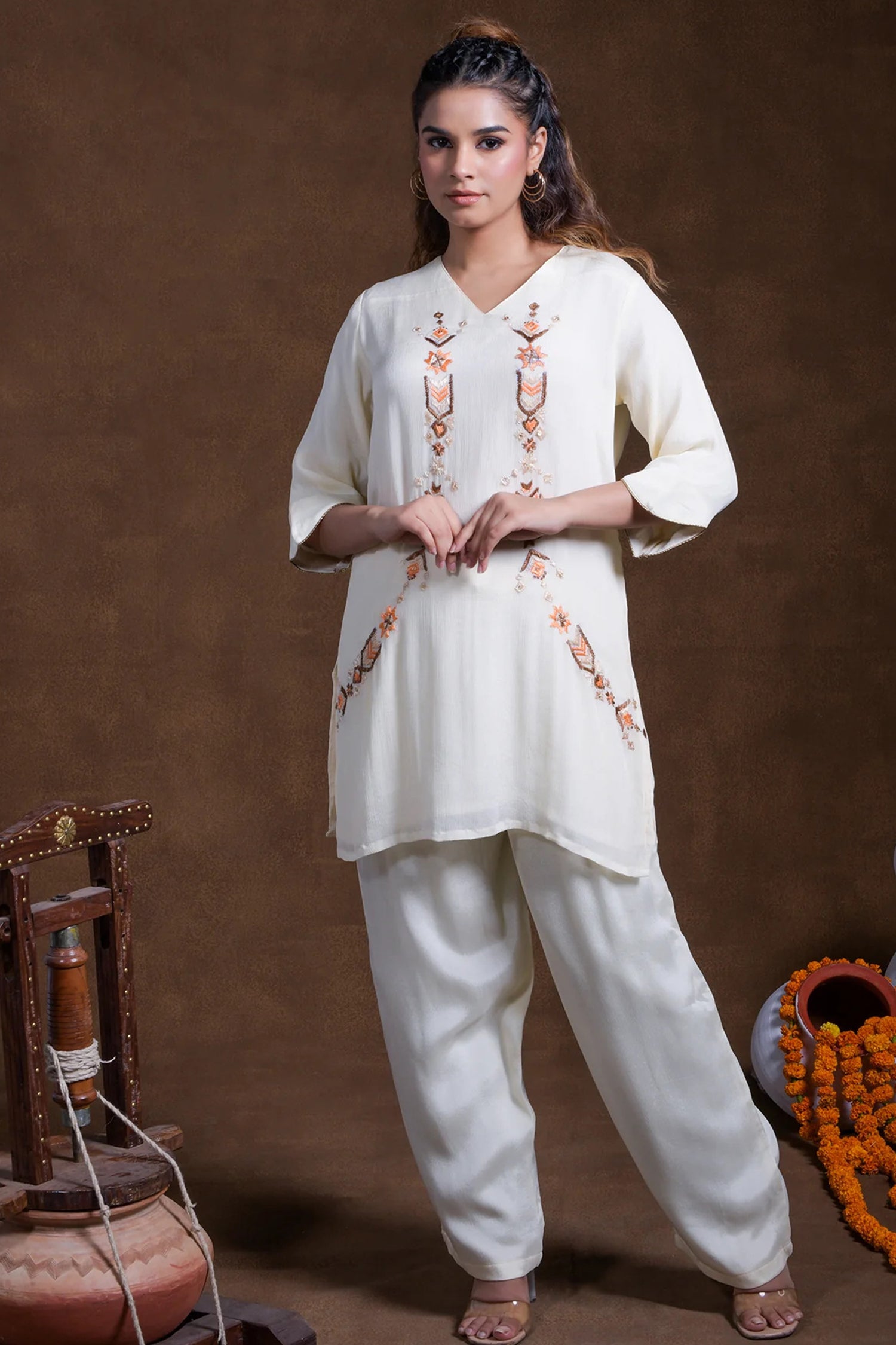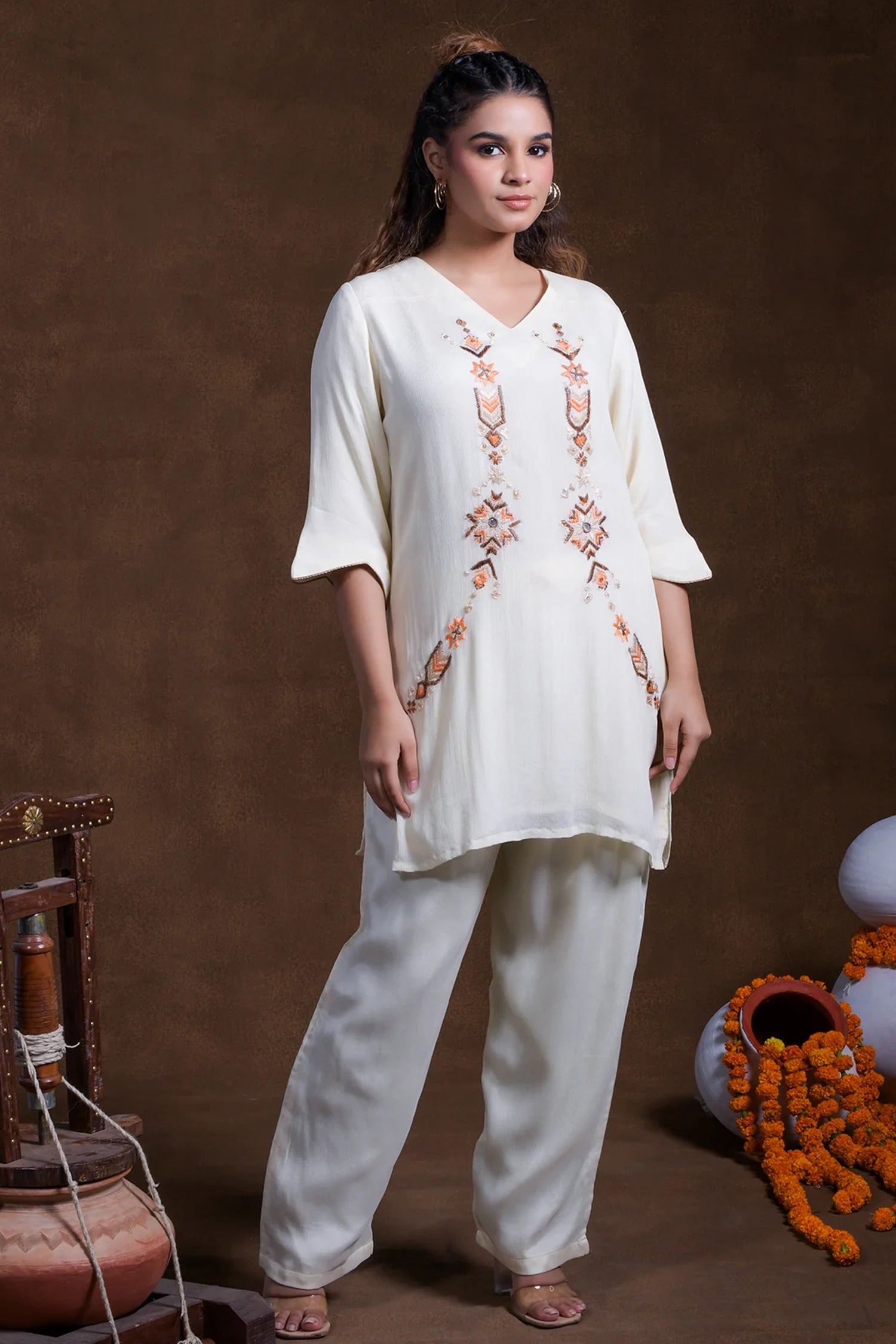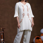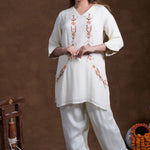 The V neckline with mid-length sleeves of off-white rayon tunic top adorned with embroidery in contrast colors complemented with palazzo pants