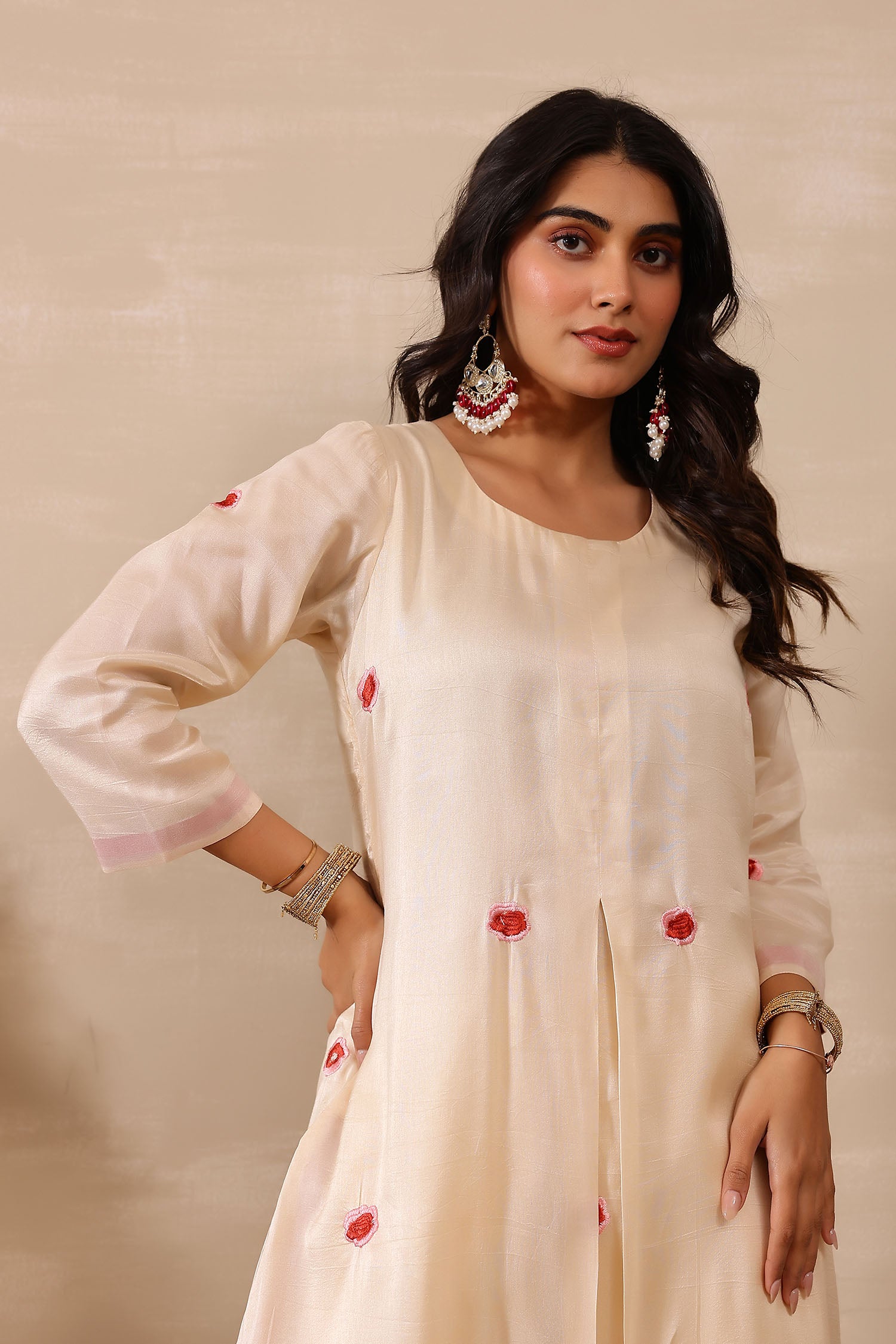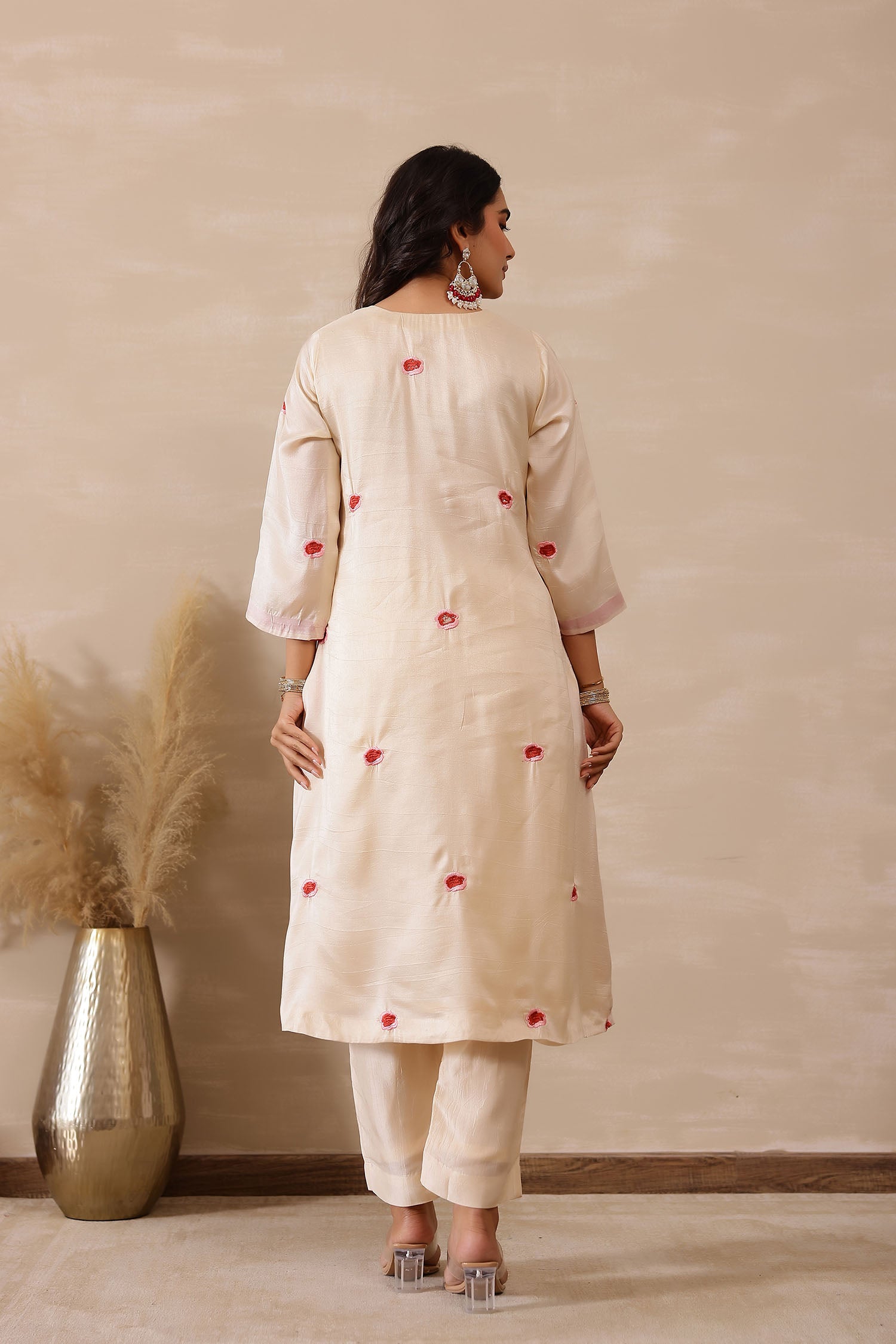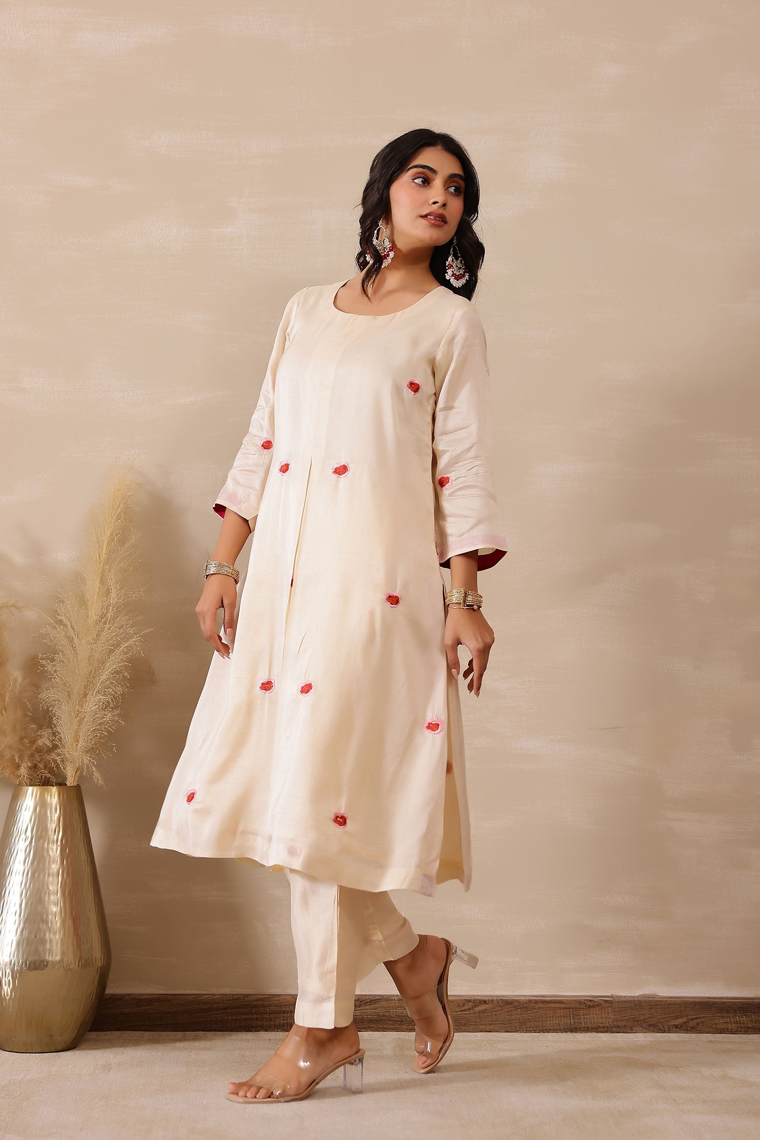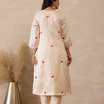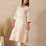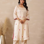 The off white russian silk rose red floral embroidered kurti set with matching pants for a charming and elegant look with traditional touch.