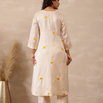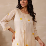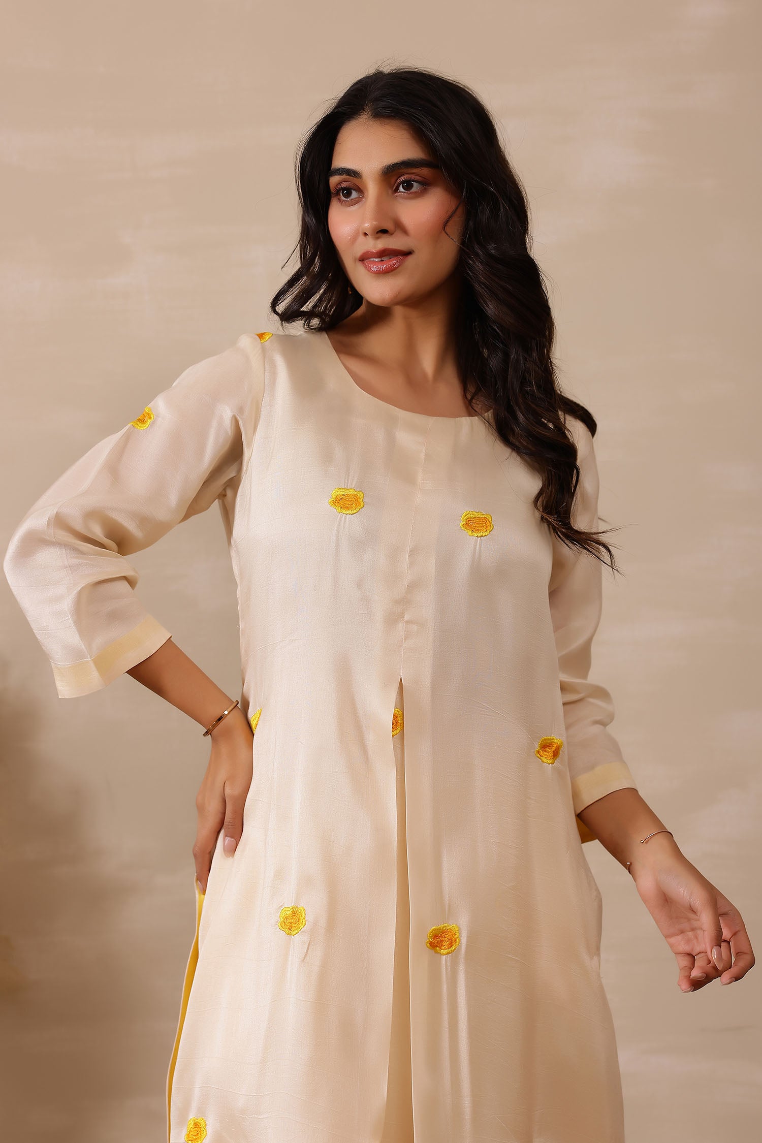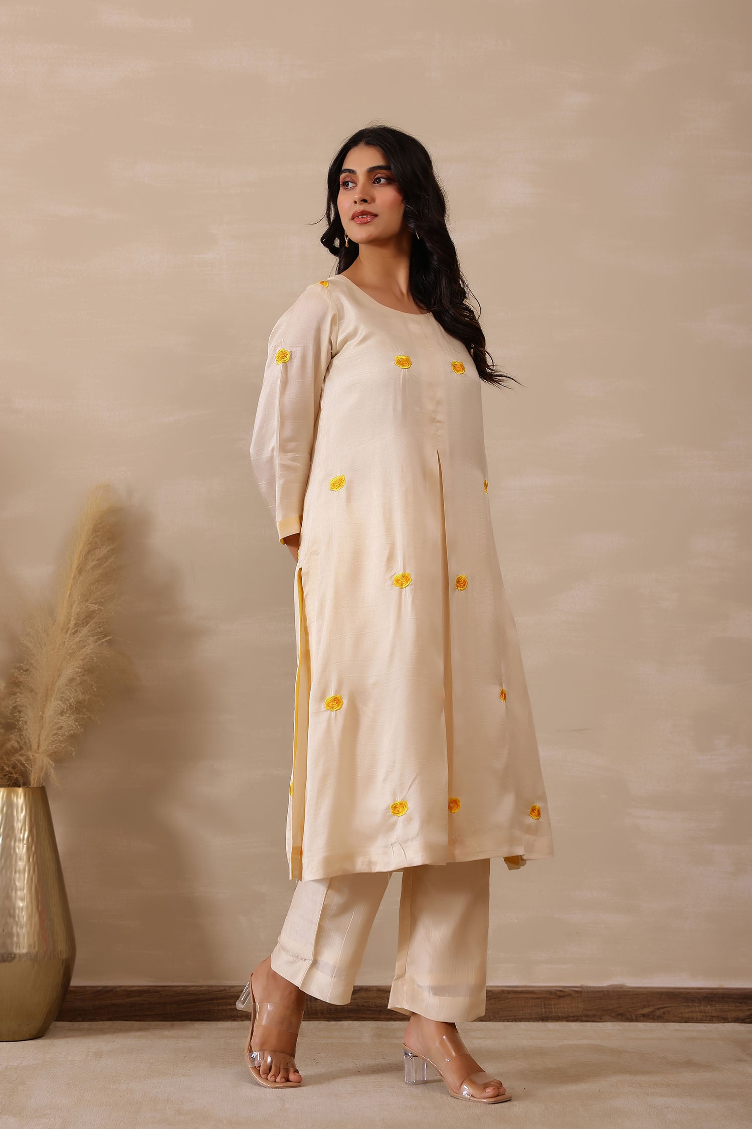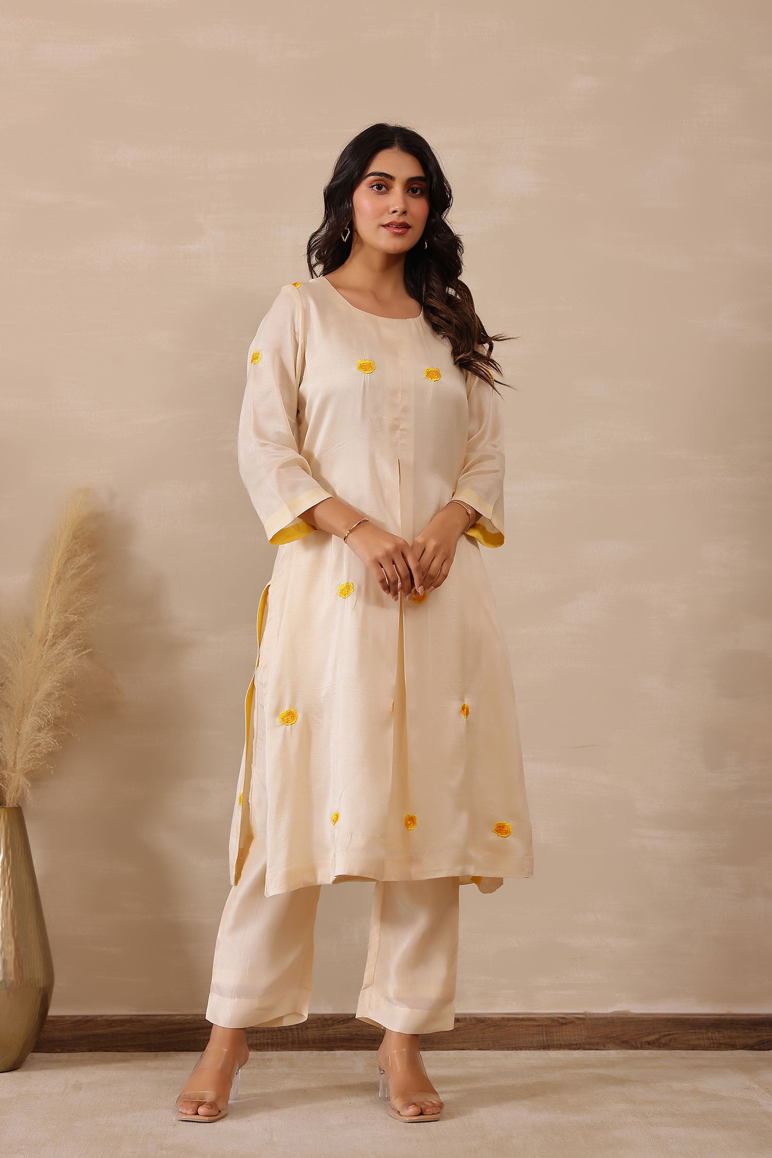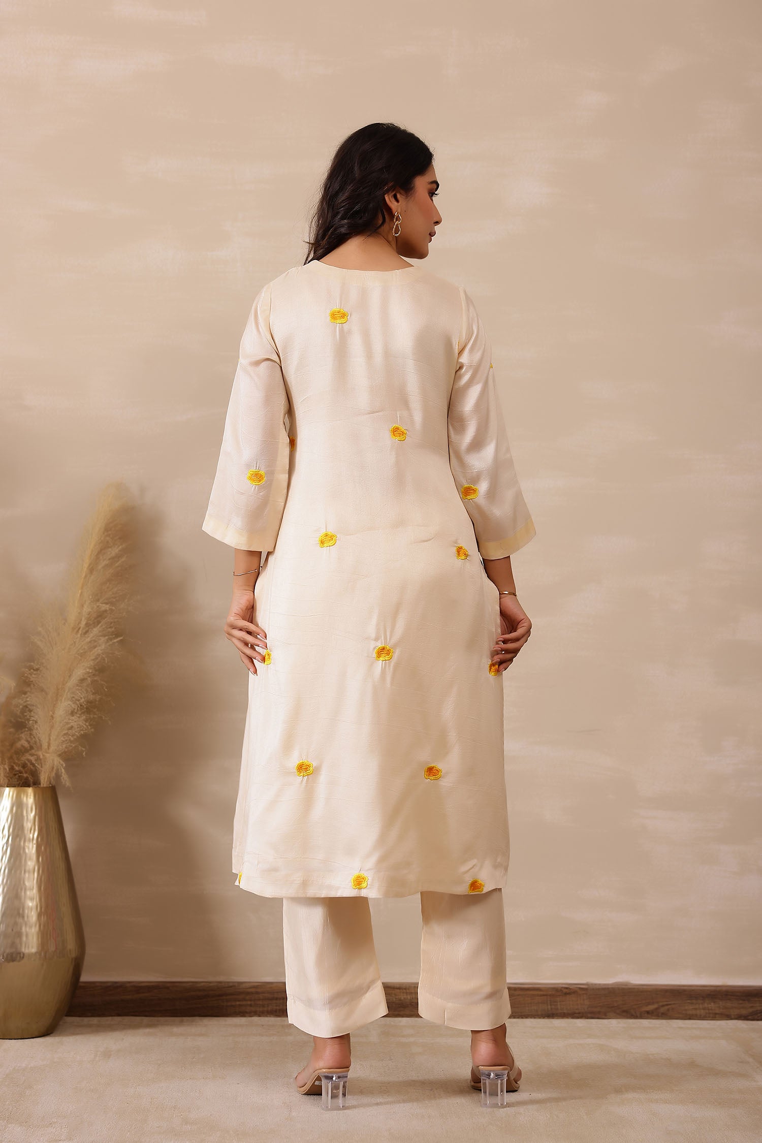 The off white russian silk yellow floral embroidered kurti set with matching pants for a charming and elegant look with traditional touch.