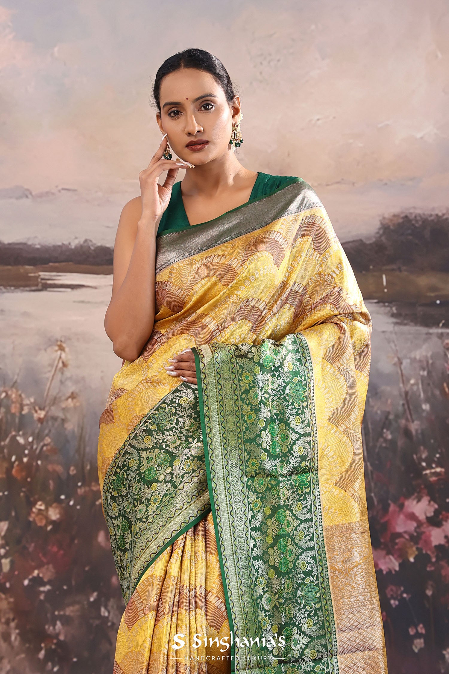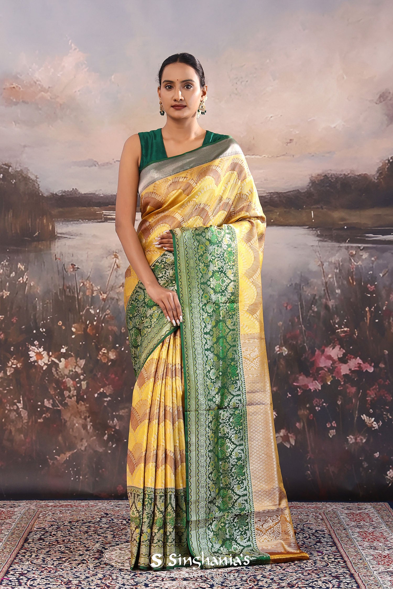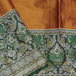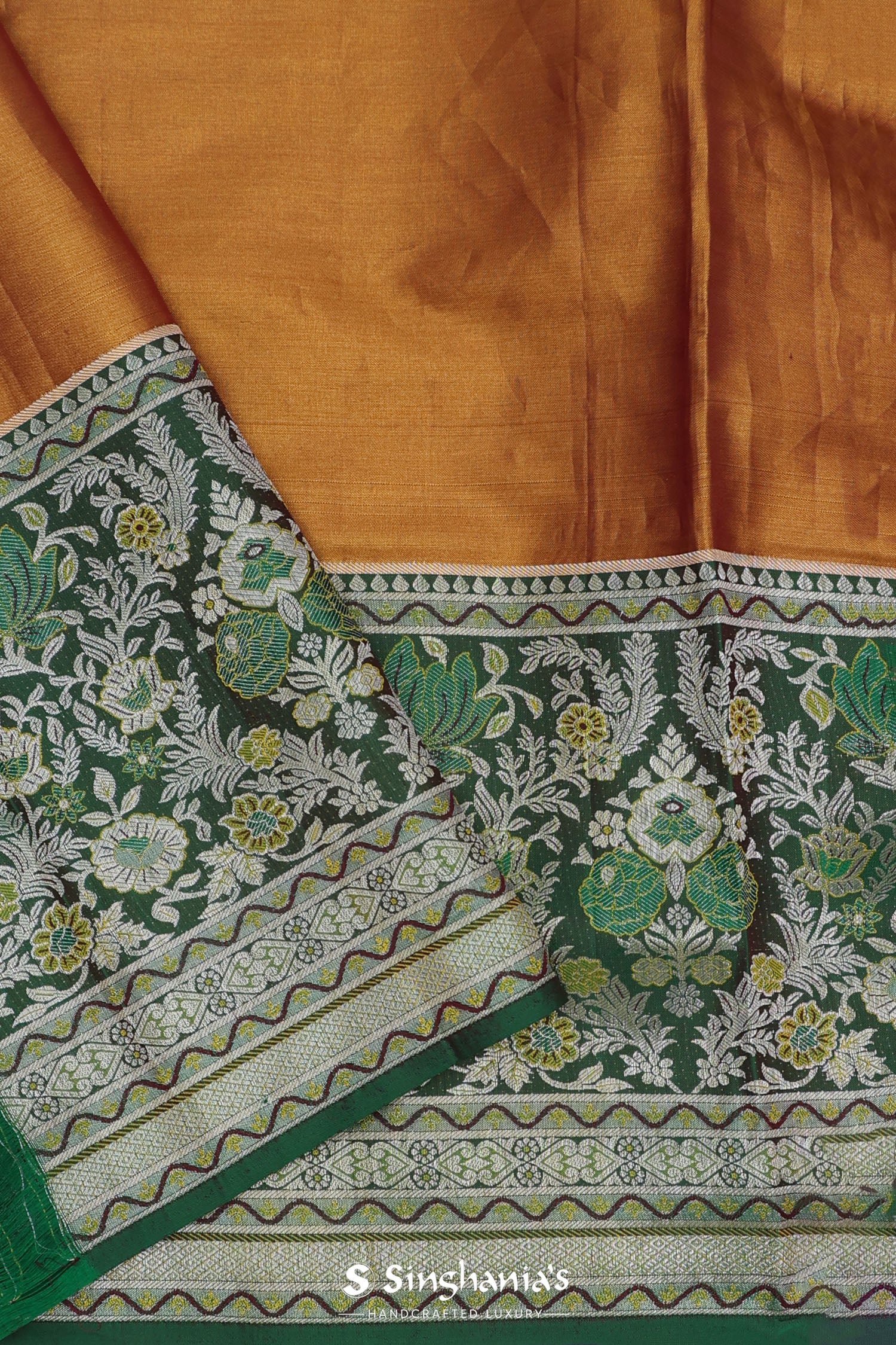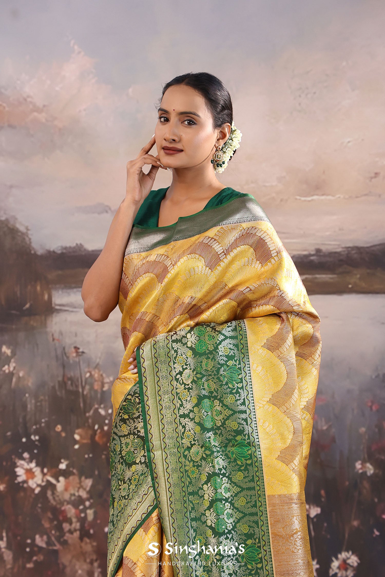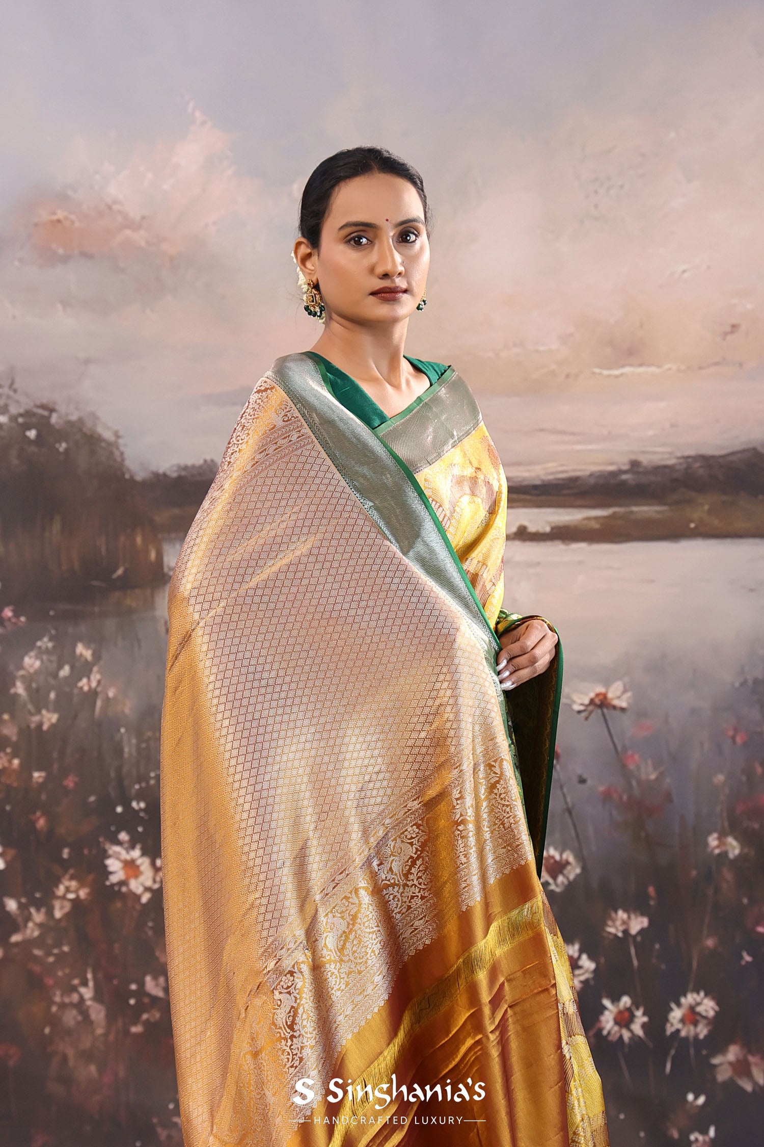 The Old gold yellow kanjivaram tissue saree features floral design woven with silver zari complemented with contrast green border Which is the perfect blend of traditional and contemporary style.
