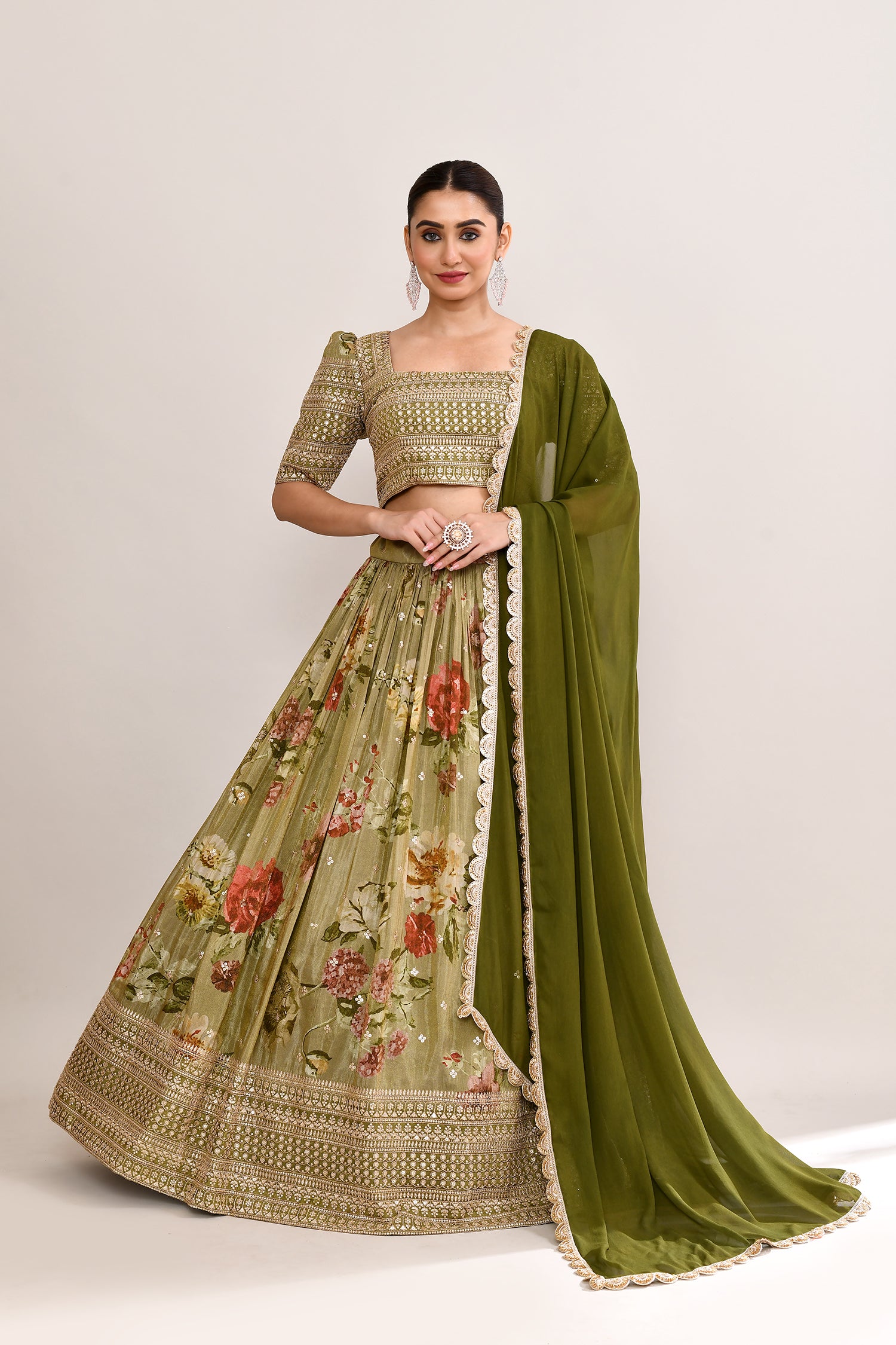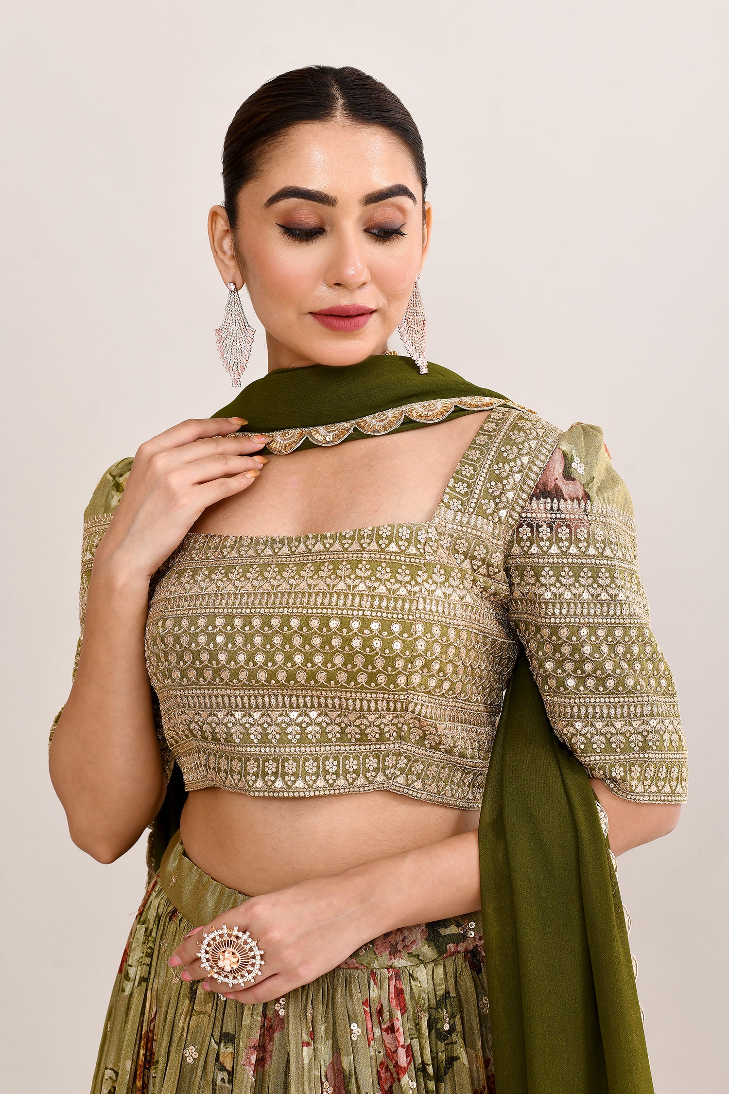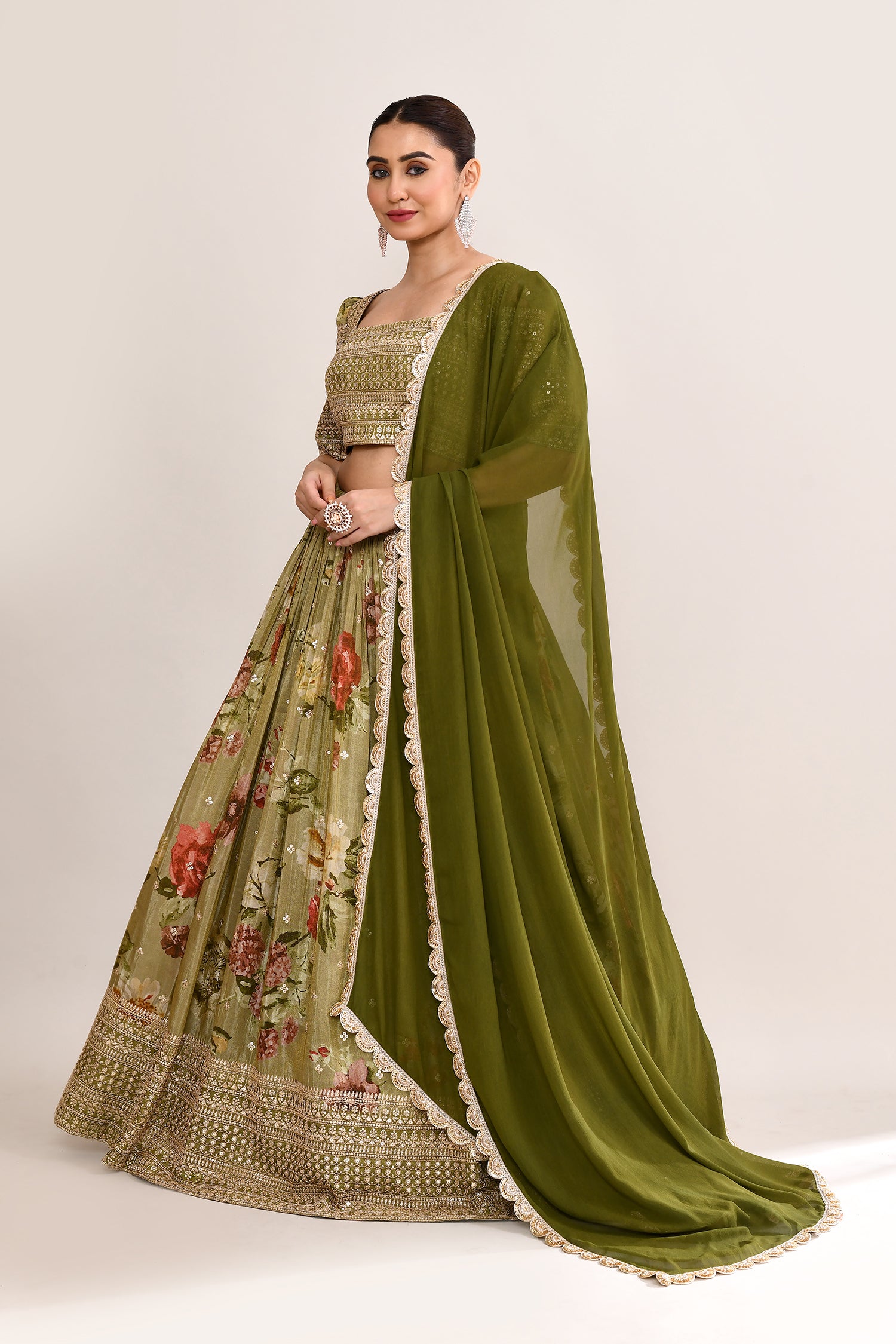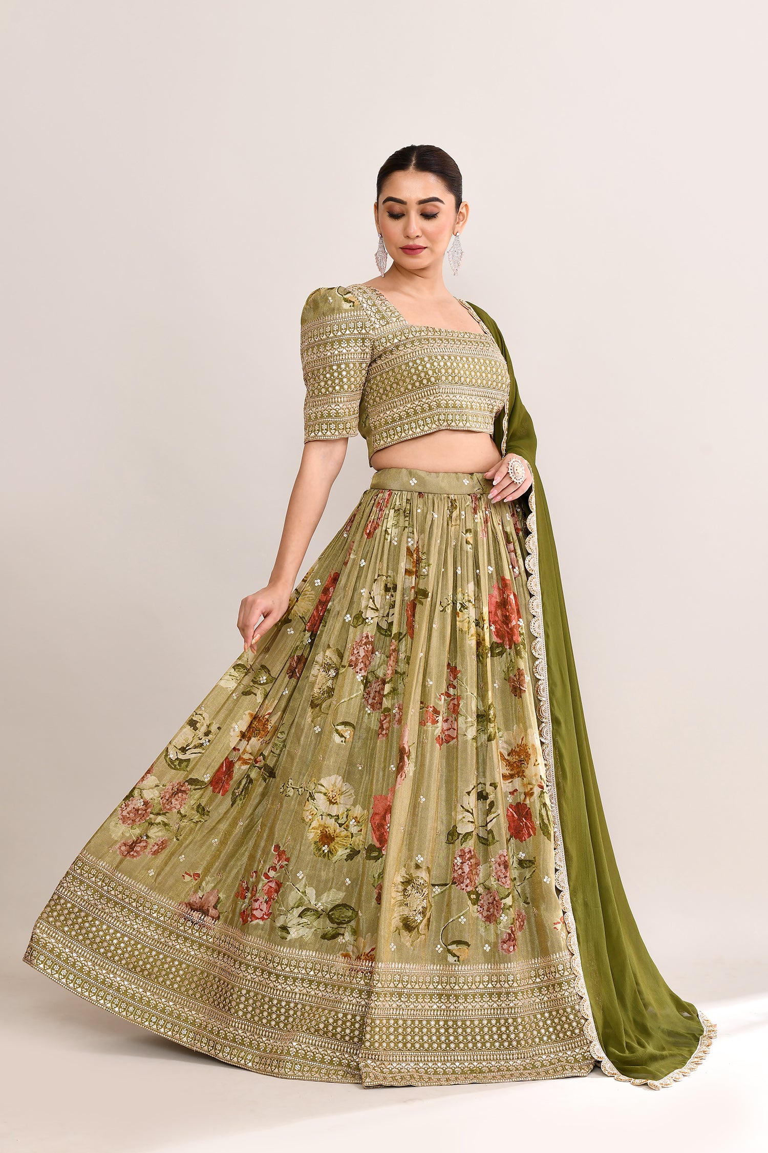 Olive Green Satin Crepe Floral Printed Lehenga Set