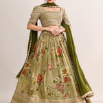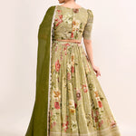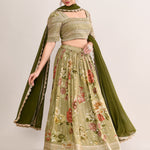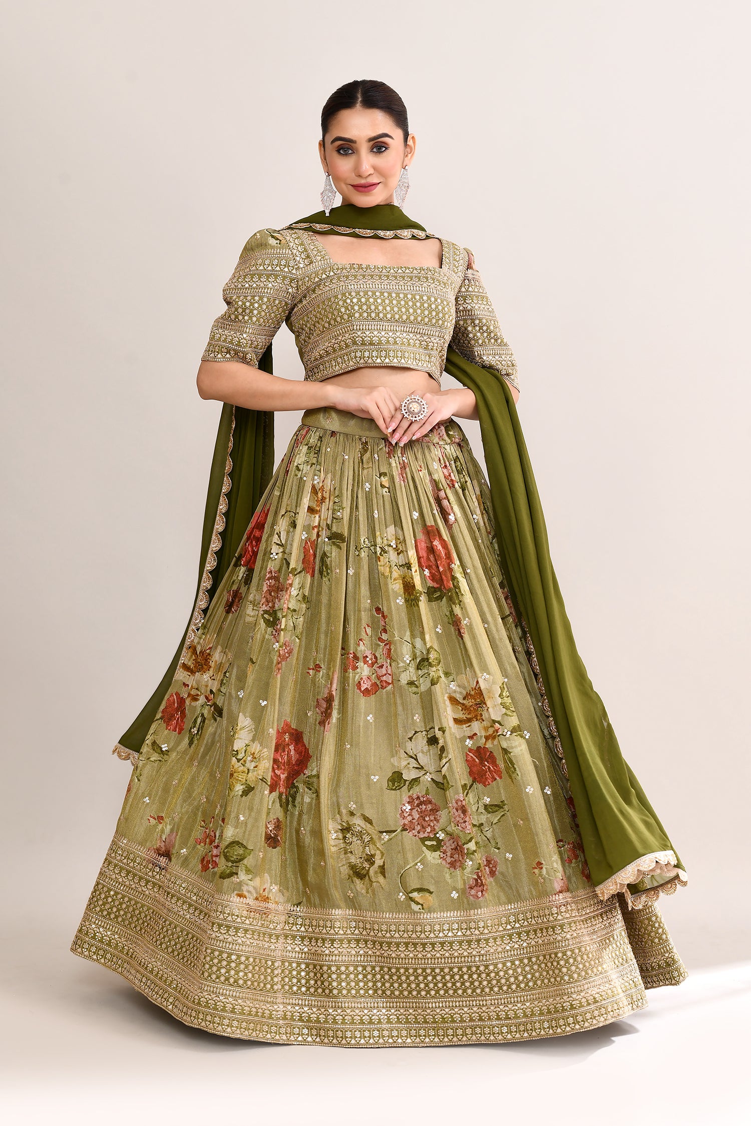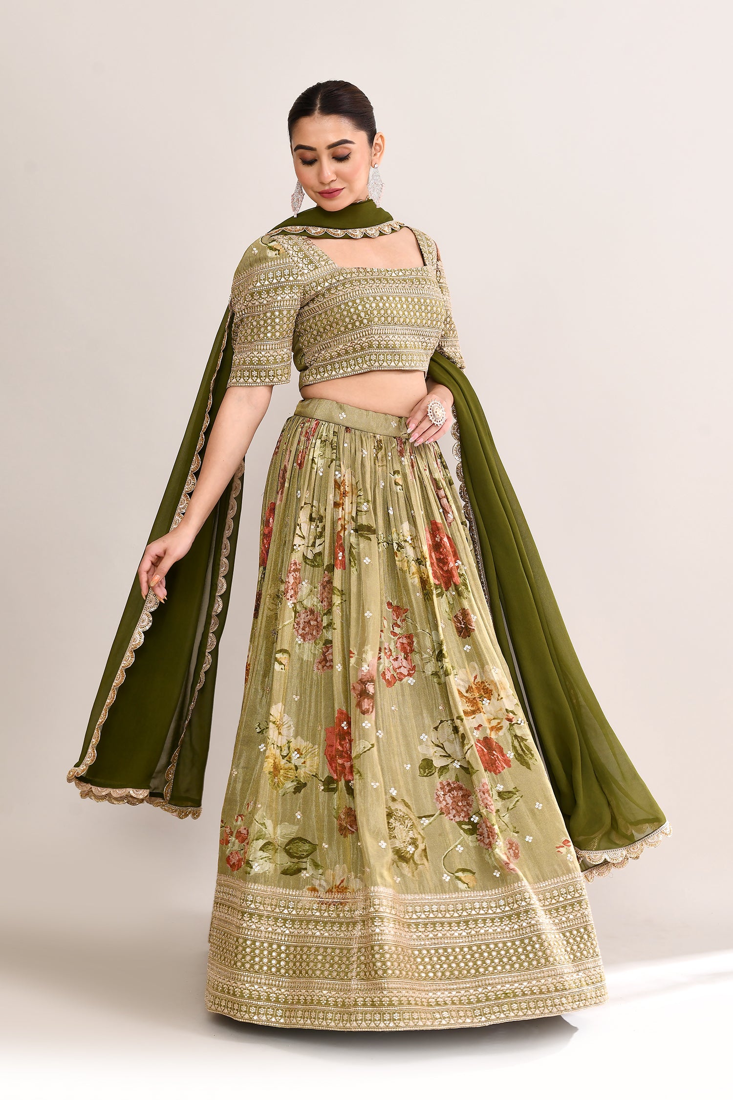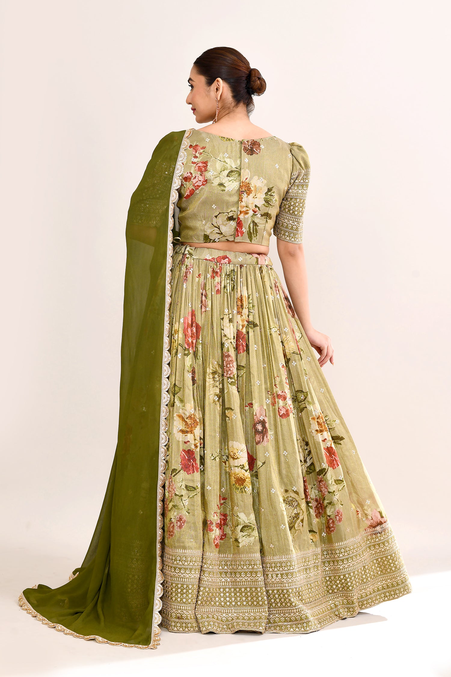 Olive Green Satin Crepe Floral Printed Lehenga Set