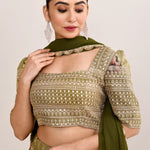 The olive green satin crepe lehenga set with digital print and subtle zardosi work and a georgette dupatta for a decent dignified look.