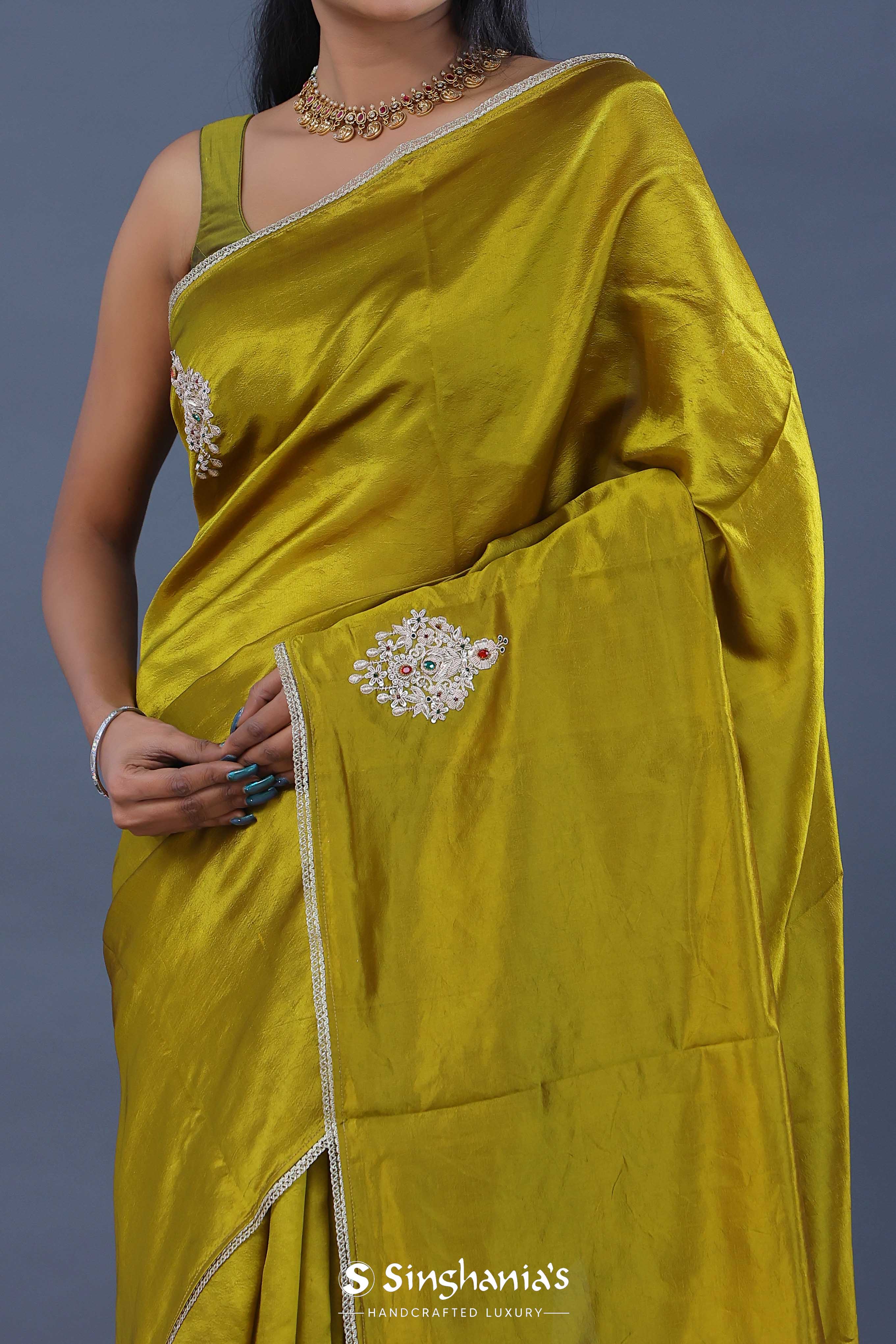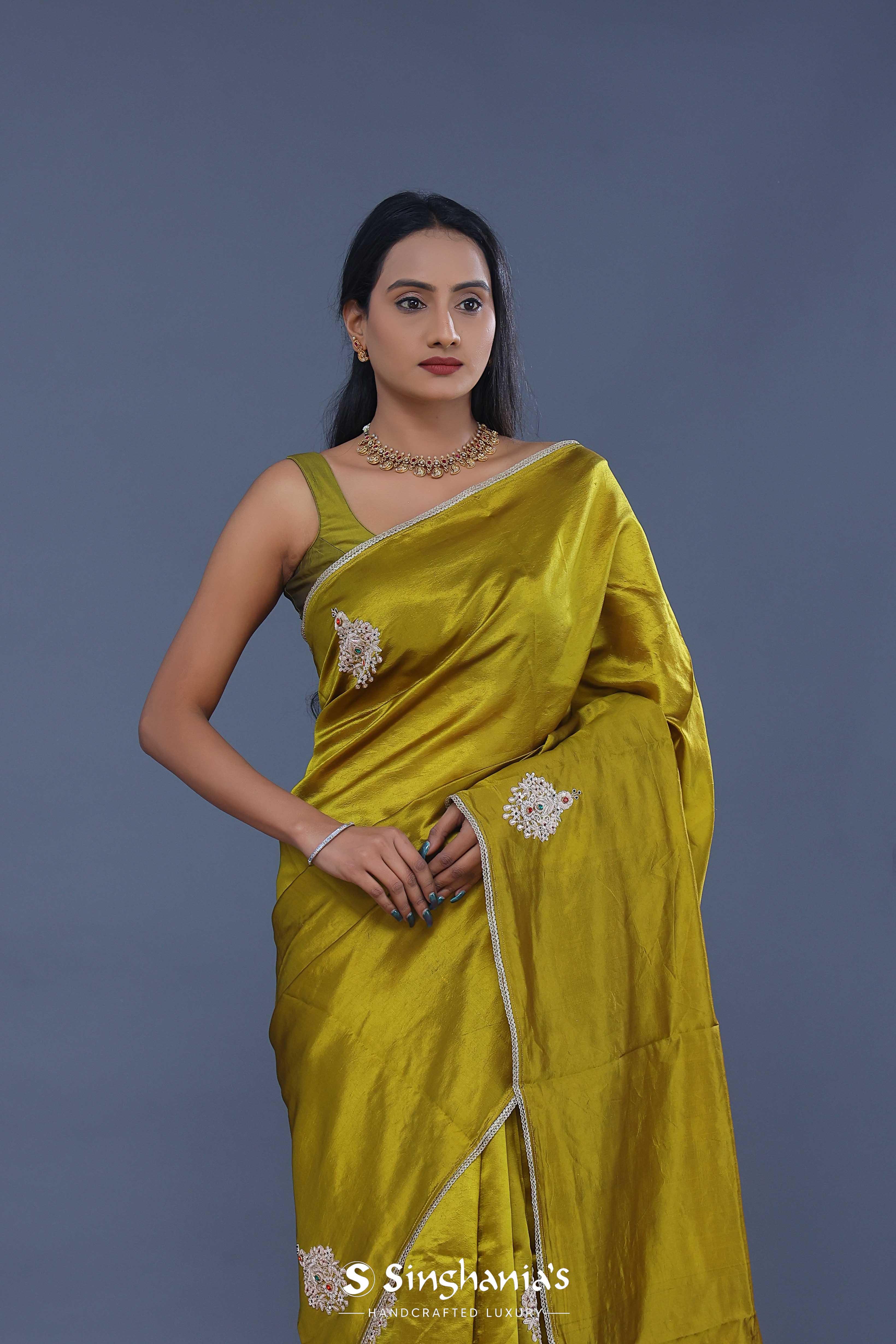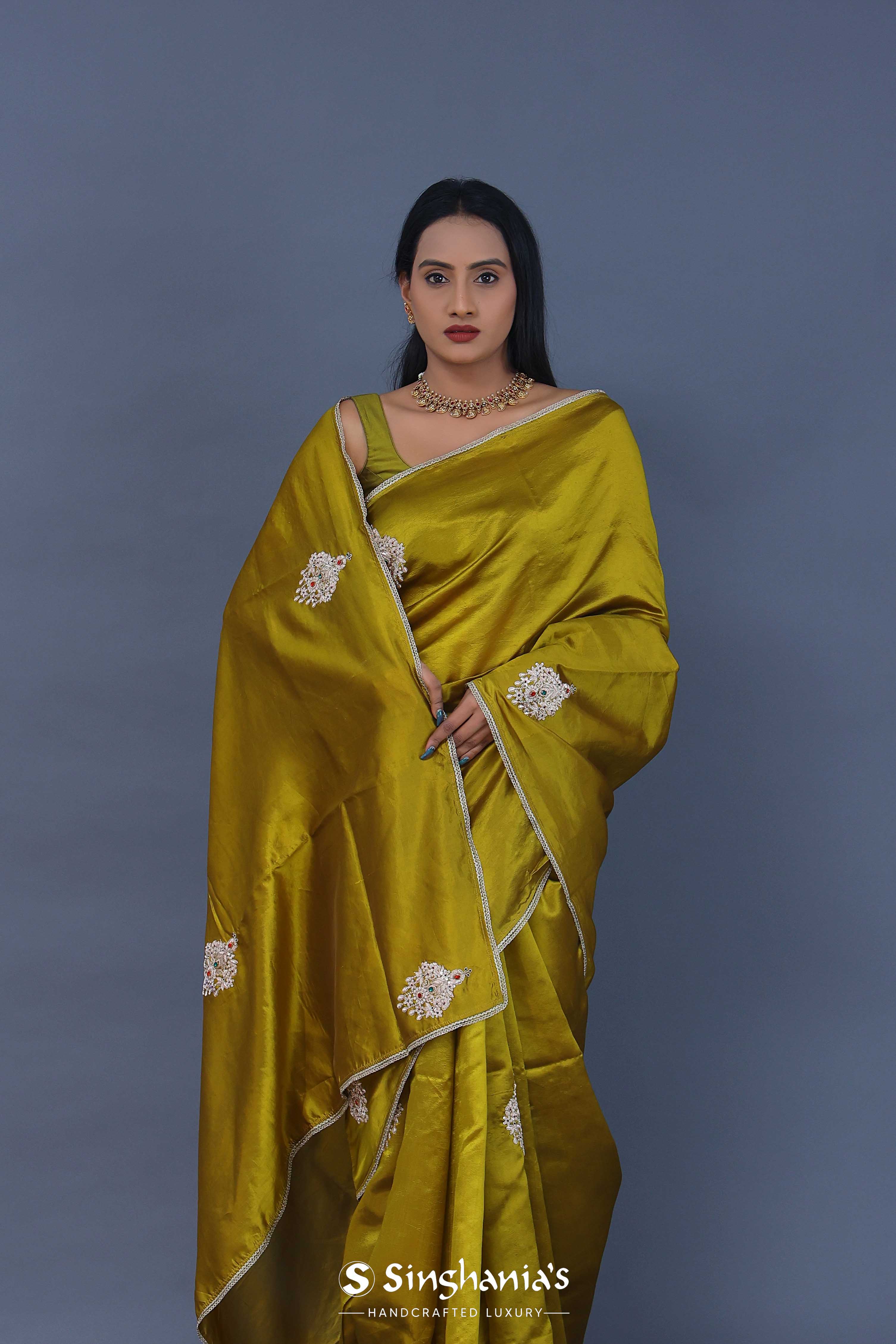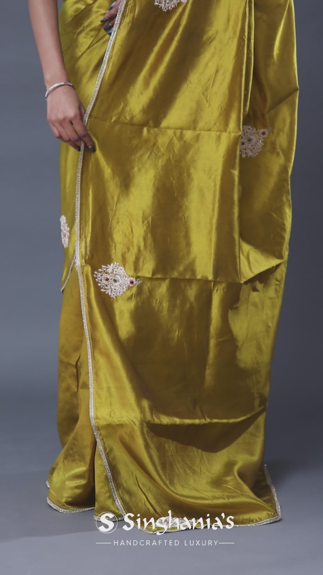 Olive yellow satin crepe plain saree embellished with butta's formed by zardosi work, green and red gems placed at the centre of the design accompanied with the border which is braided lace with an interlocking pattern.
