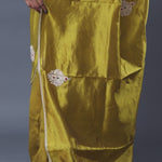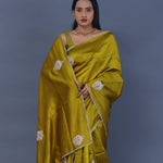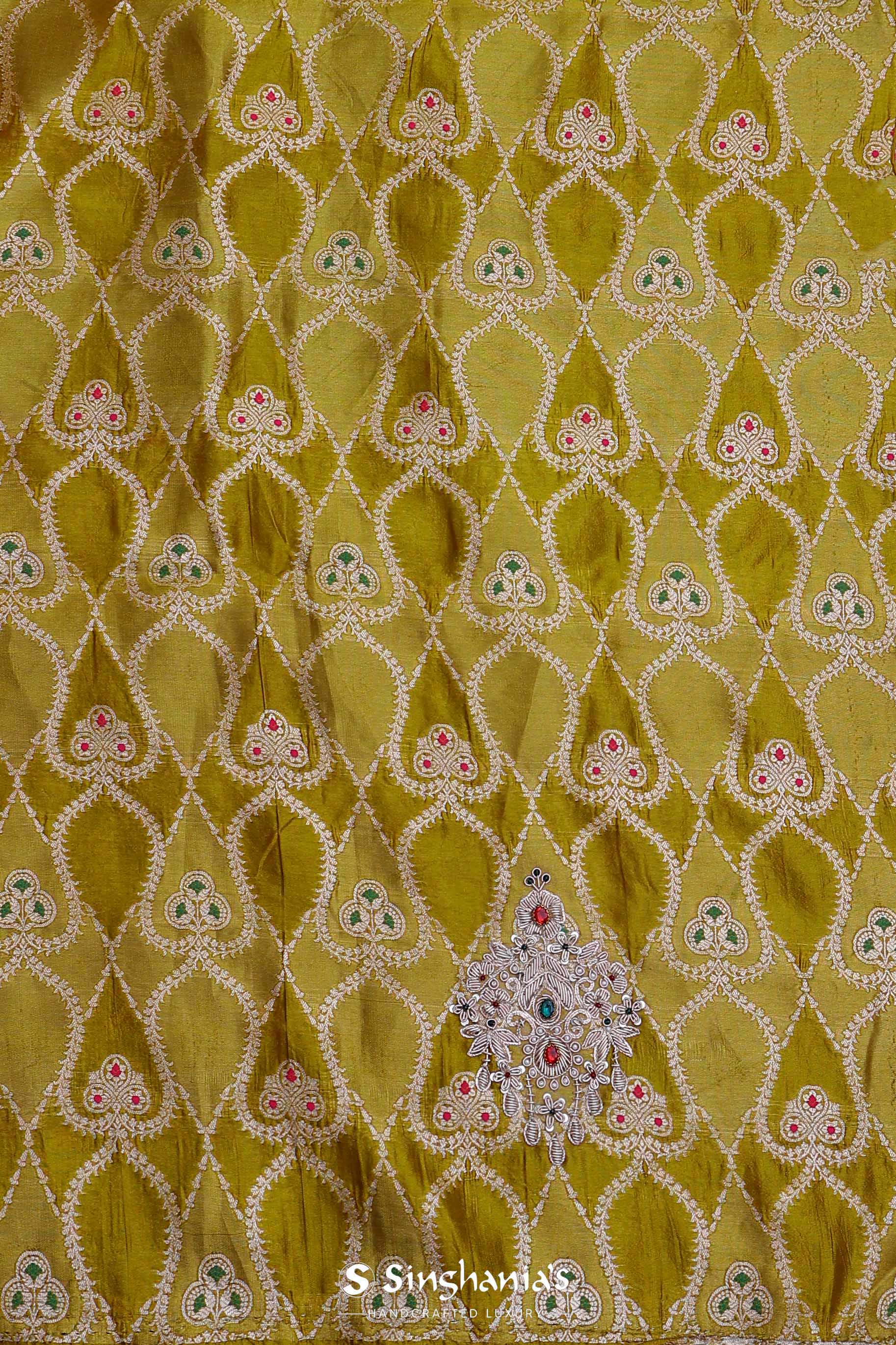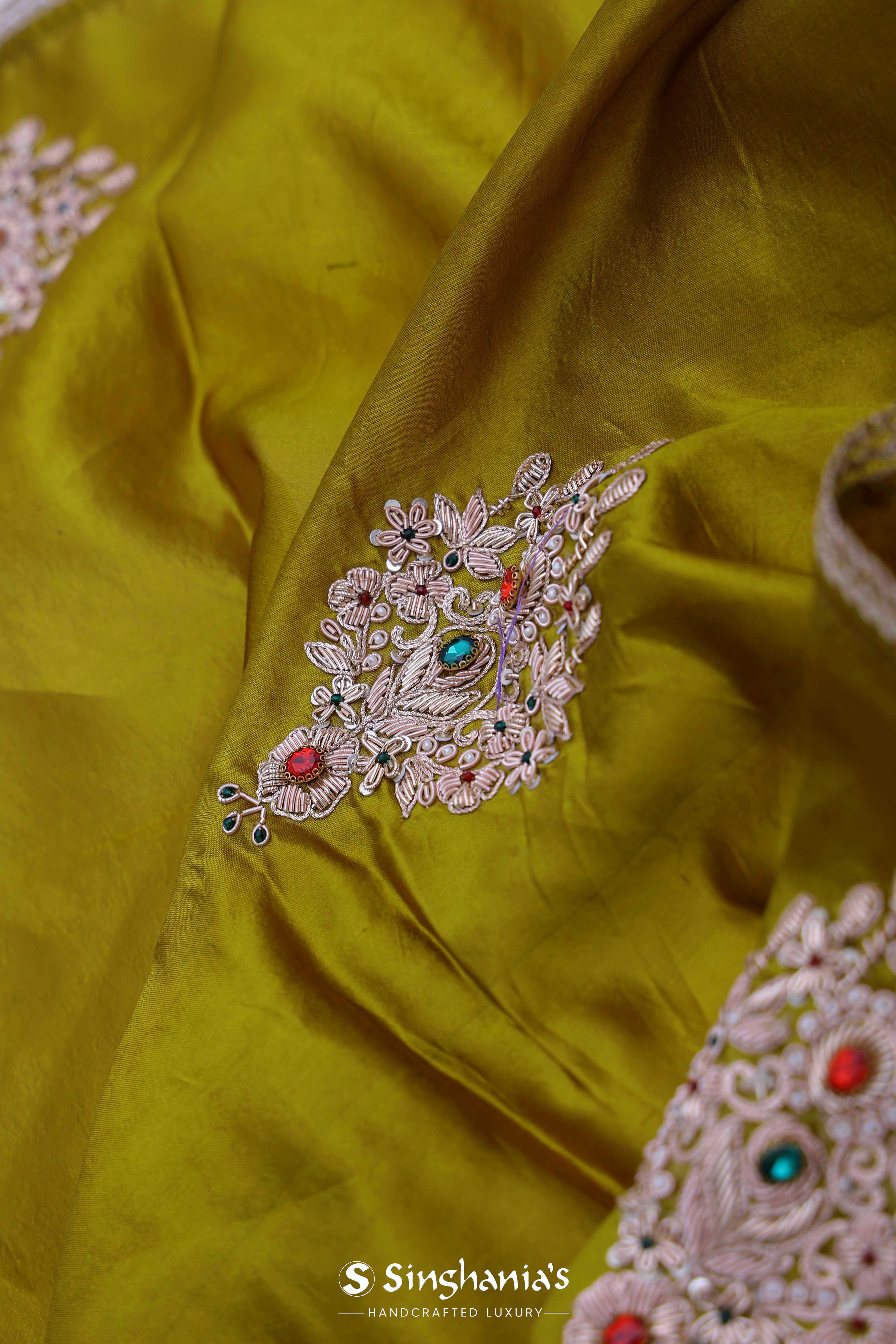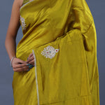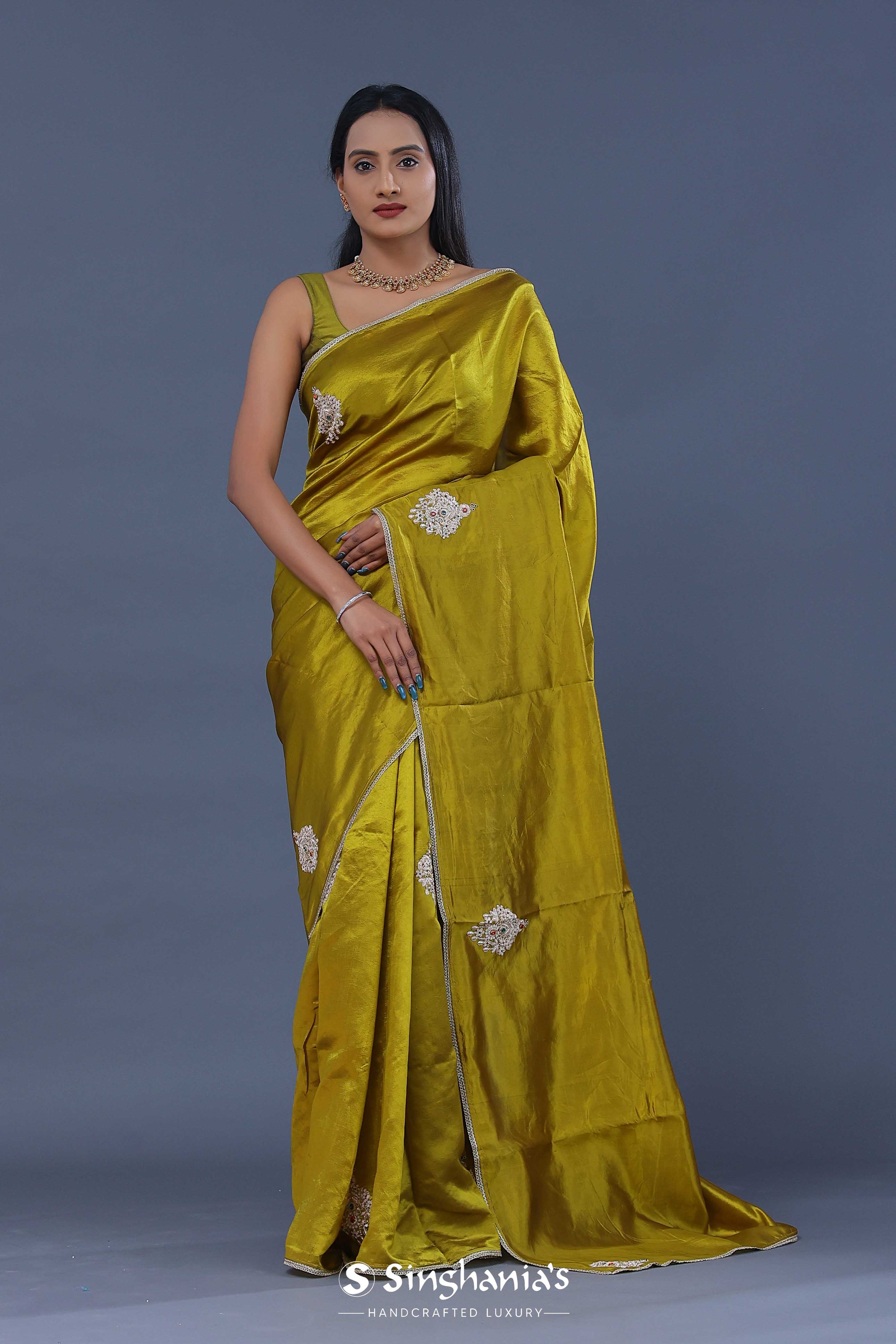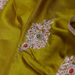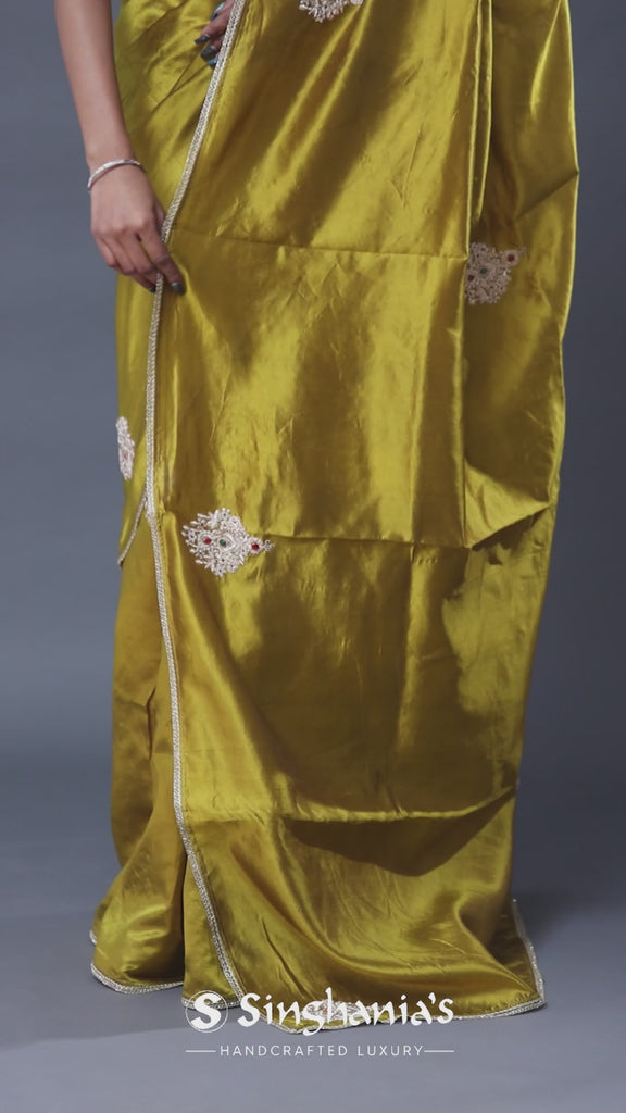 Olive yellow satin crepe plain saree embellished with butta's formed by zardosi work, green and red gems placed at the centre of the design accompanied with the border which is braided lace with an interlocking pattern.