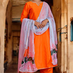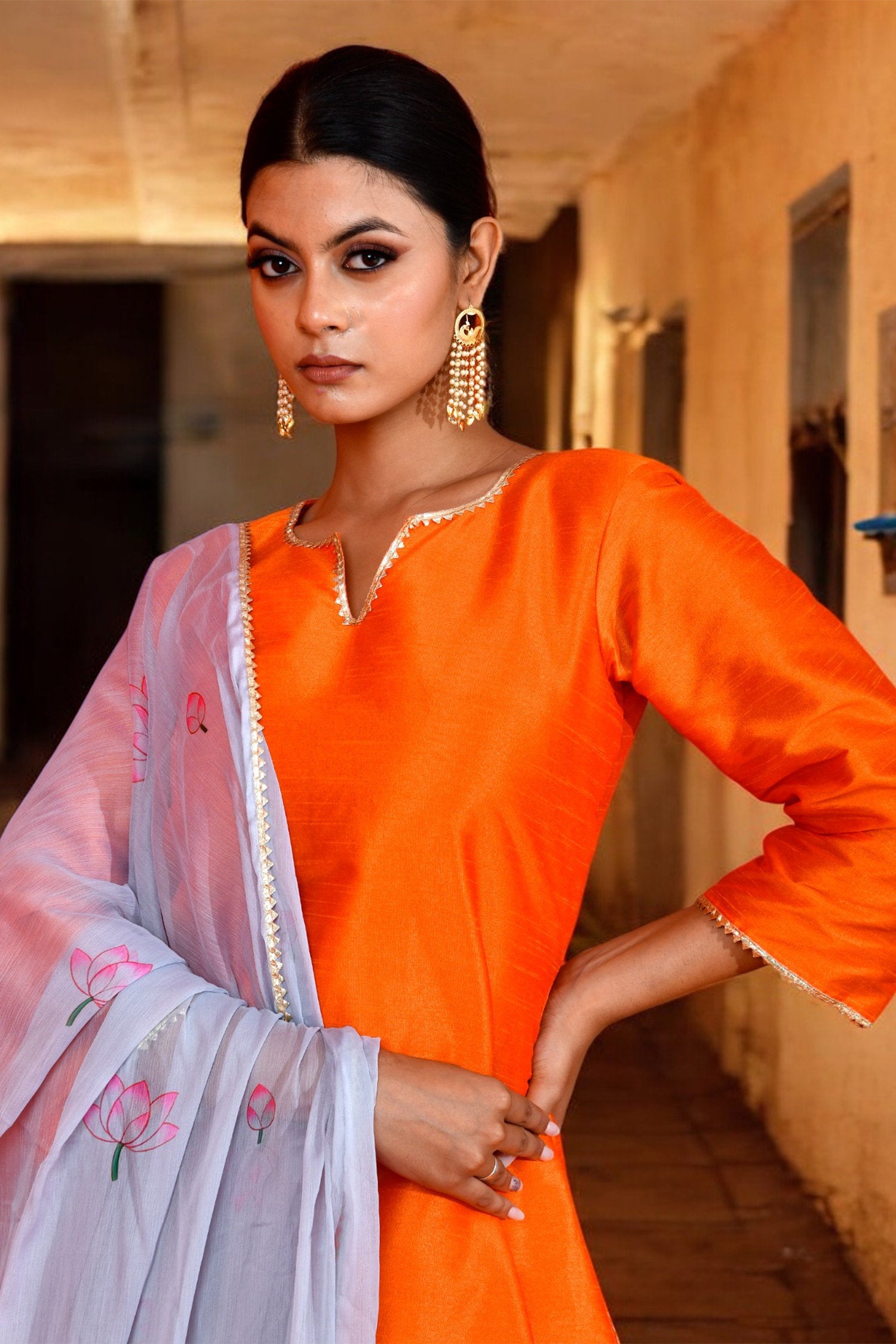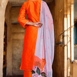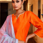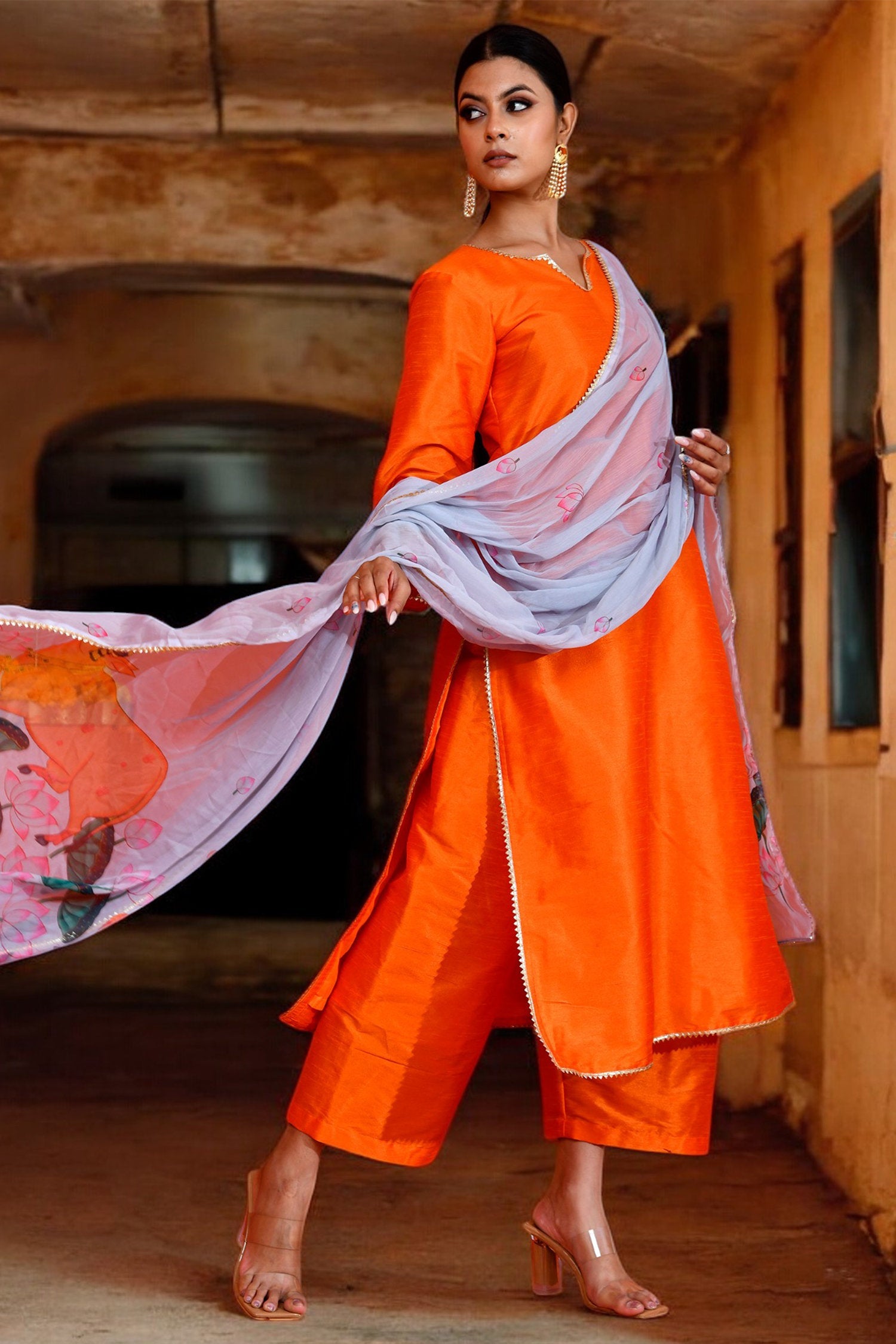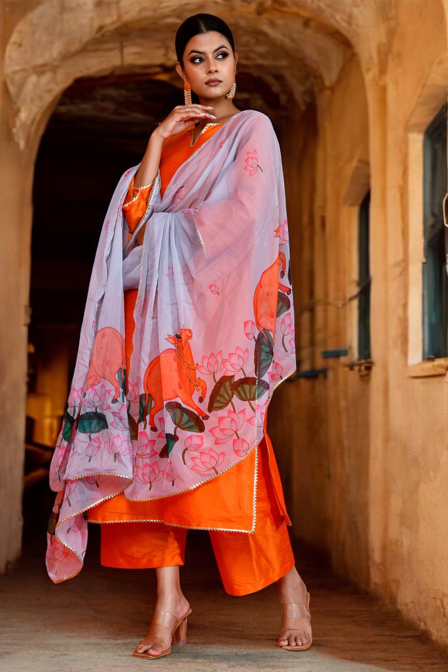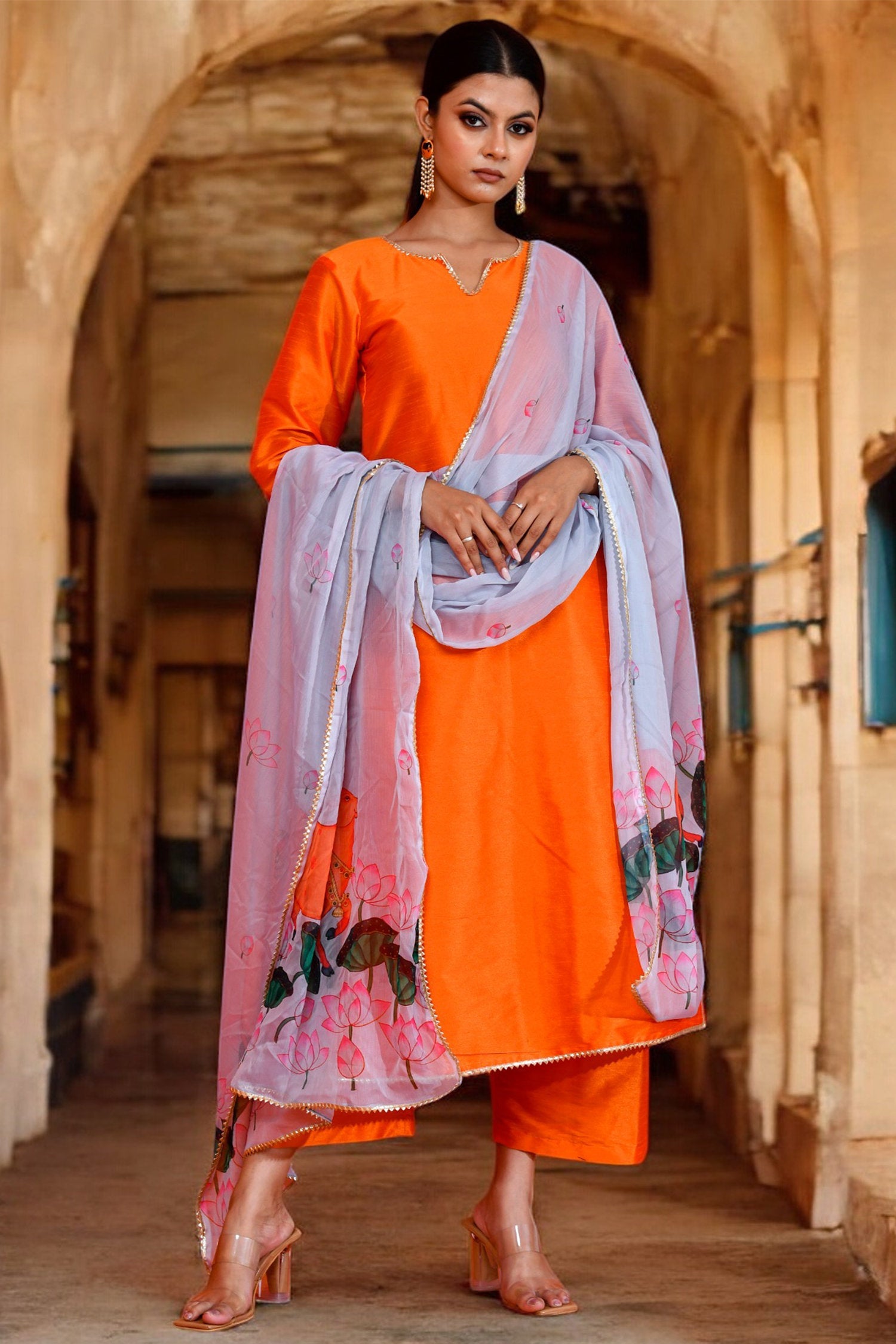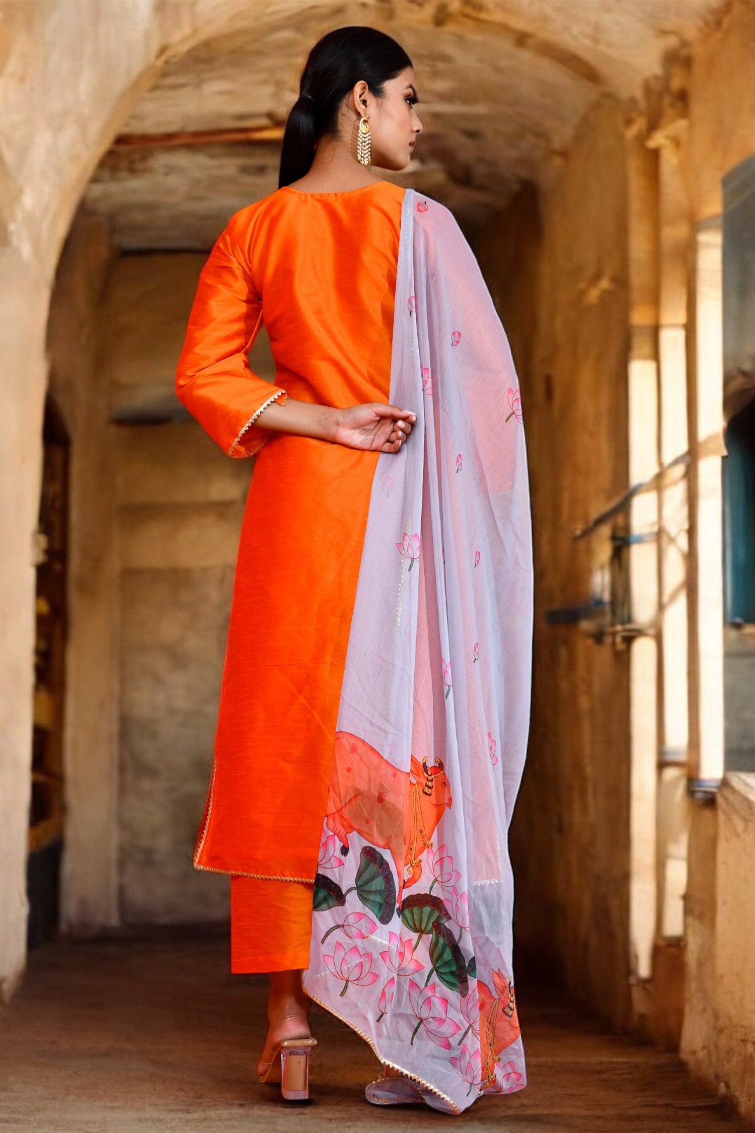 Orange dupion silk kurta set features V neckline and sleeves paired with matching pants. The grey dupatta adorned with pichwai and lotus prints making it look unique and classy for formal and informal events