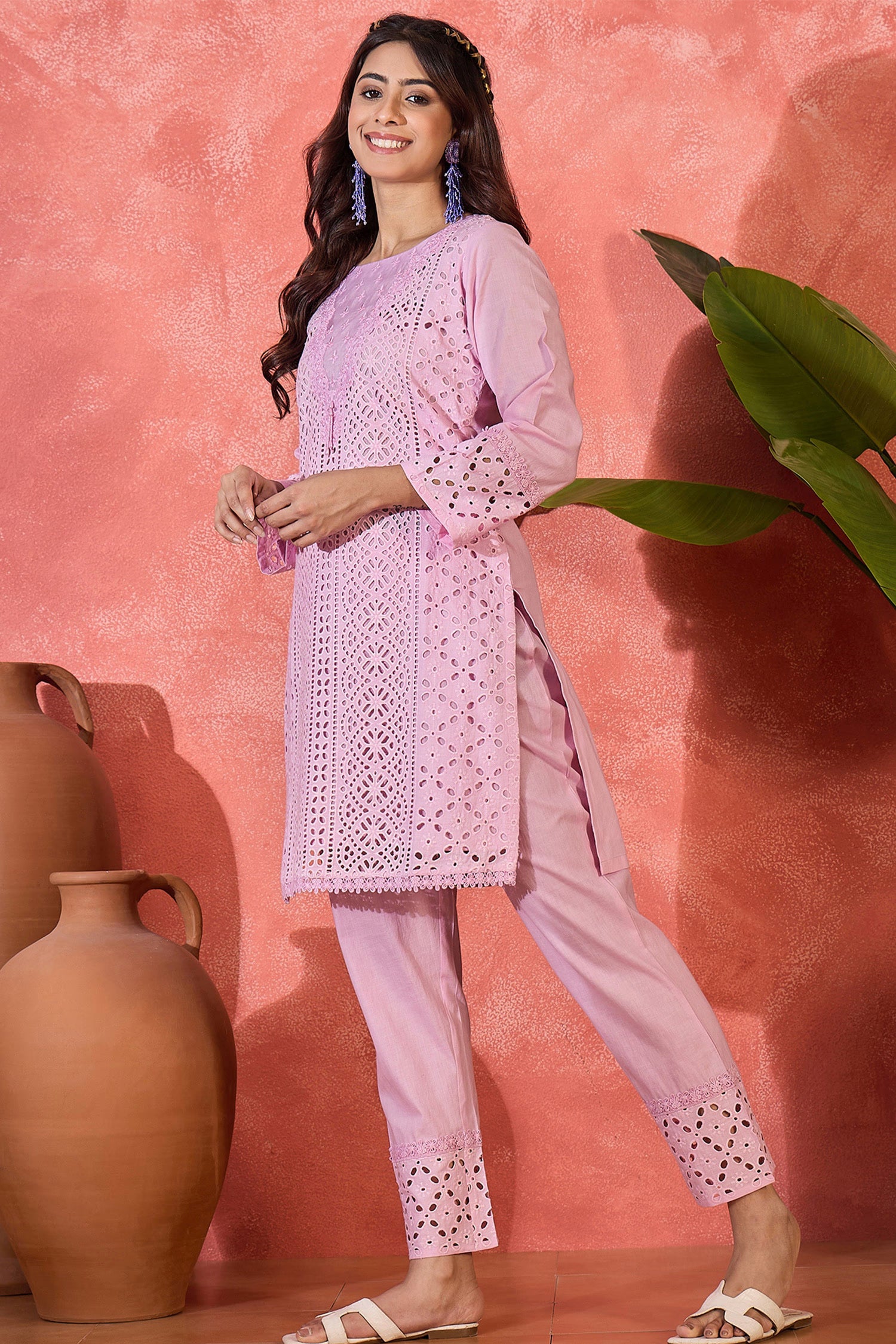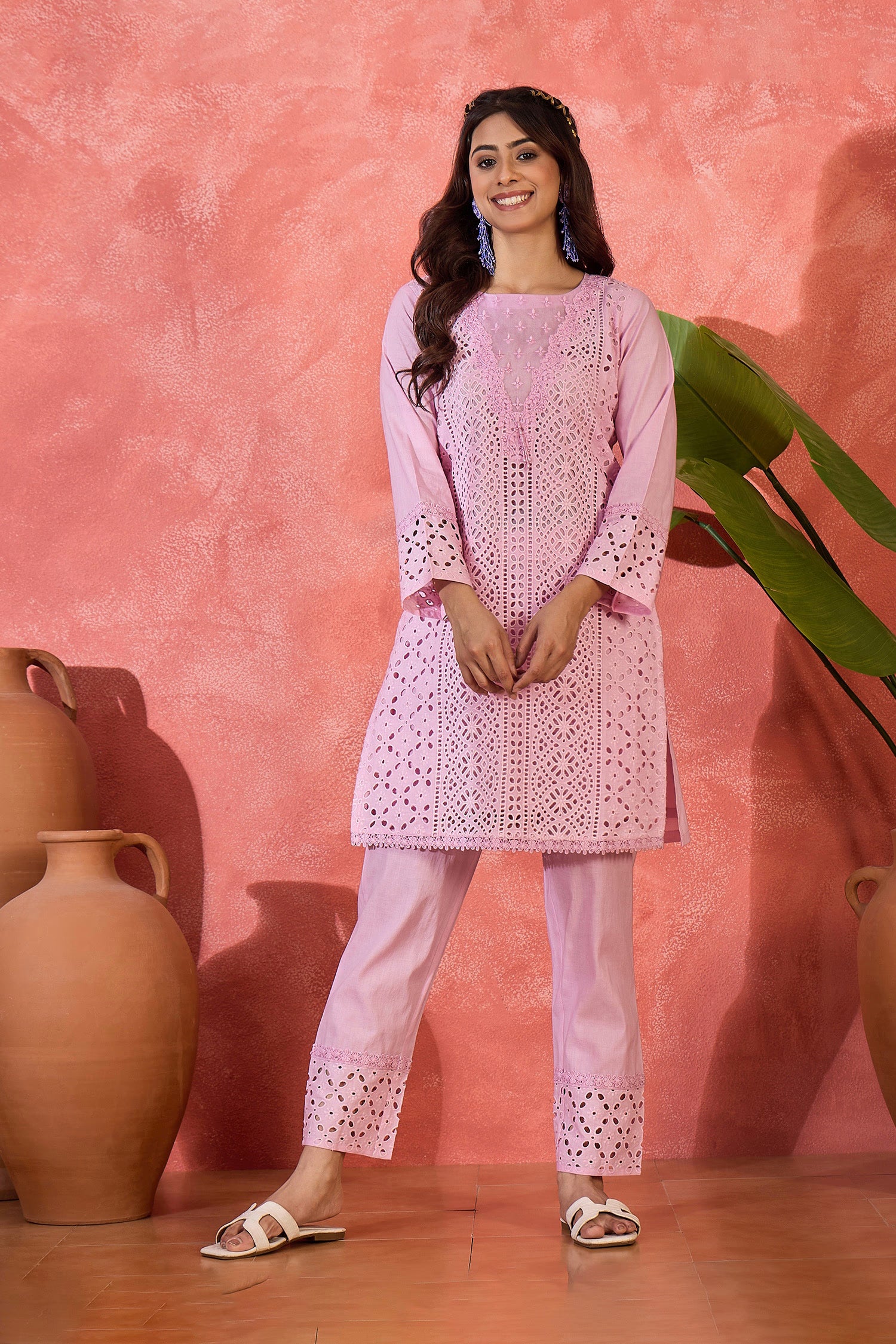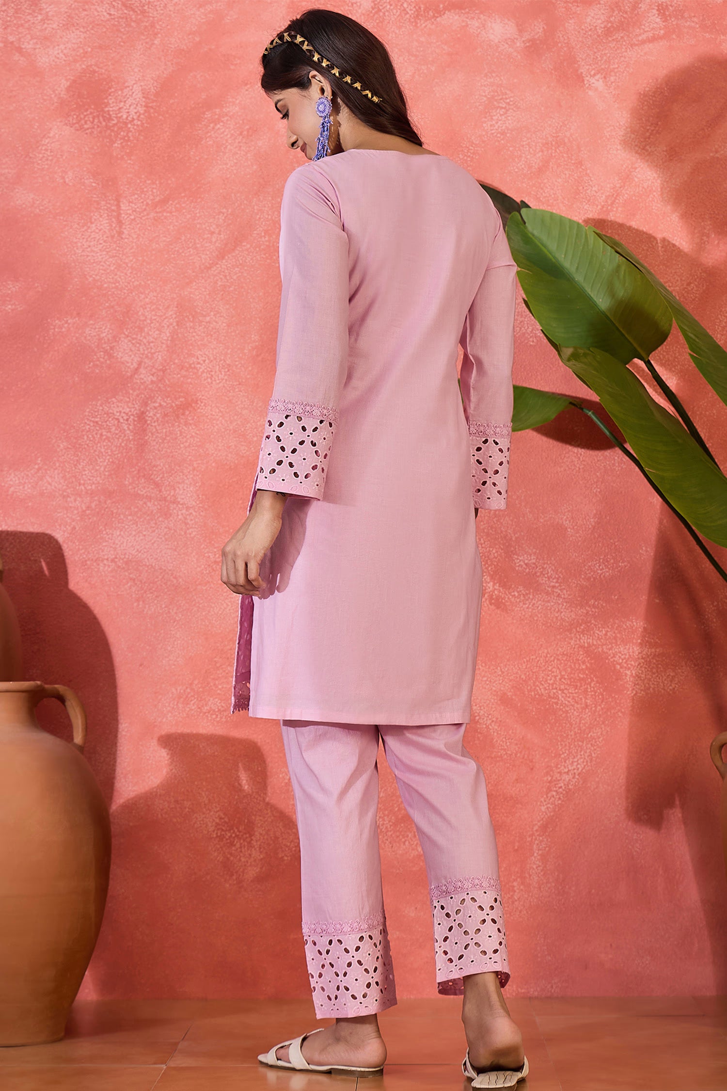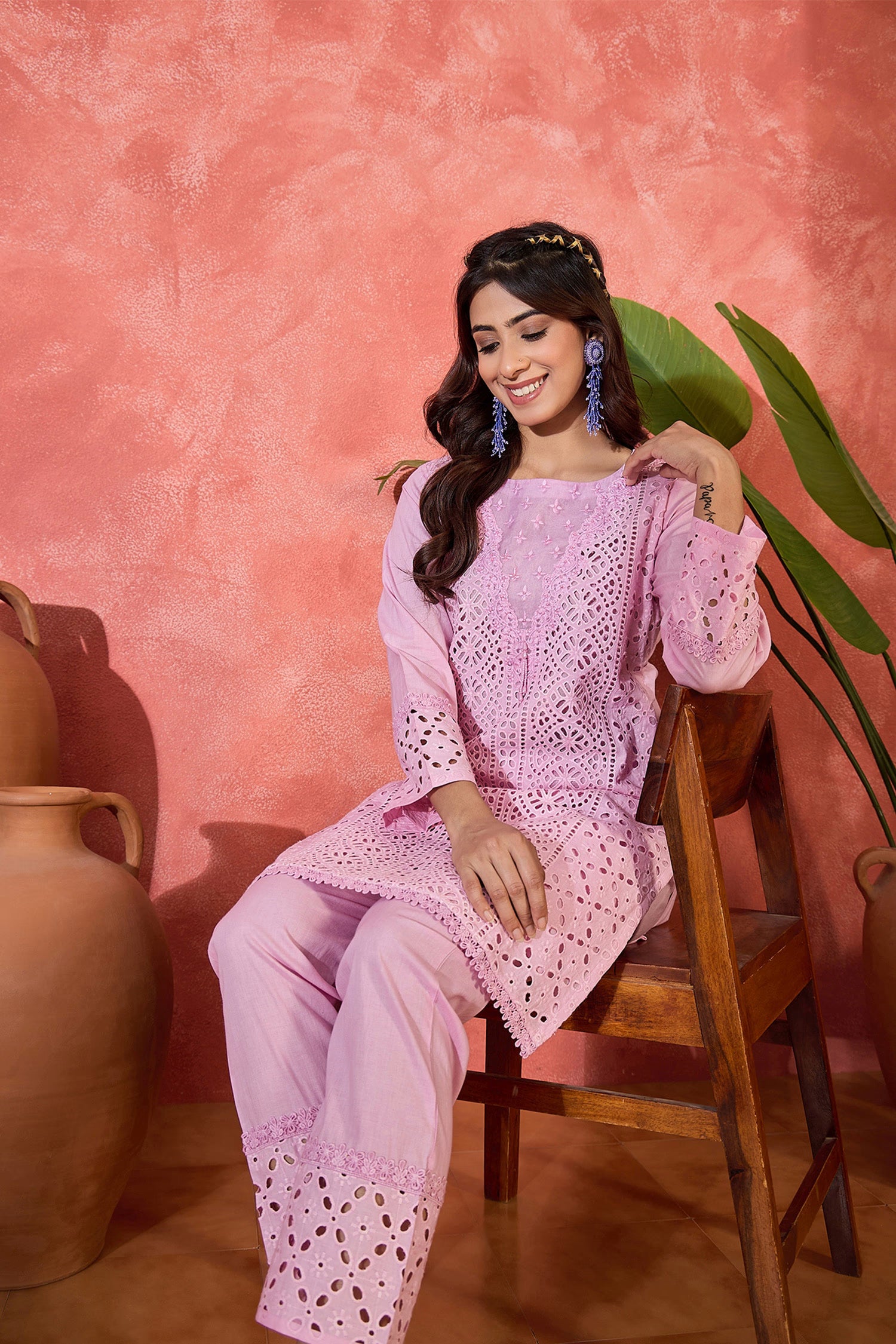 The orchid pink cotton hakoba and thread work short kurta with floral design and matching pant that blends ethnic look with the modern fashion.