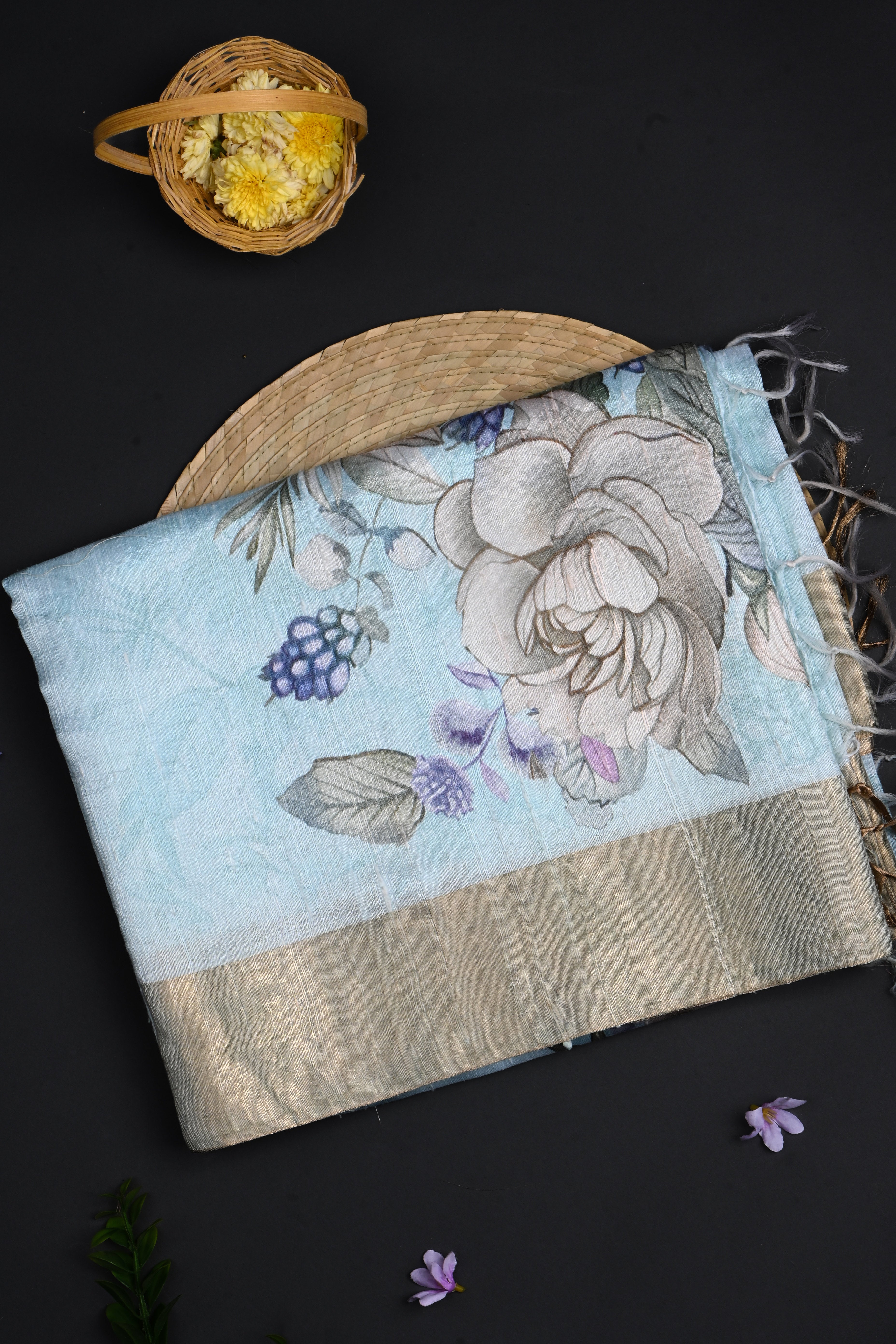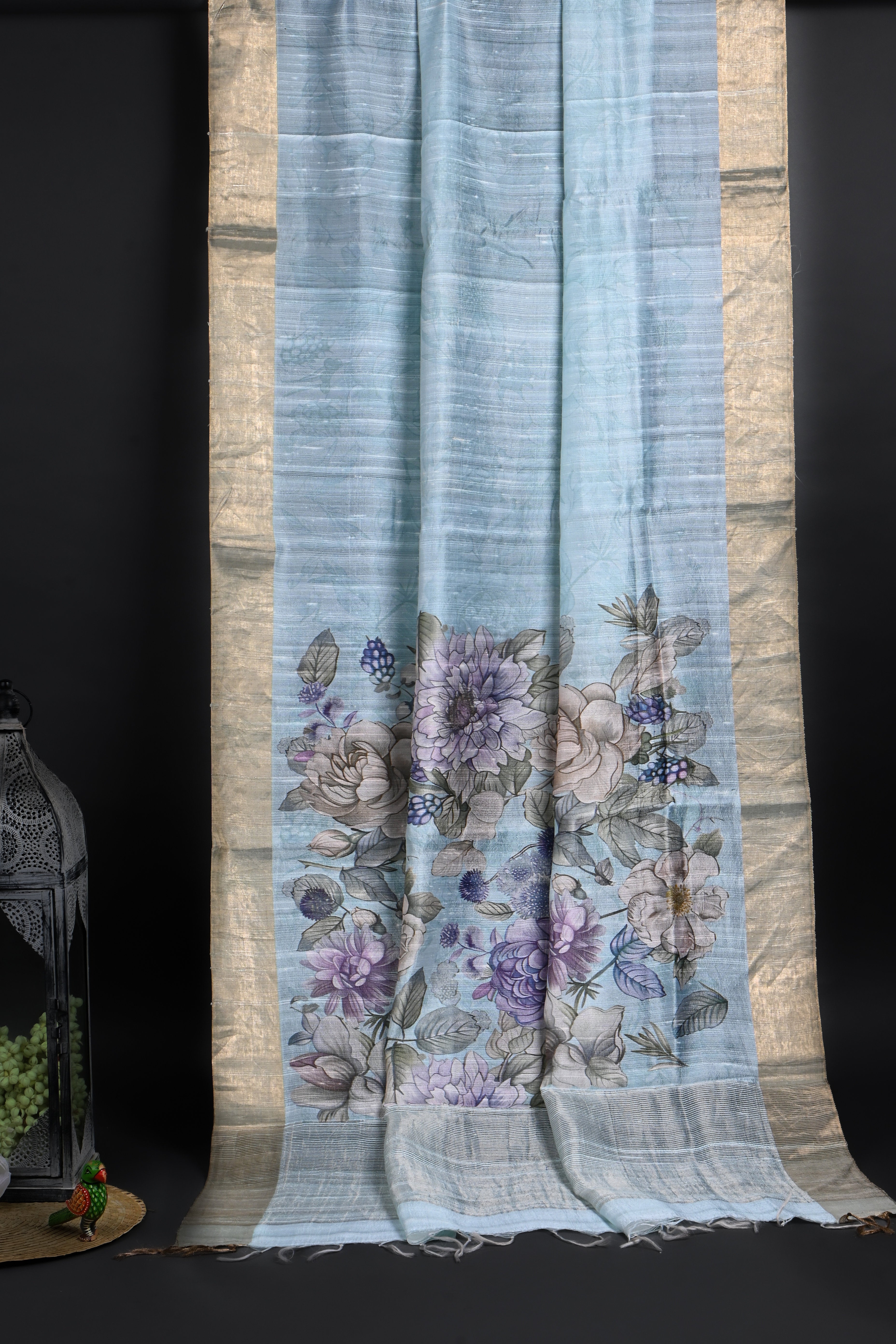 The pale blue floral printed dupion silk saree with golden zari border along with a matching blouse for a classy look with grace.