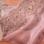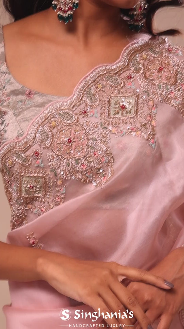 A soothing pale pink saree with an organza base, which features floral jaal embroidered pattern. Added with intricate floral embroidered border, crafted with sequins, zardosi and glass beads. Suitable for festive wear, and evening parties.