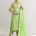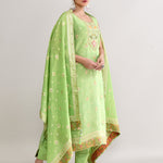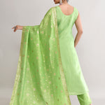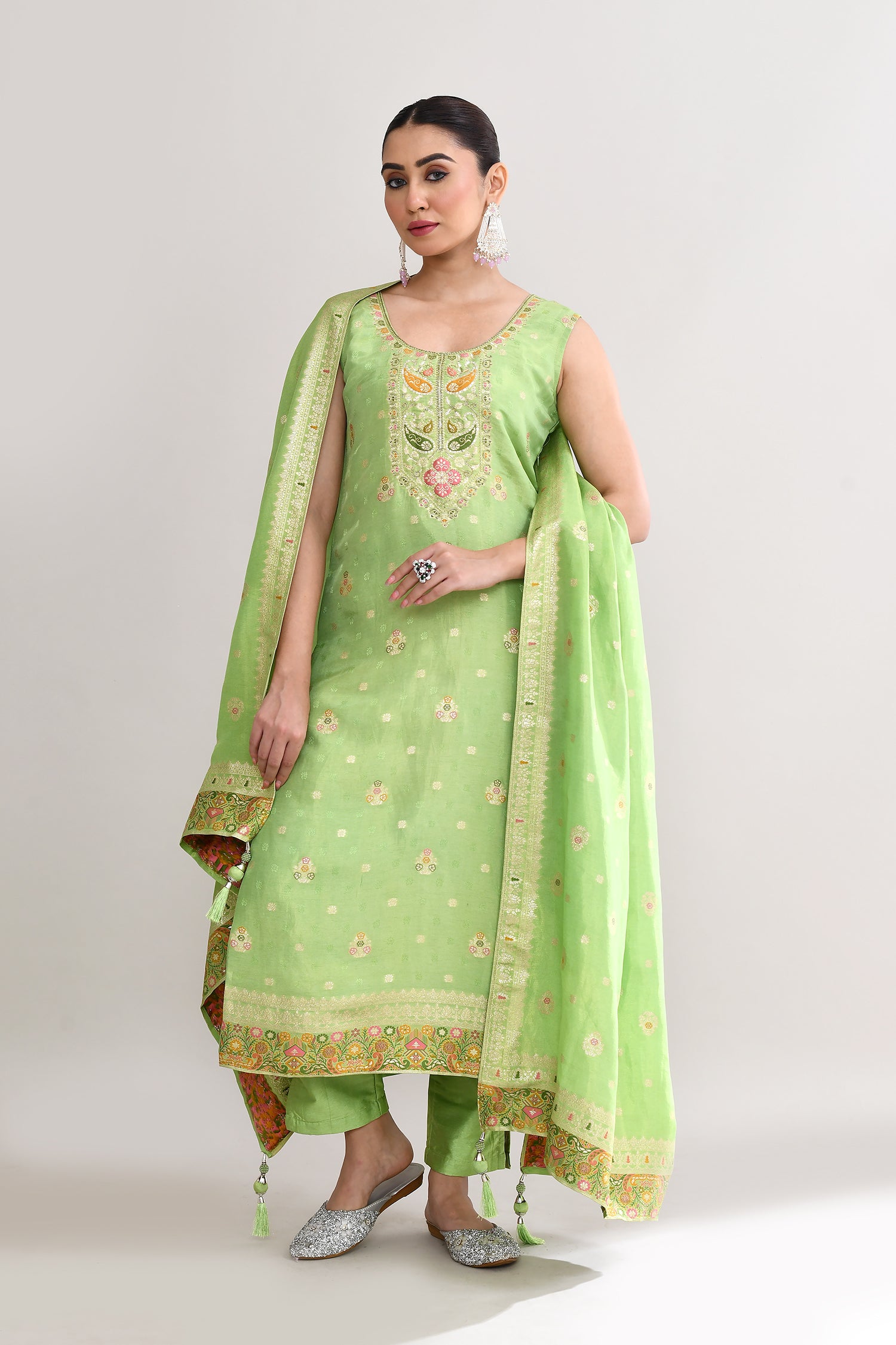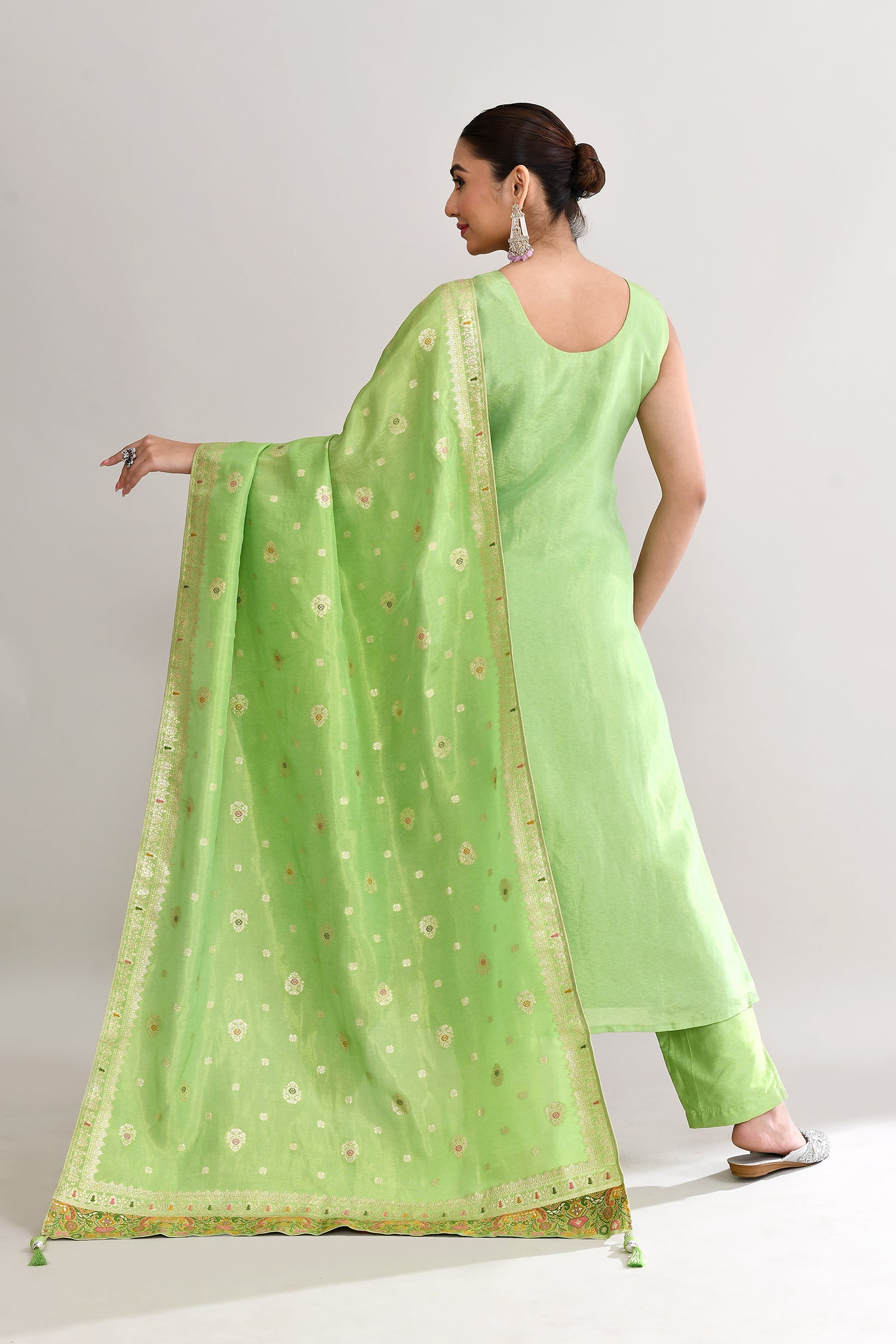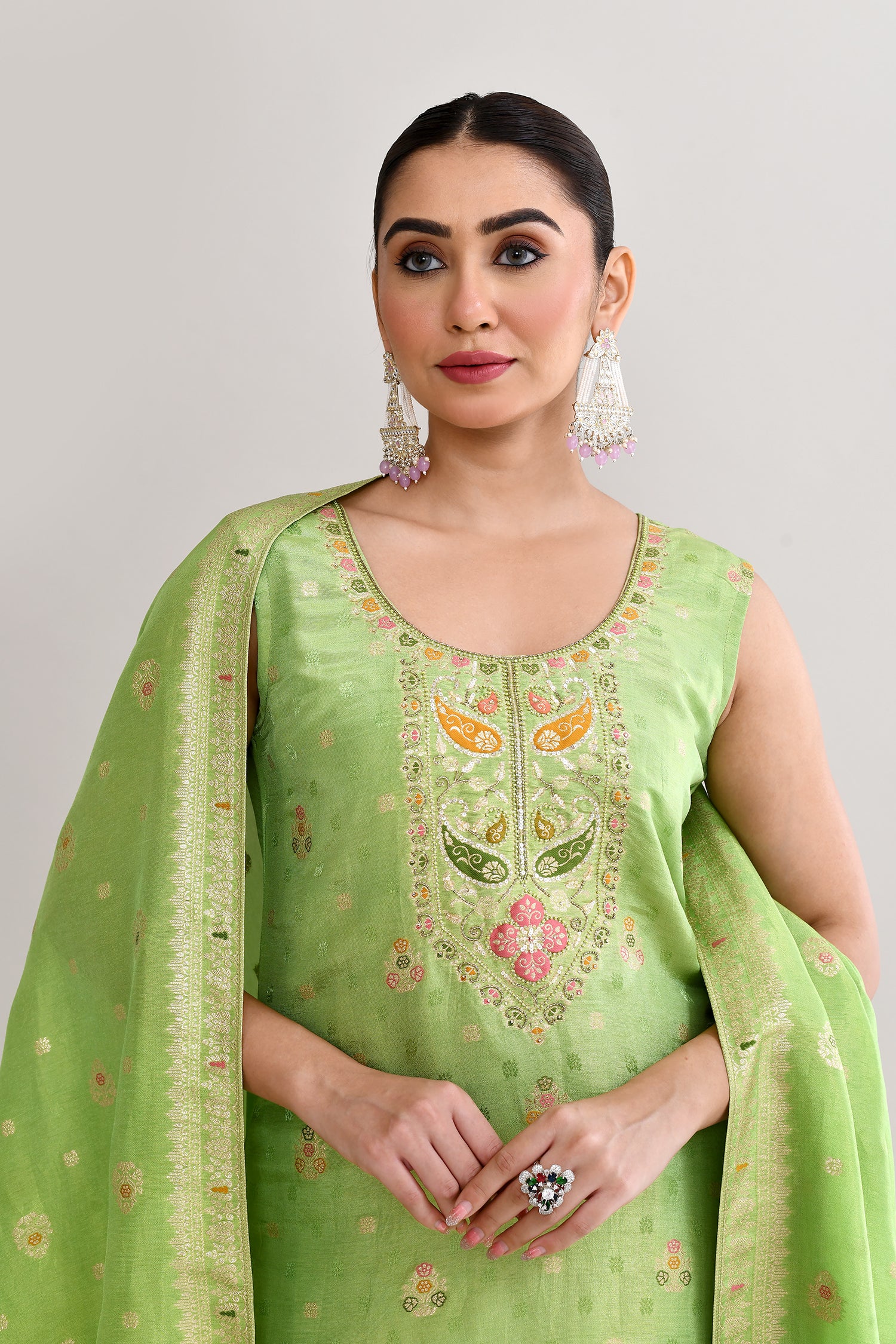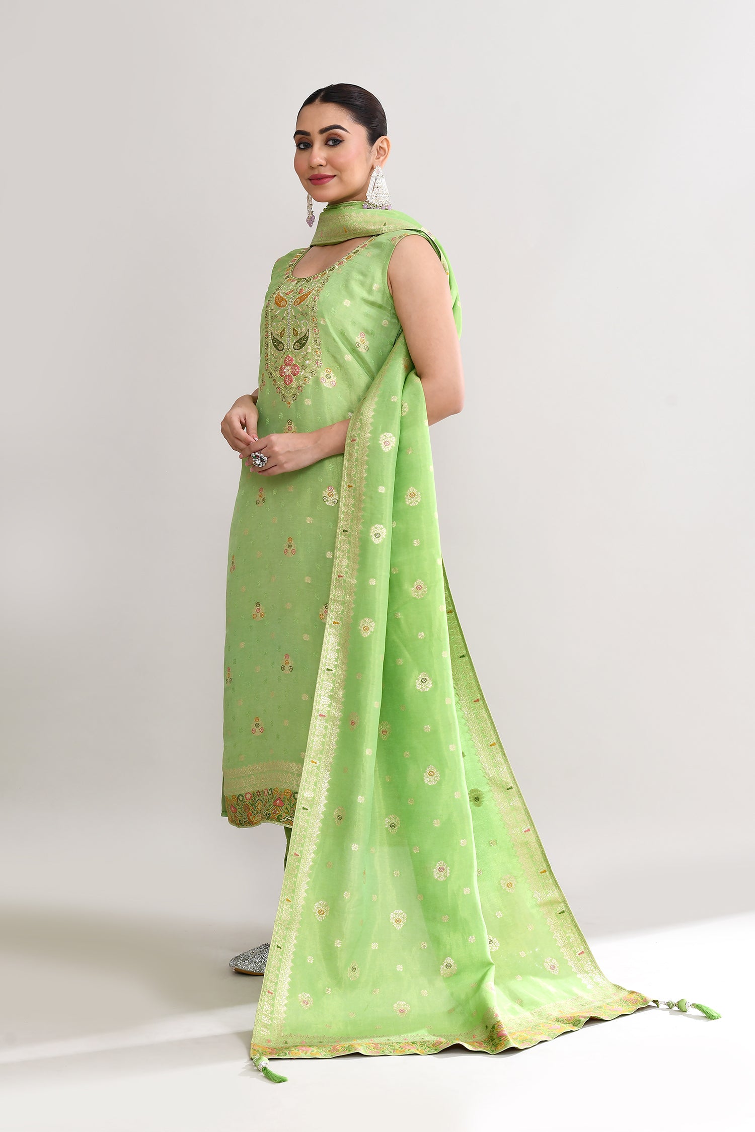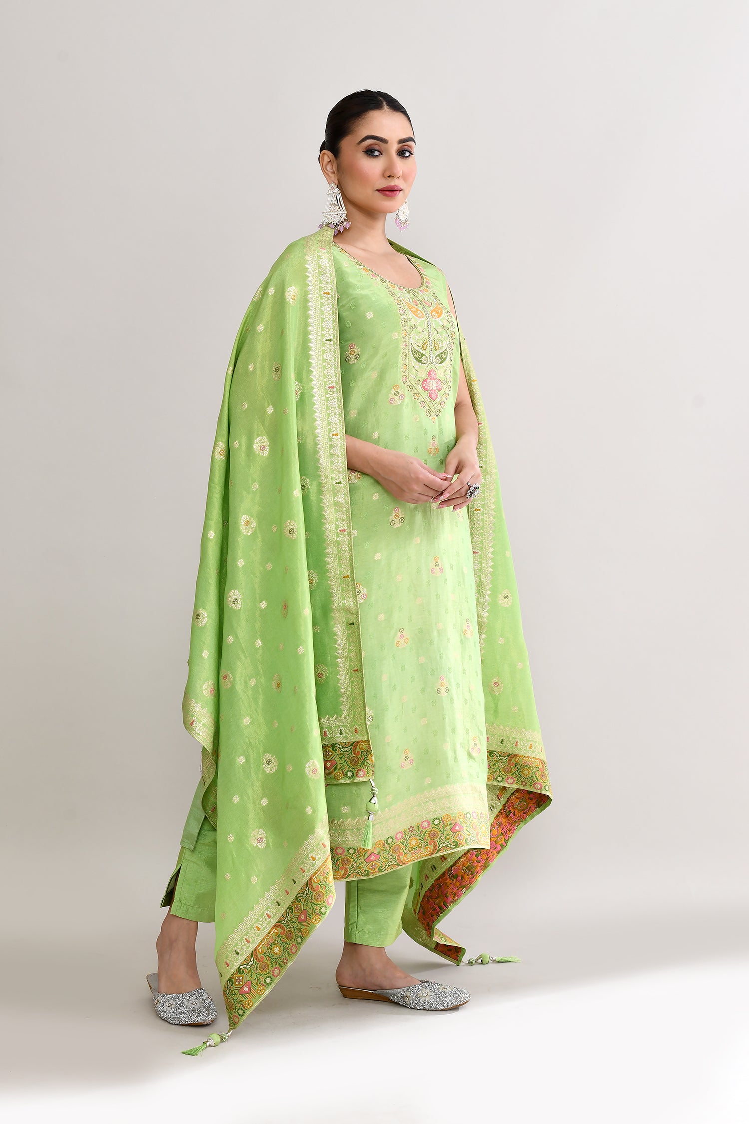 The parrot green banarasi silk floral kurti set with matching pant and dupatta for a neat and classy look.