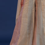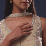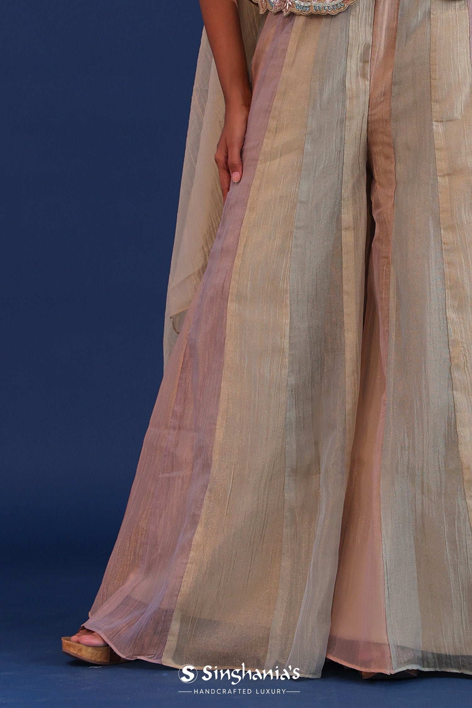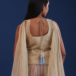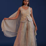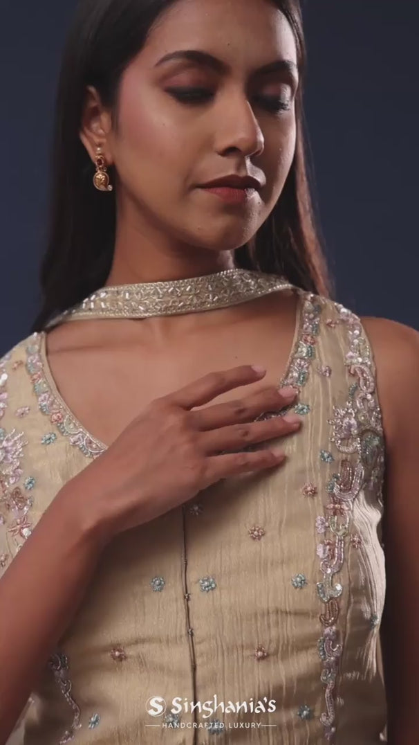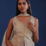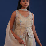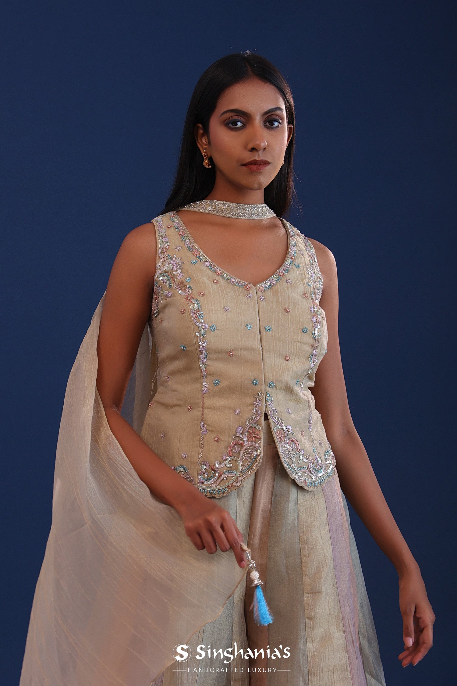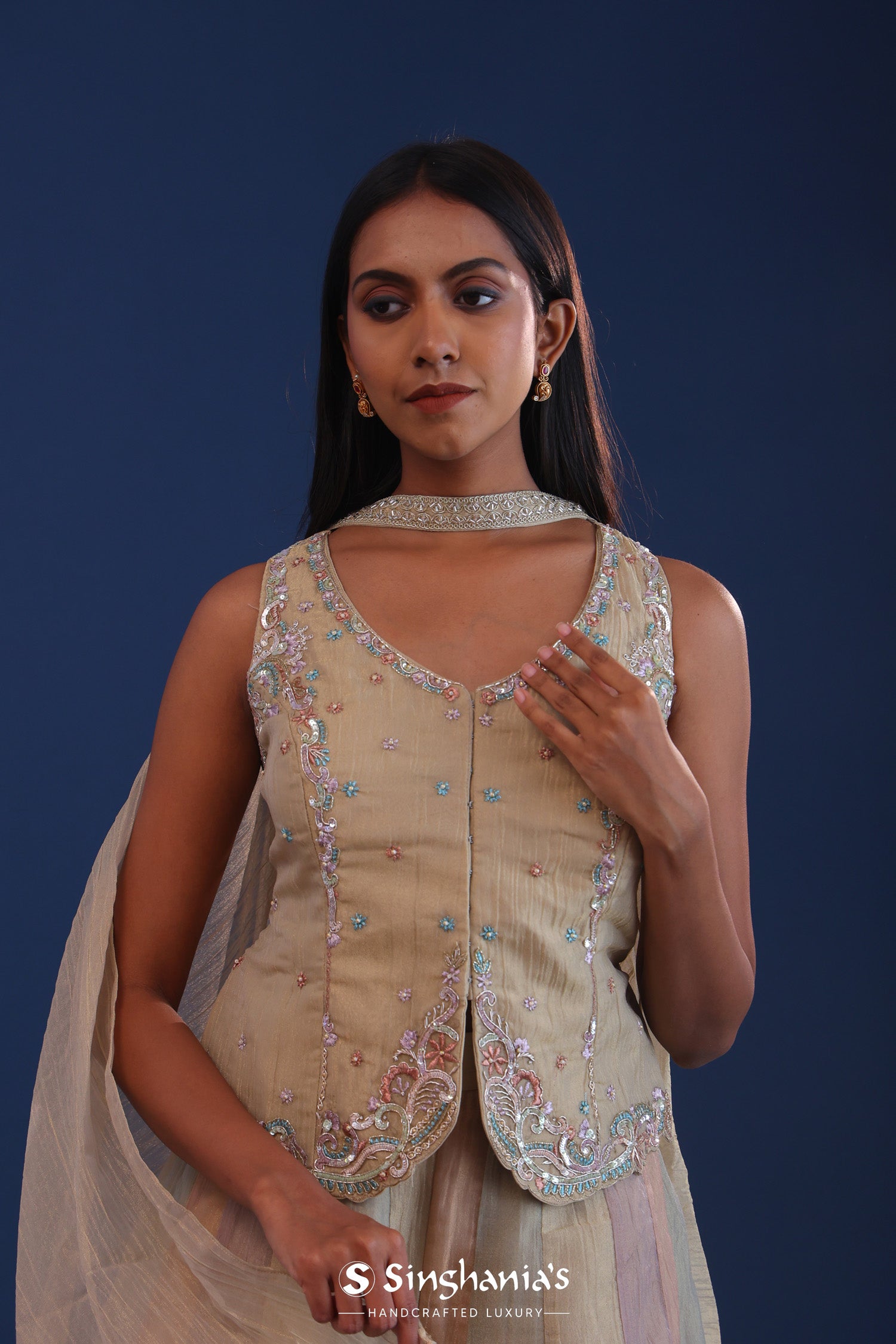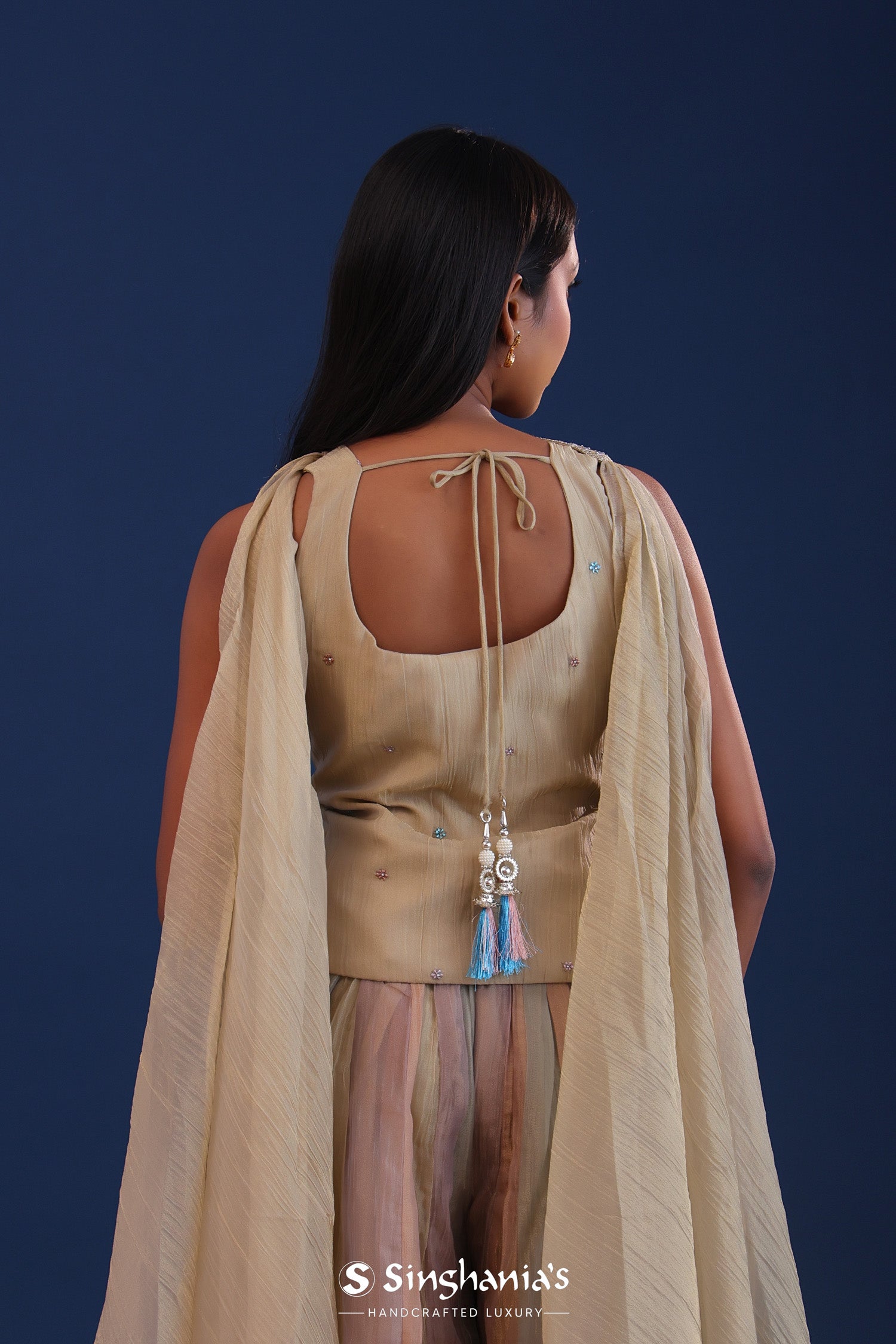 The pastel beige organza crush indo western choli set with an organza dupatta for a trendy and fashionable look.