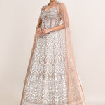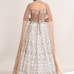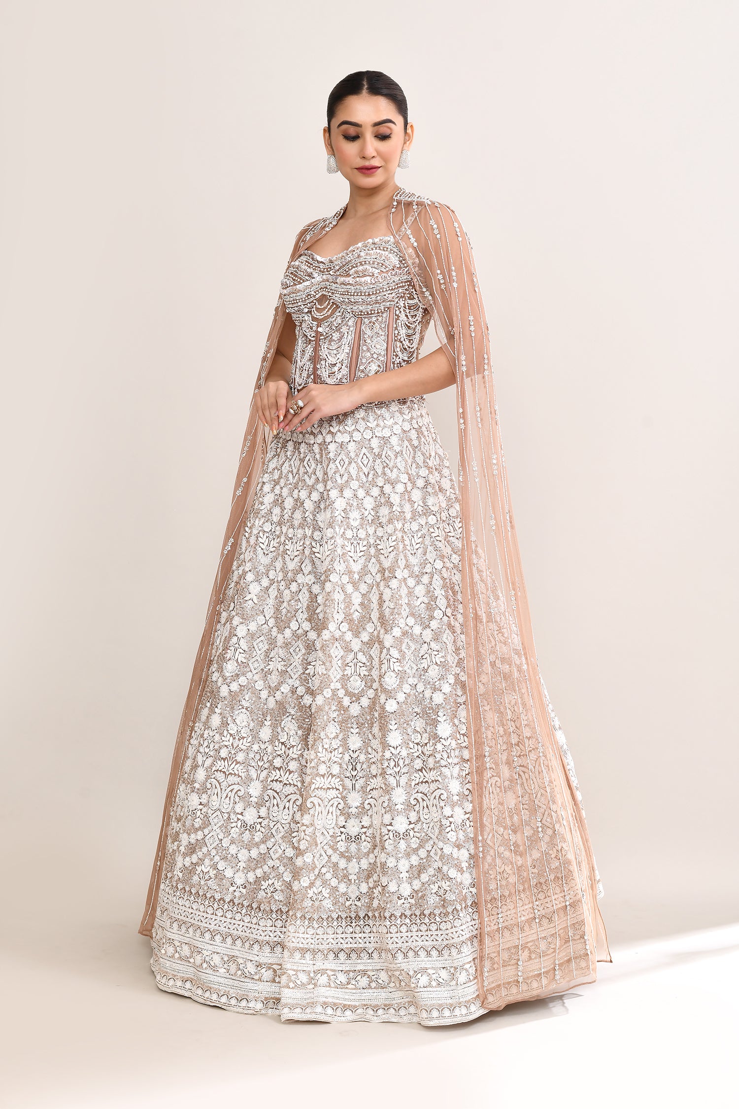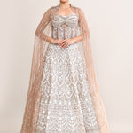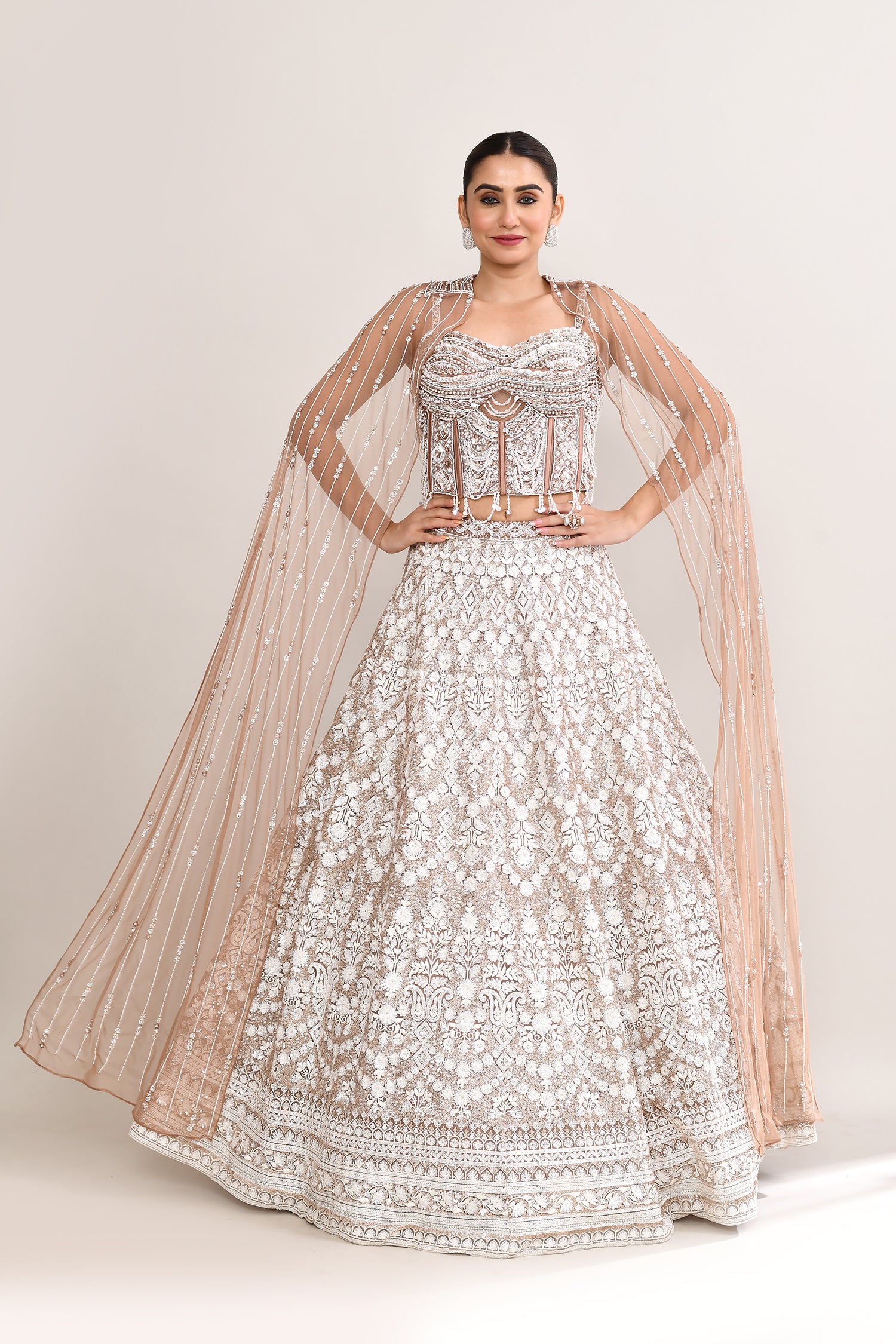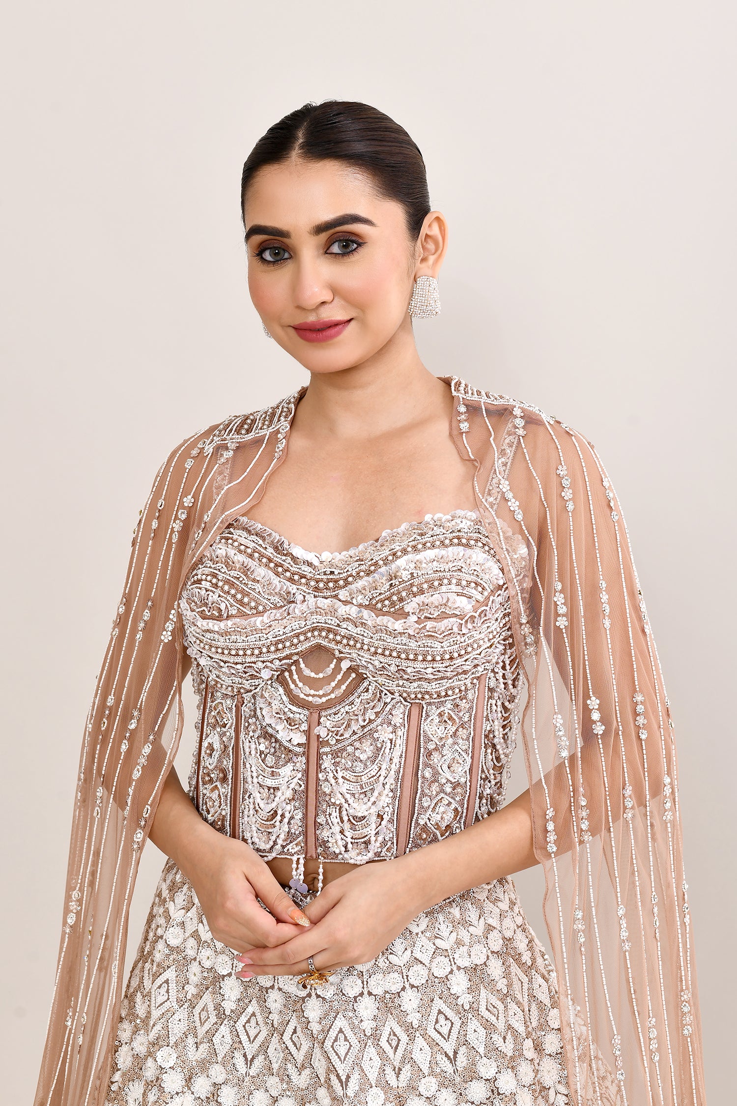 The pastel cream net embroidered lehenga set with stone and pearl work and angle sleeves for a beautiful look with elegance.