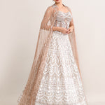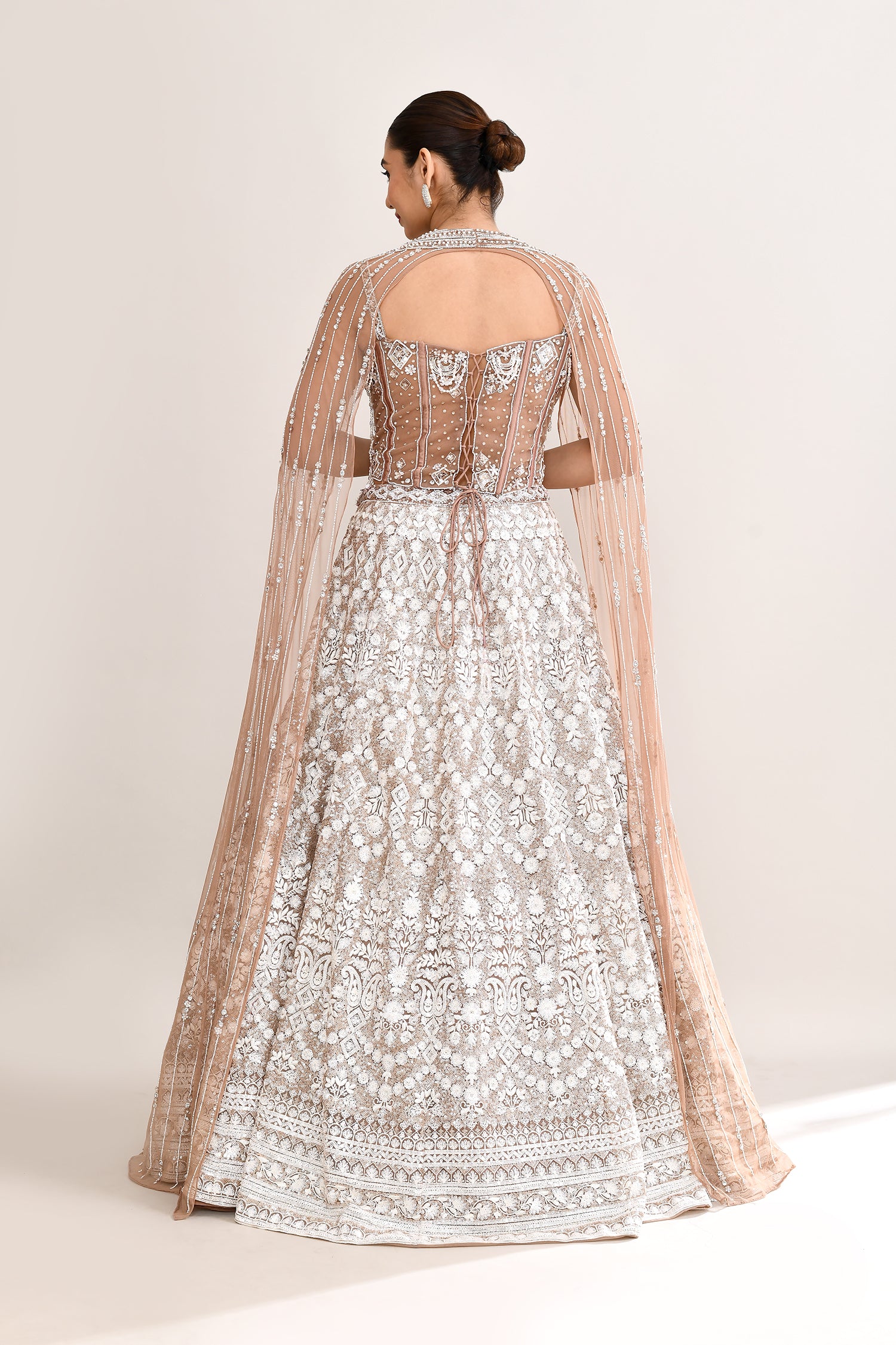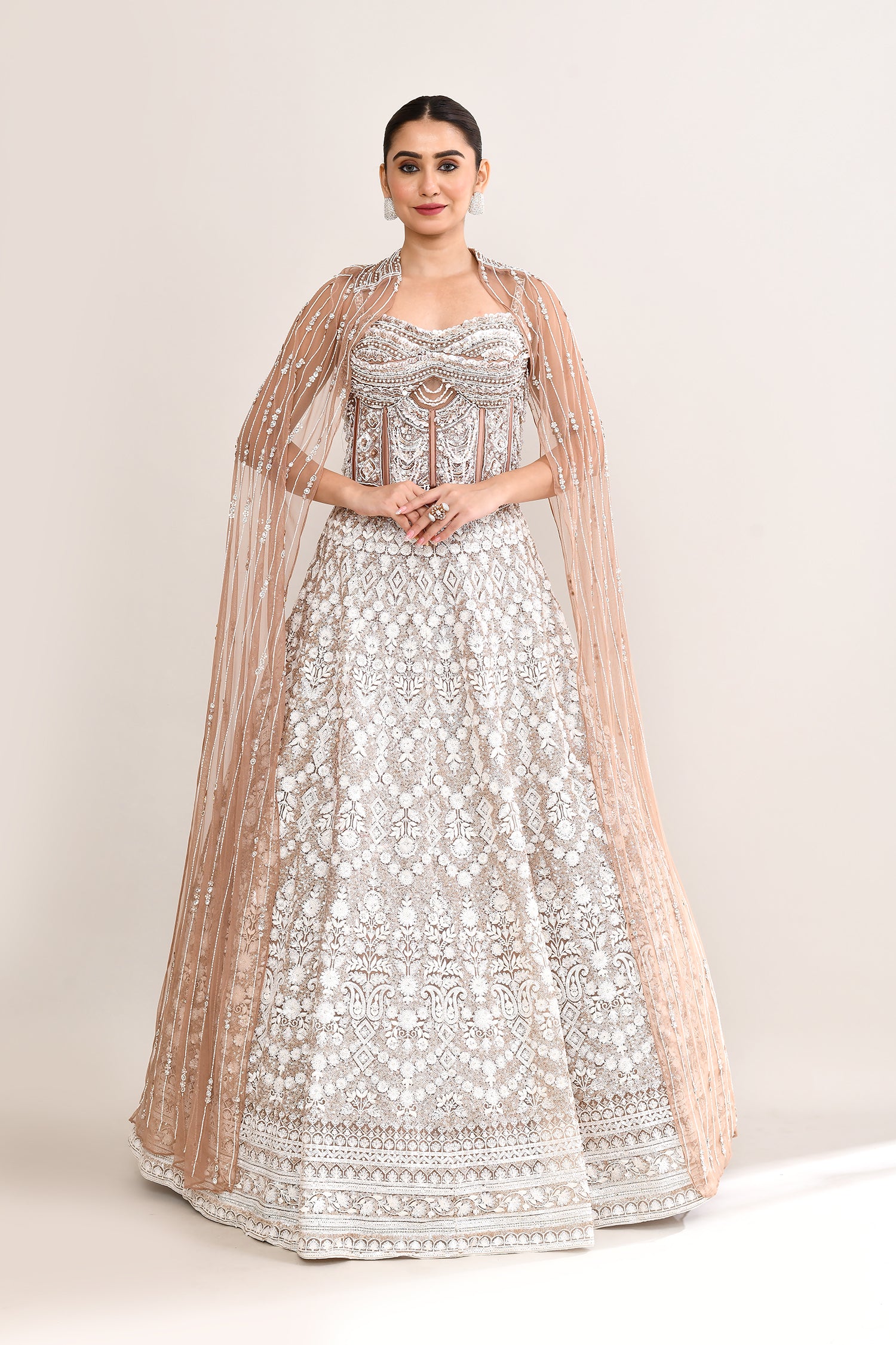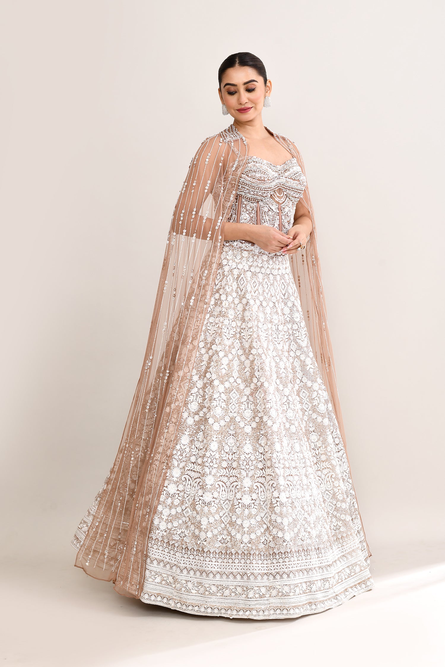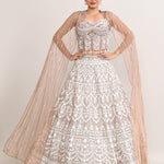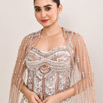 The pastel cream net embroidered lehenga set with stone and pearl work and angle sleeves for a beautiful look with elegance.