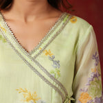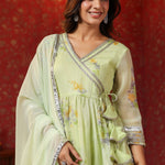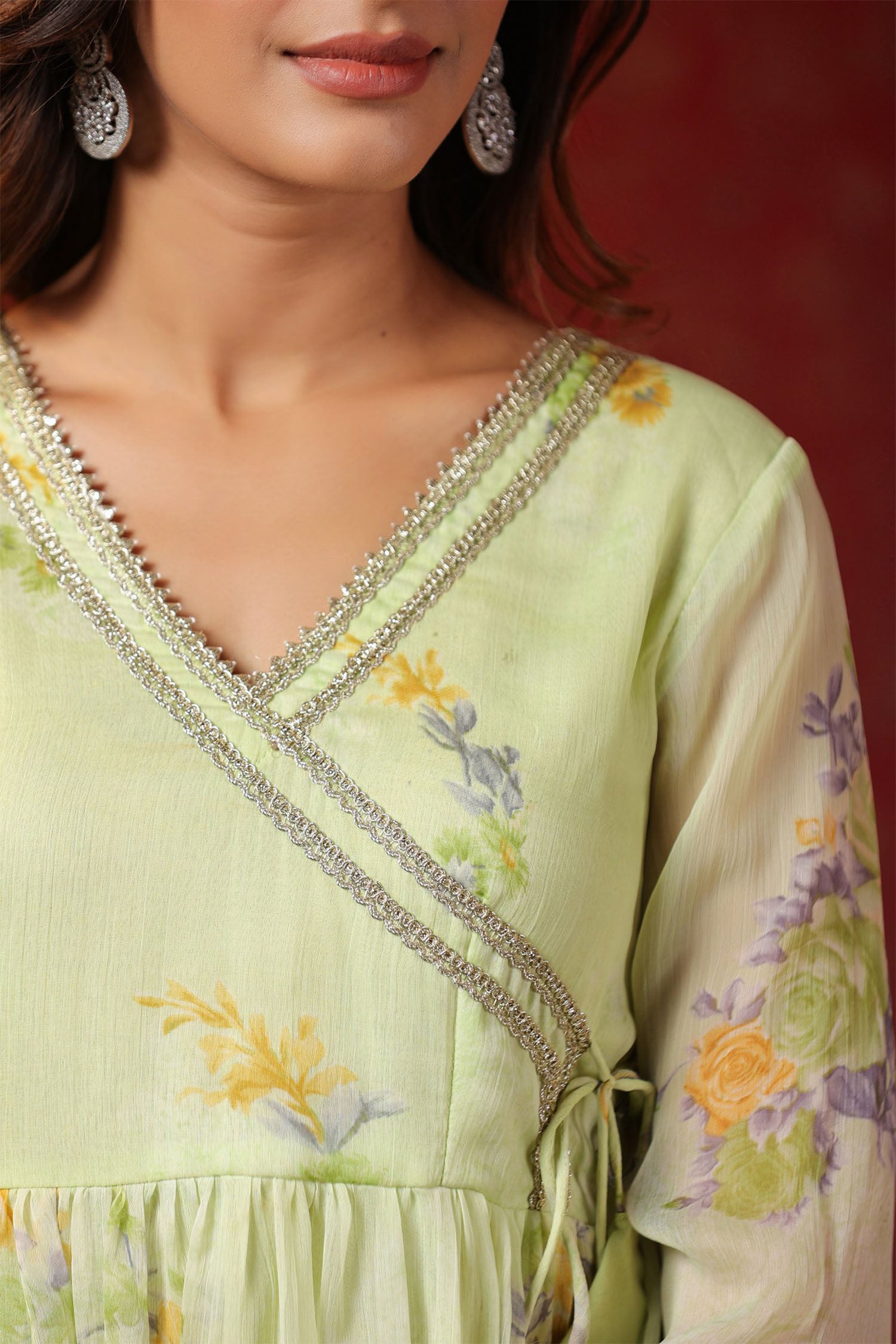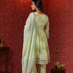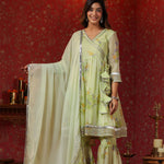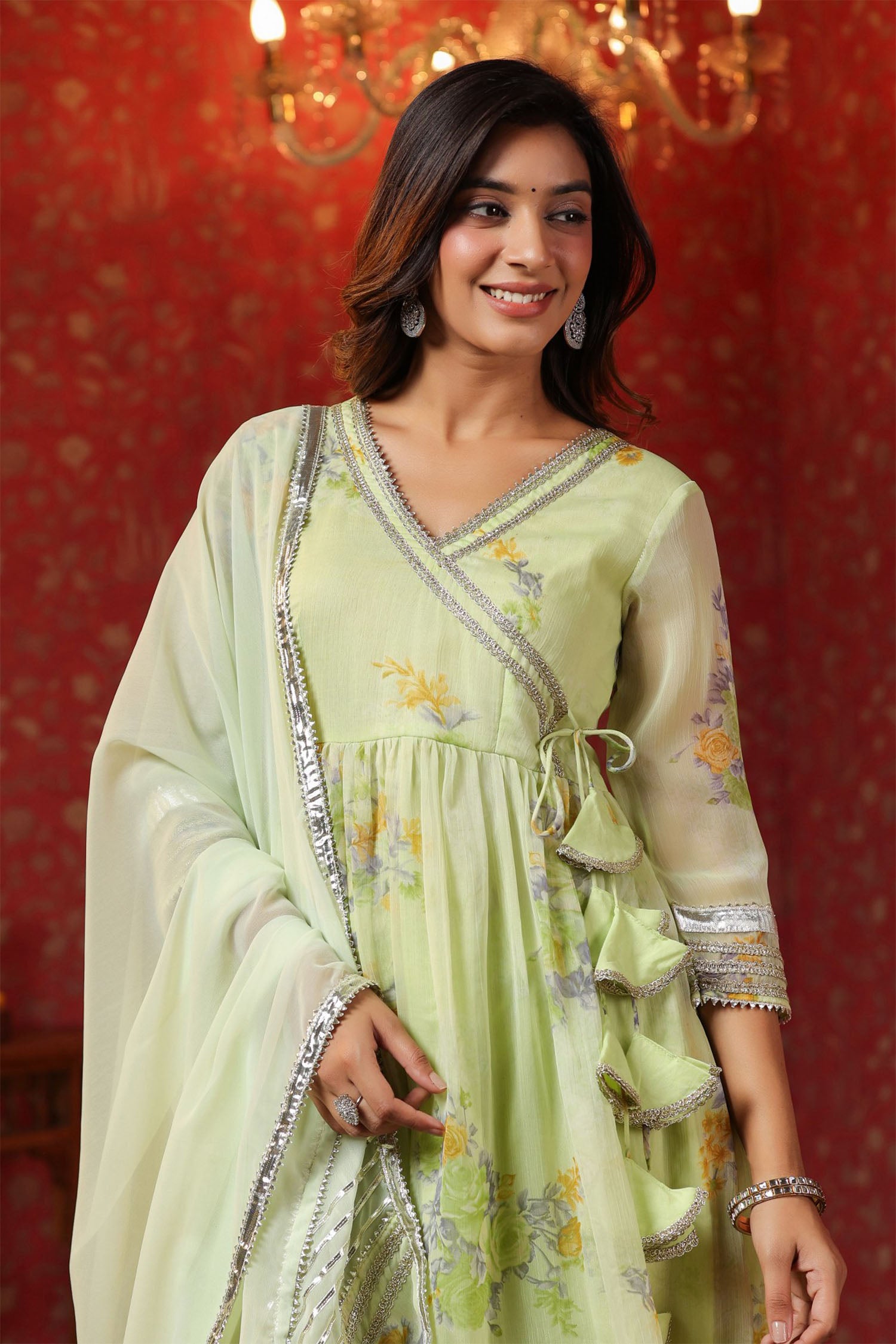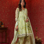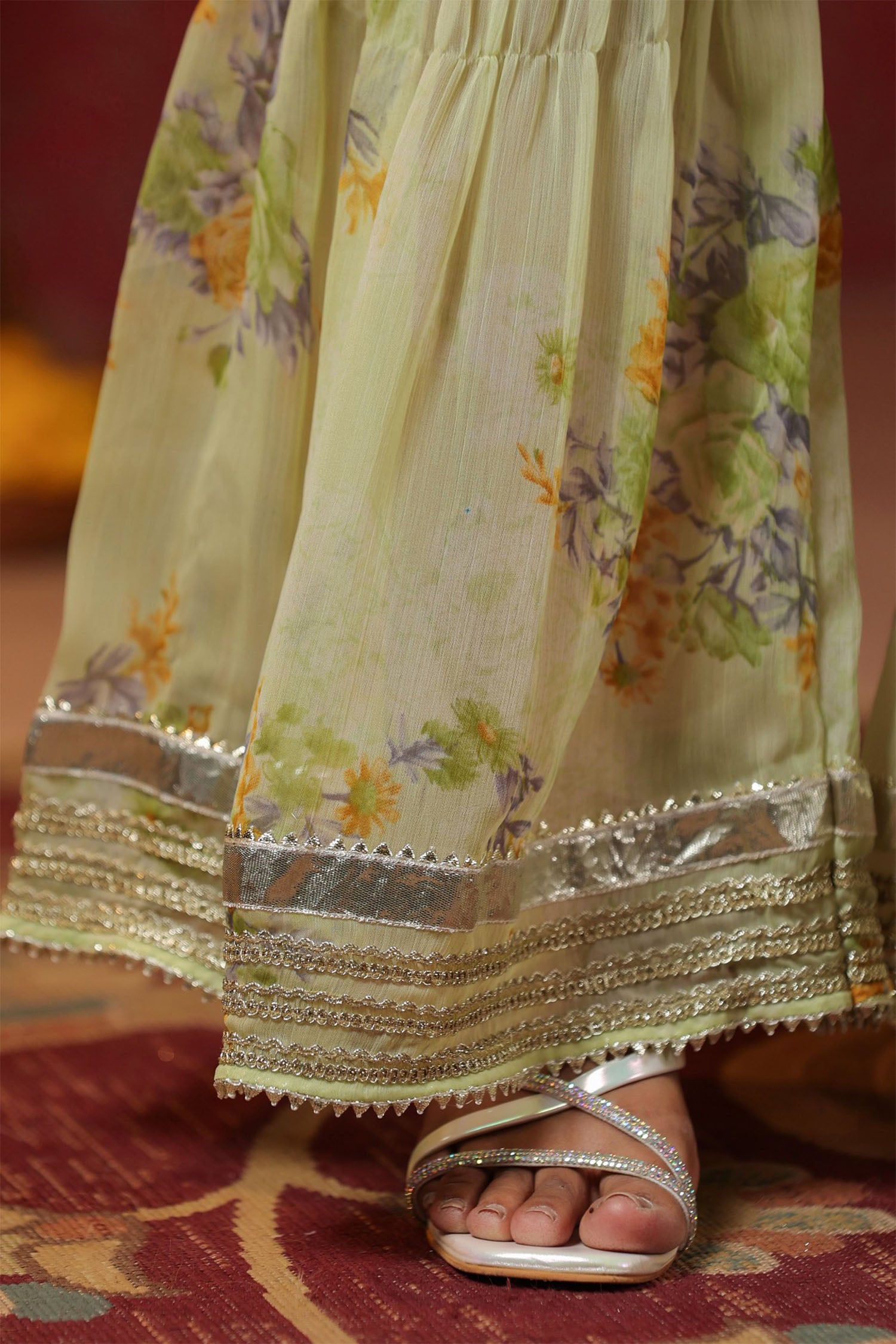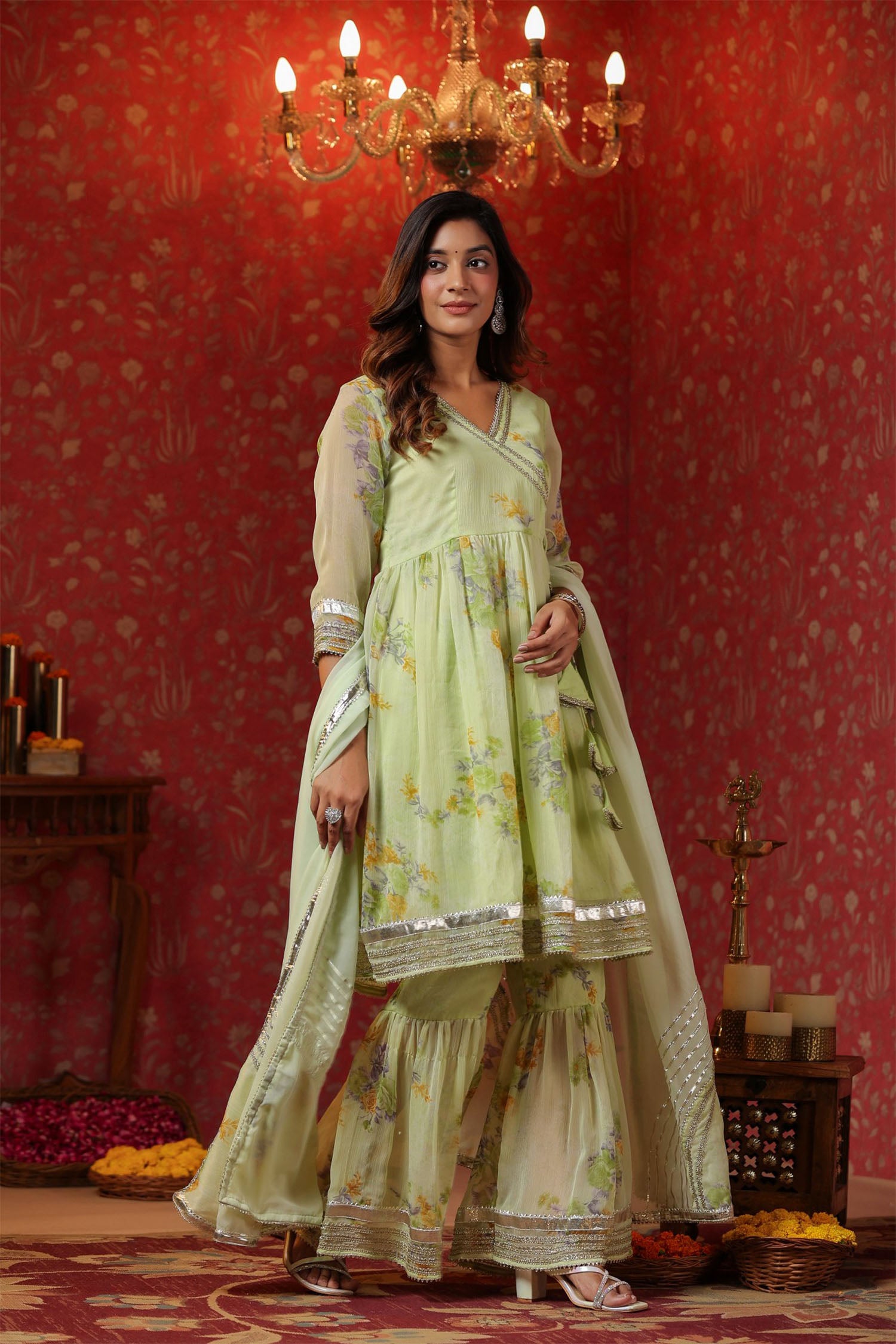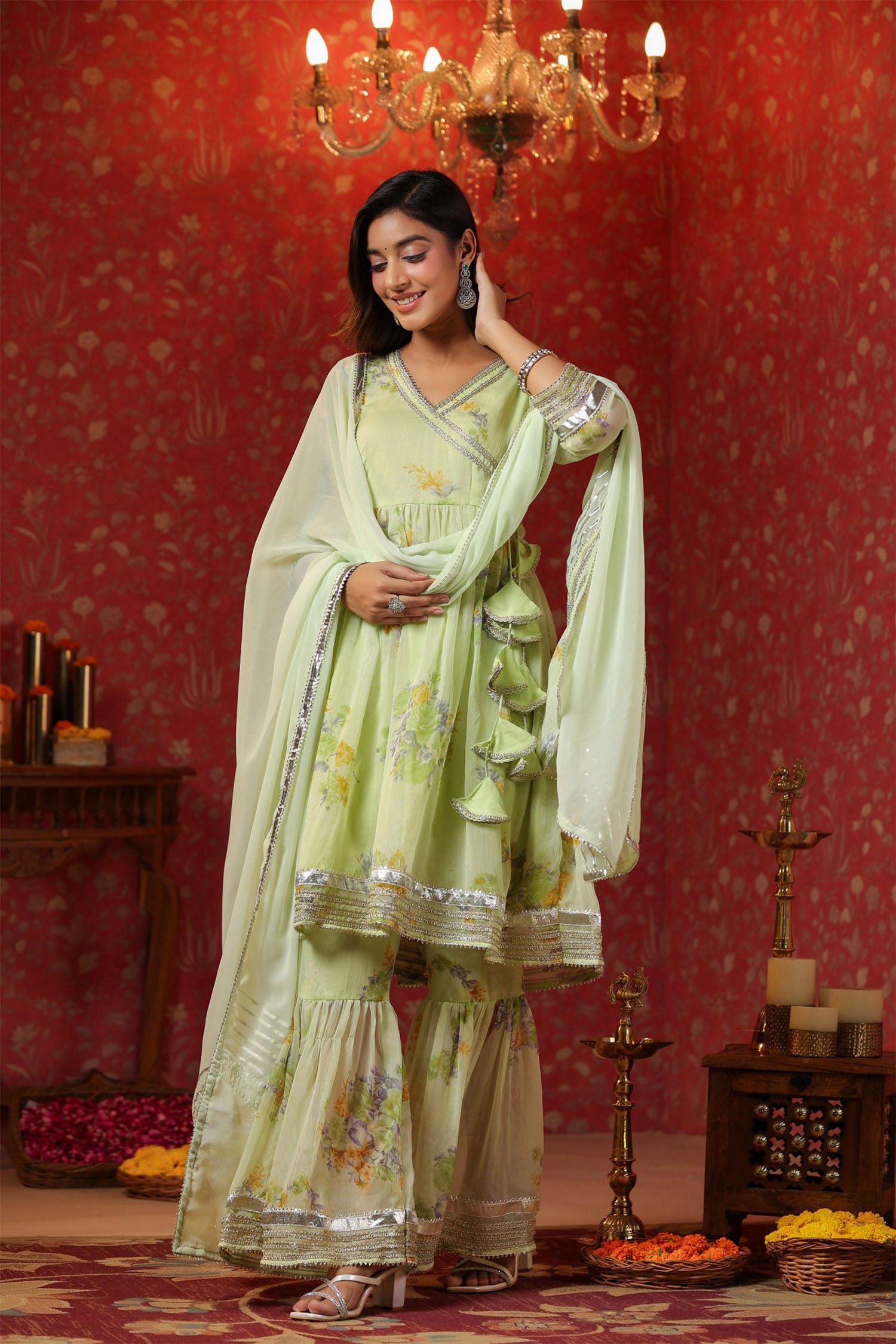 The pastel green chiffon floral printed gharara set with georgette dupatta for a stylish and charming look.