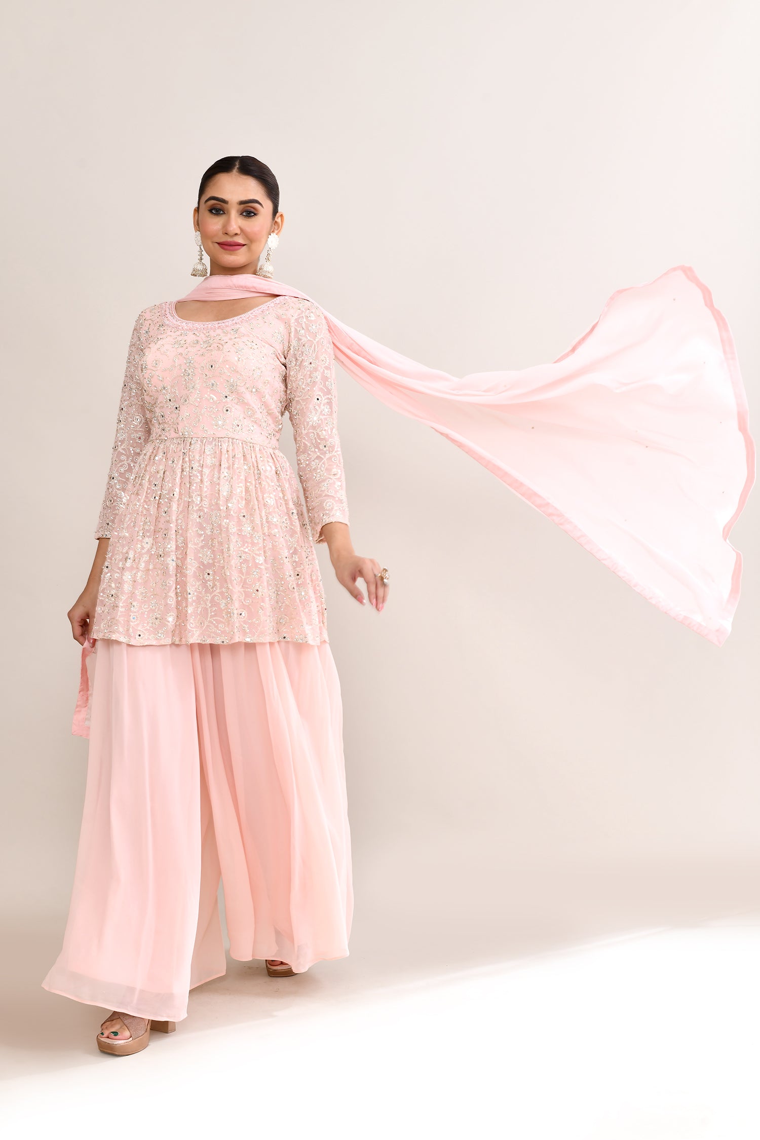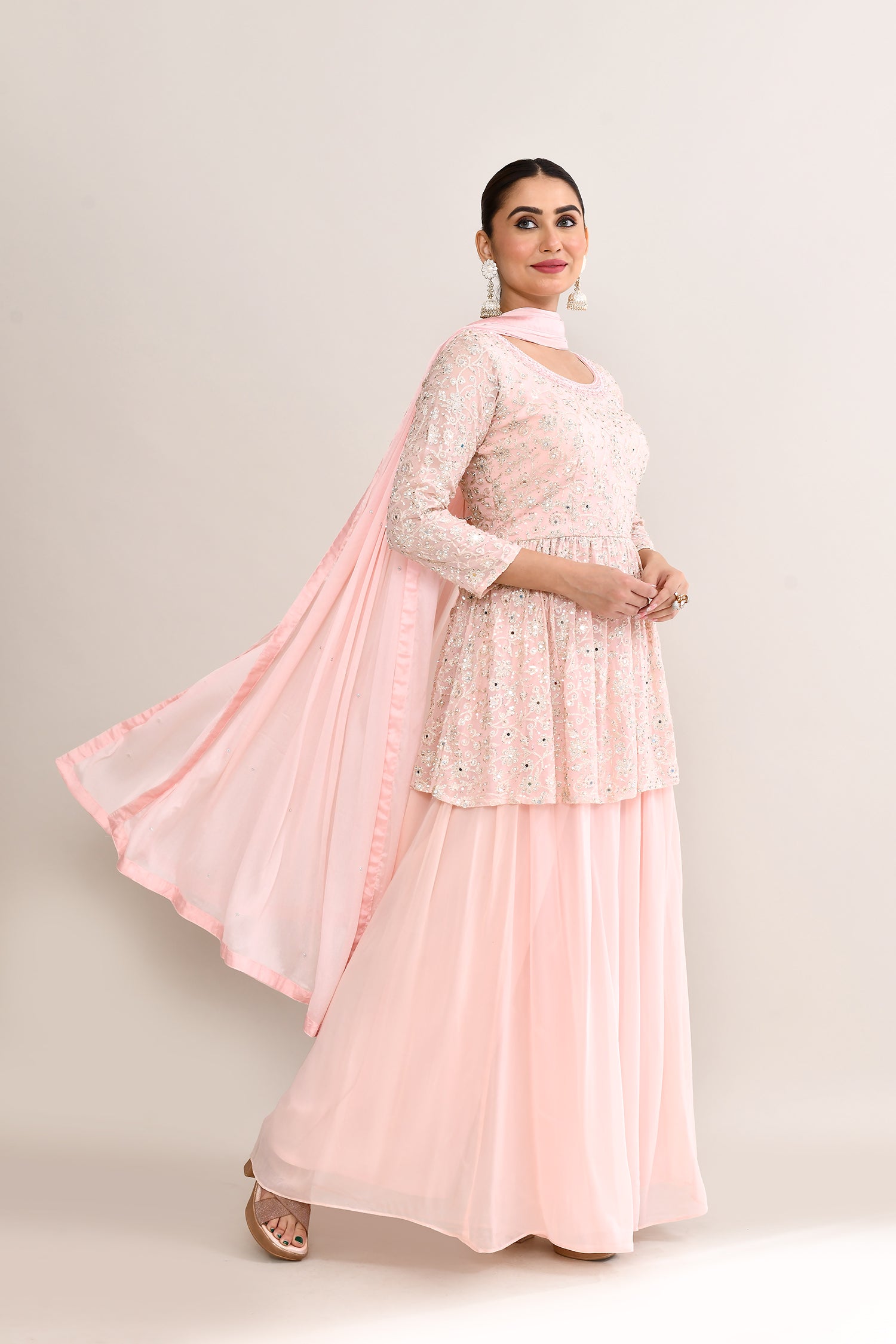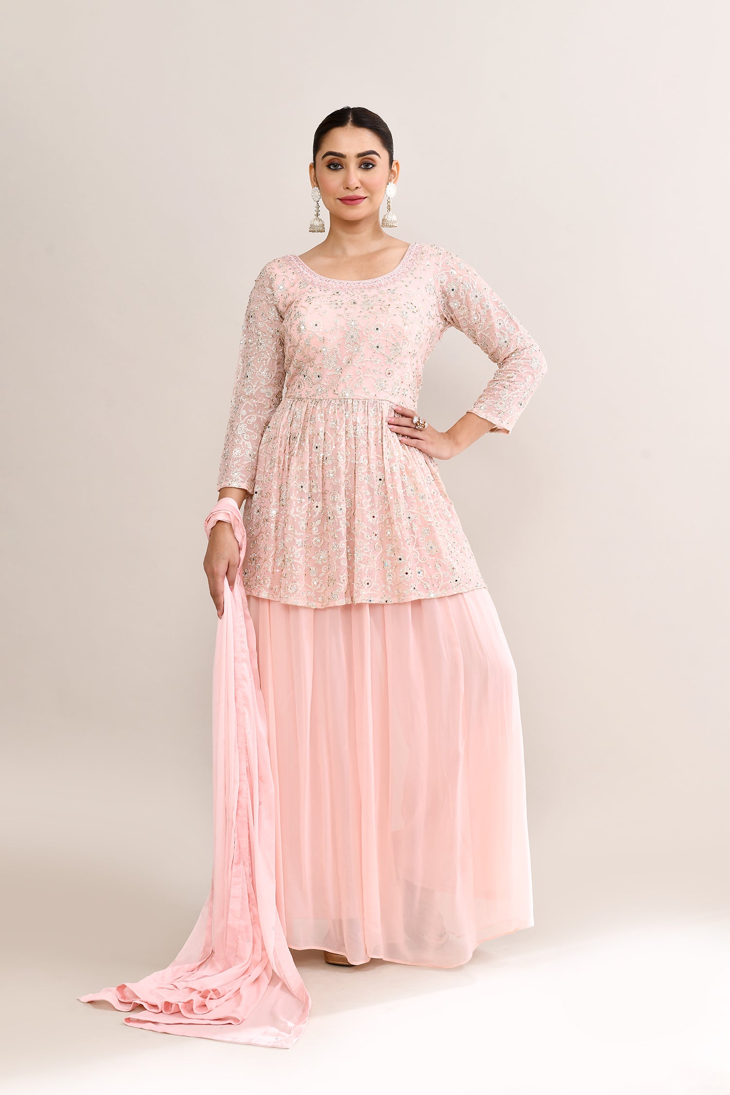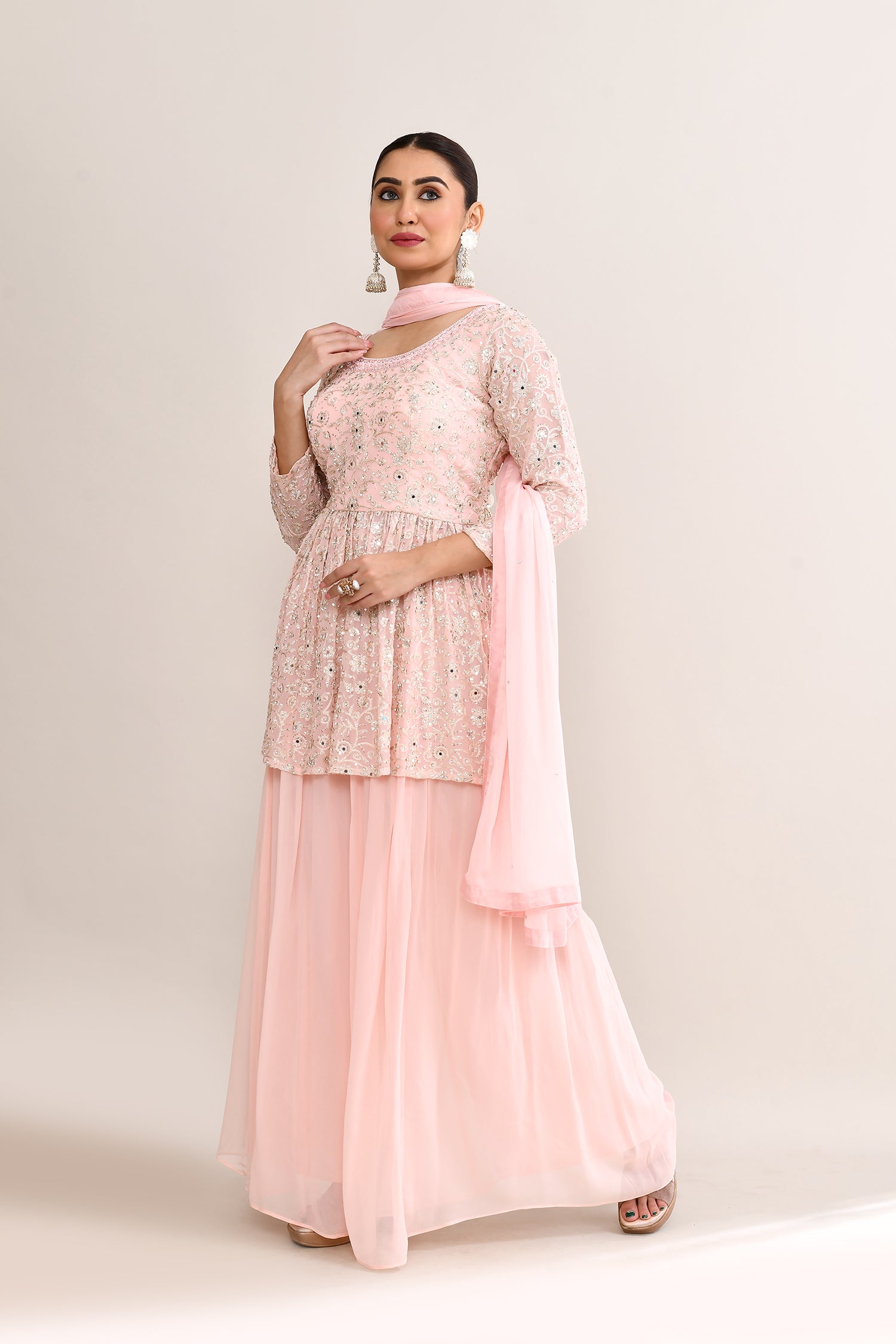 The pastel pink georgette embroidered palazzo set with hand work thread embroidery along with a chiffon dupatta for a decent ready to wear look.