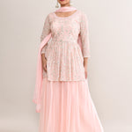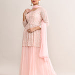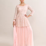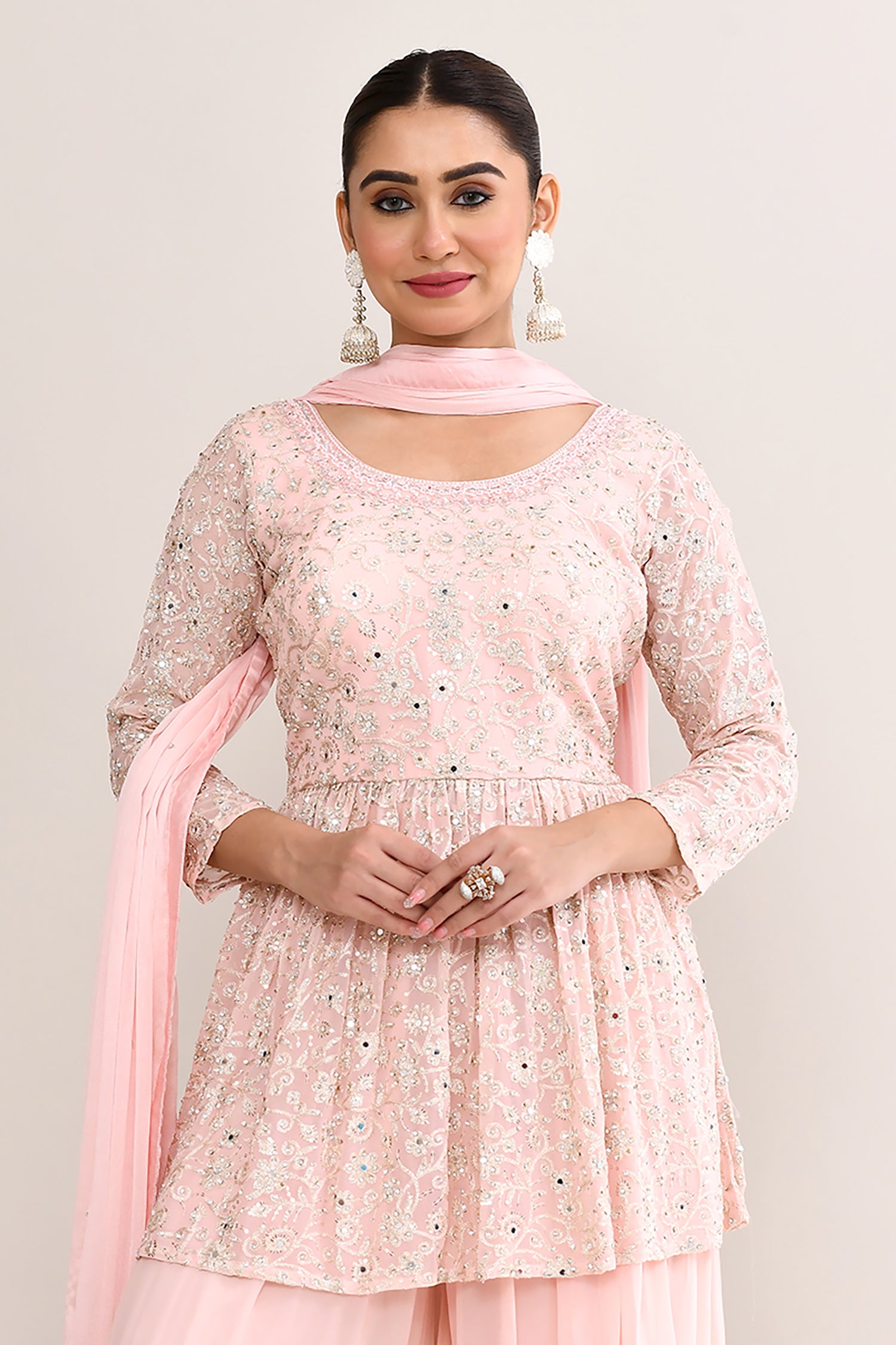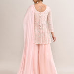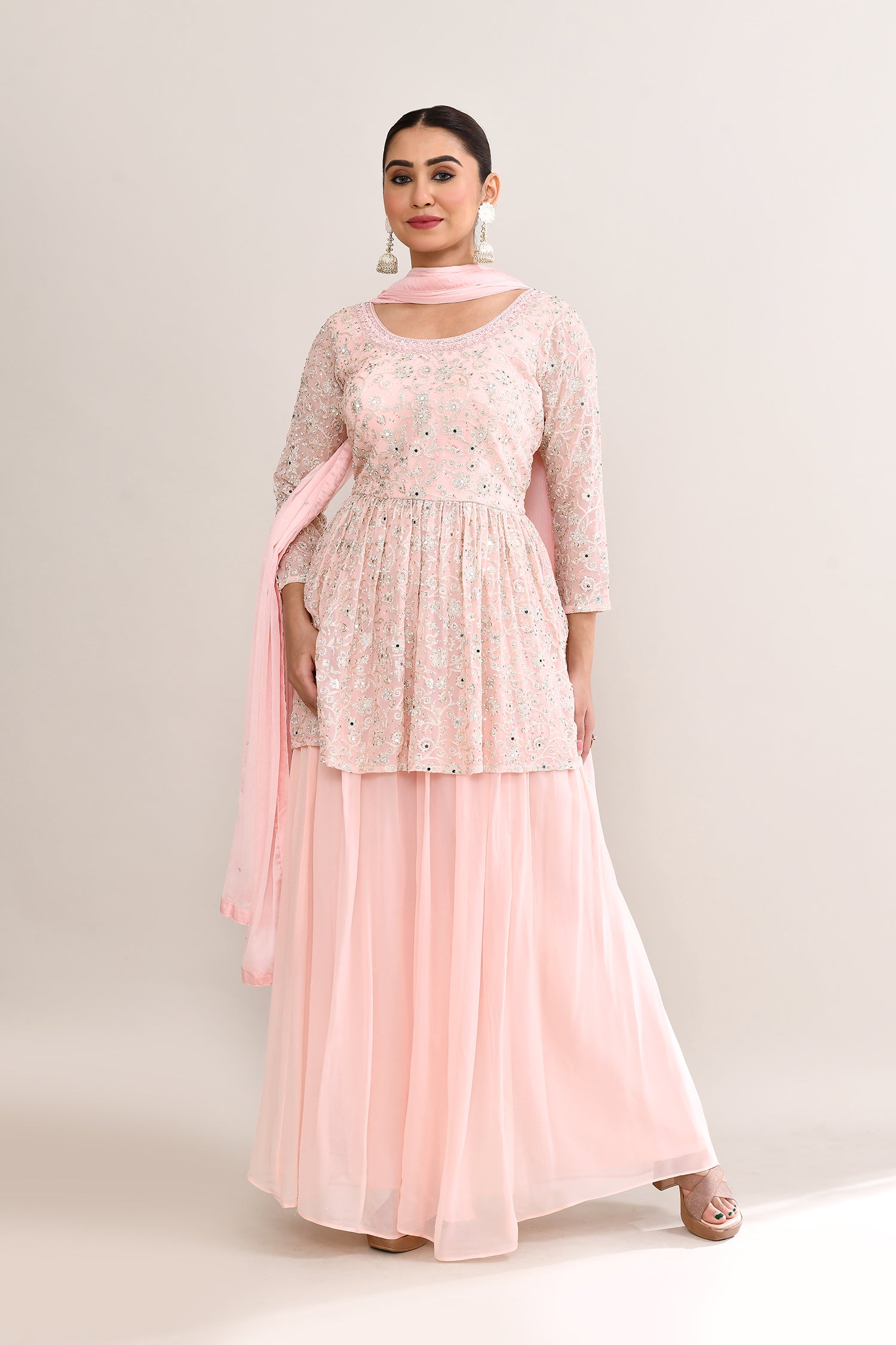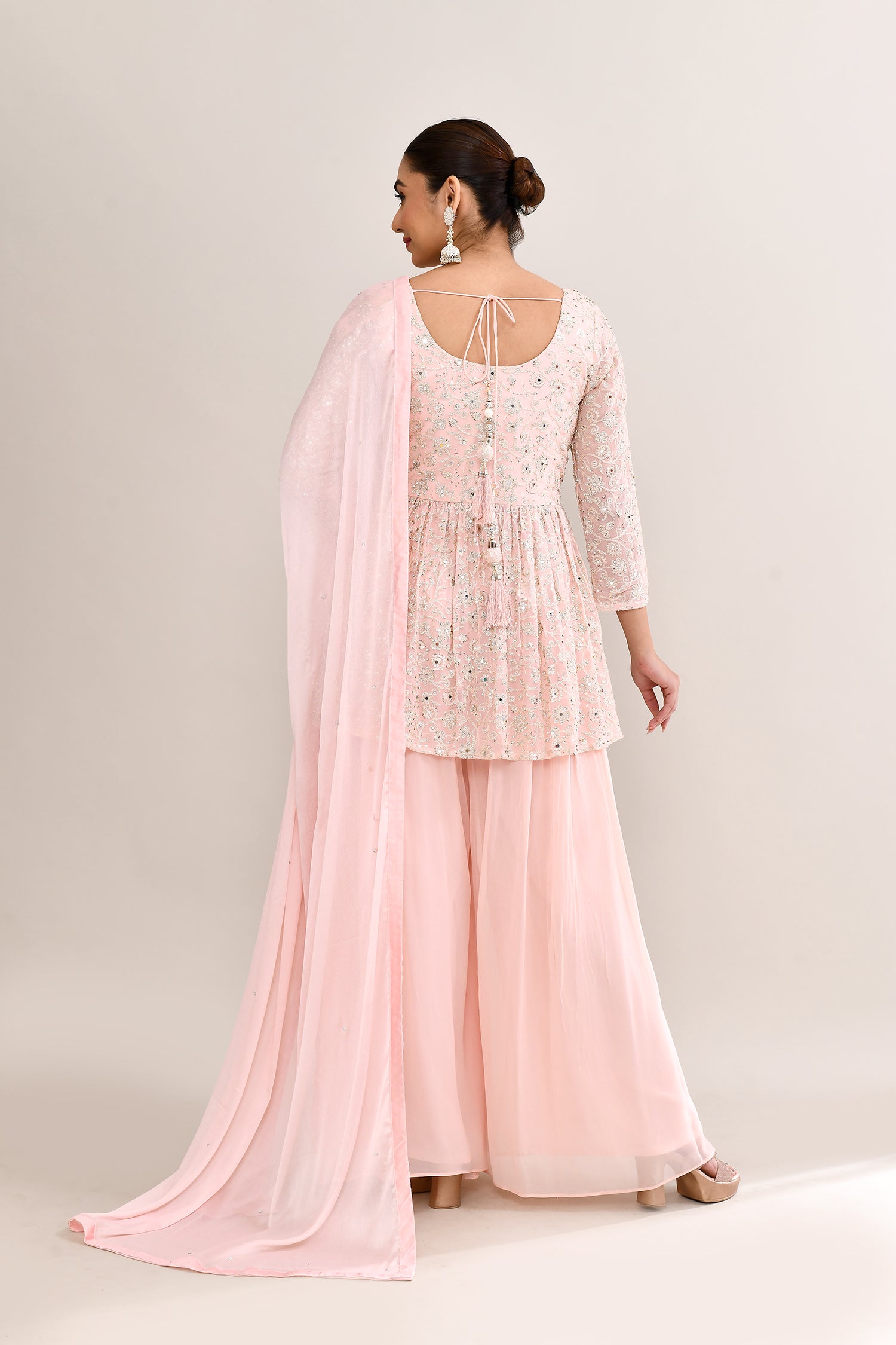 The pastel pink georgette embroidered palazzo set with hand work thread embroidery along with a chiffon dupatta for a decent ready to wear look.
