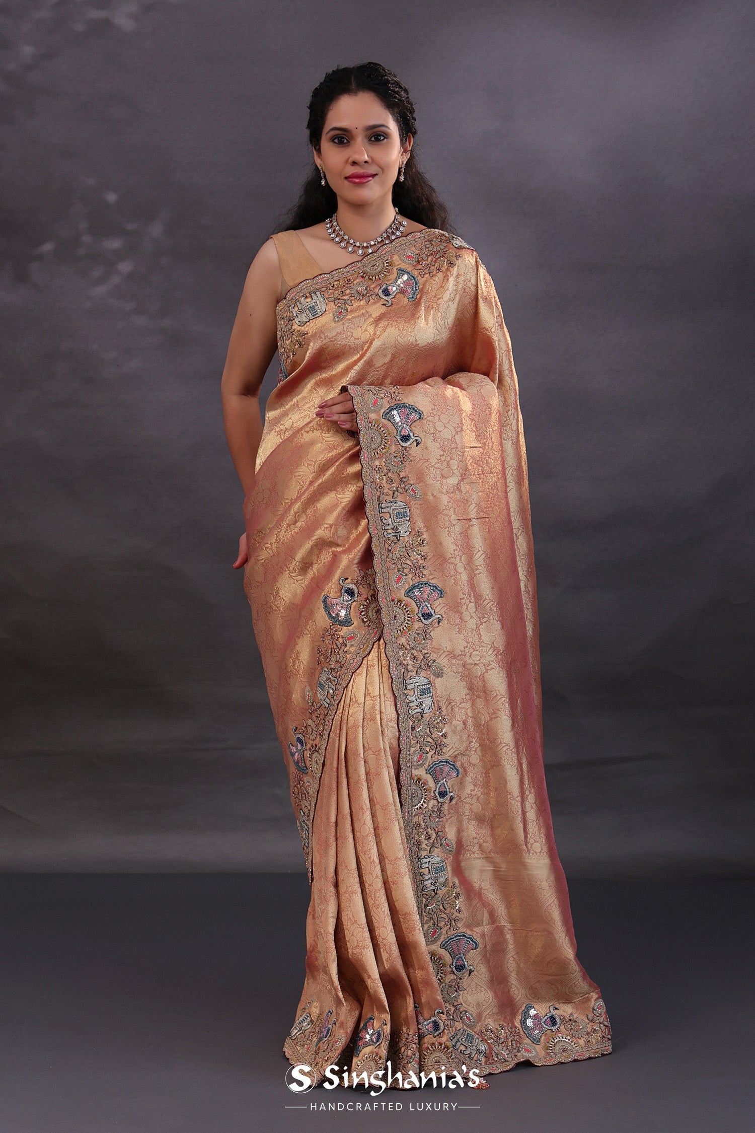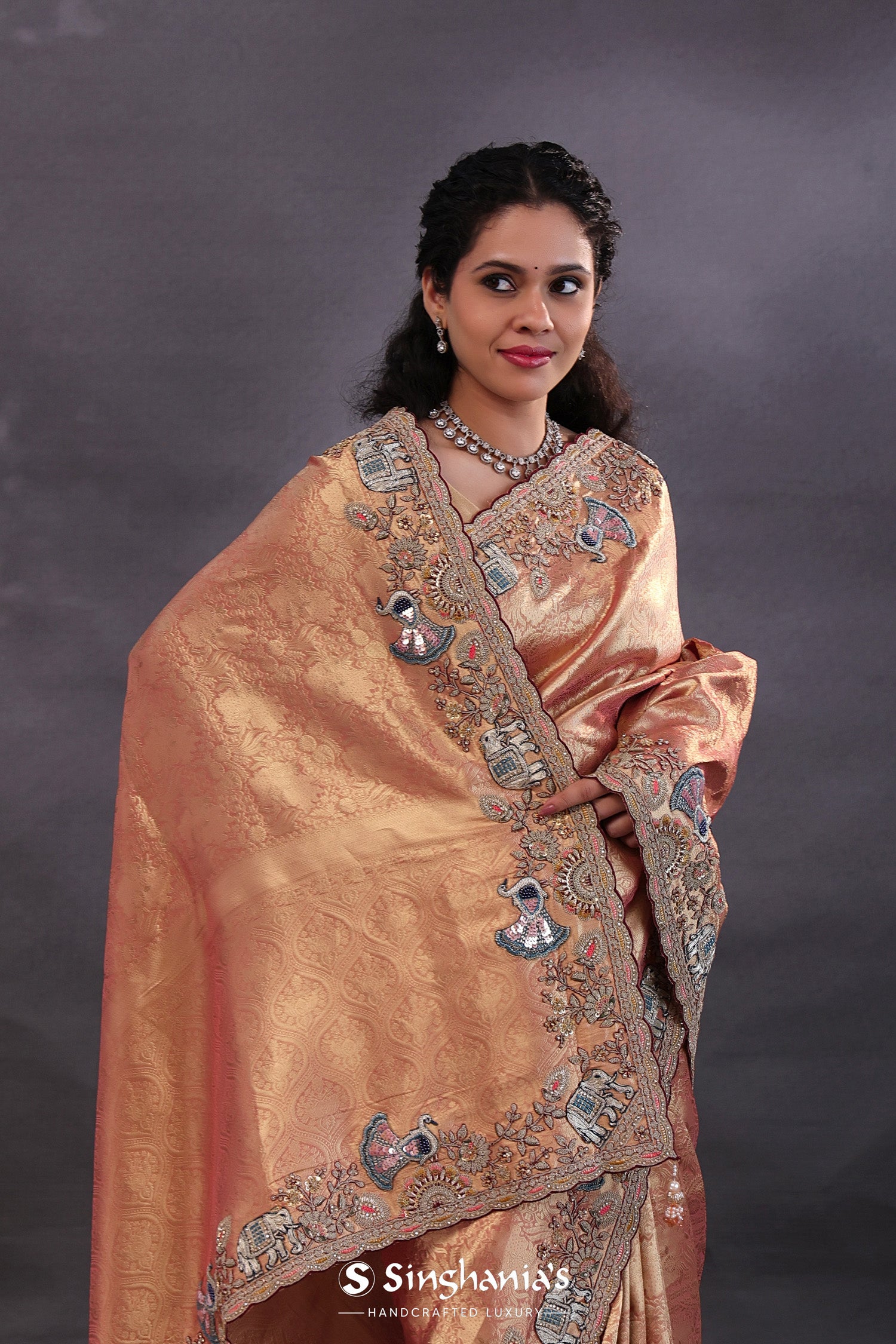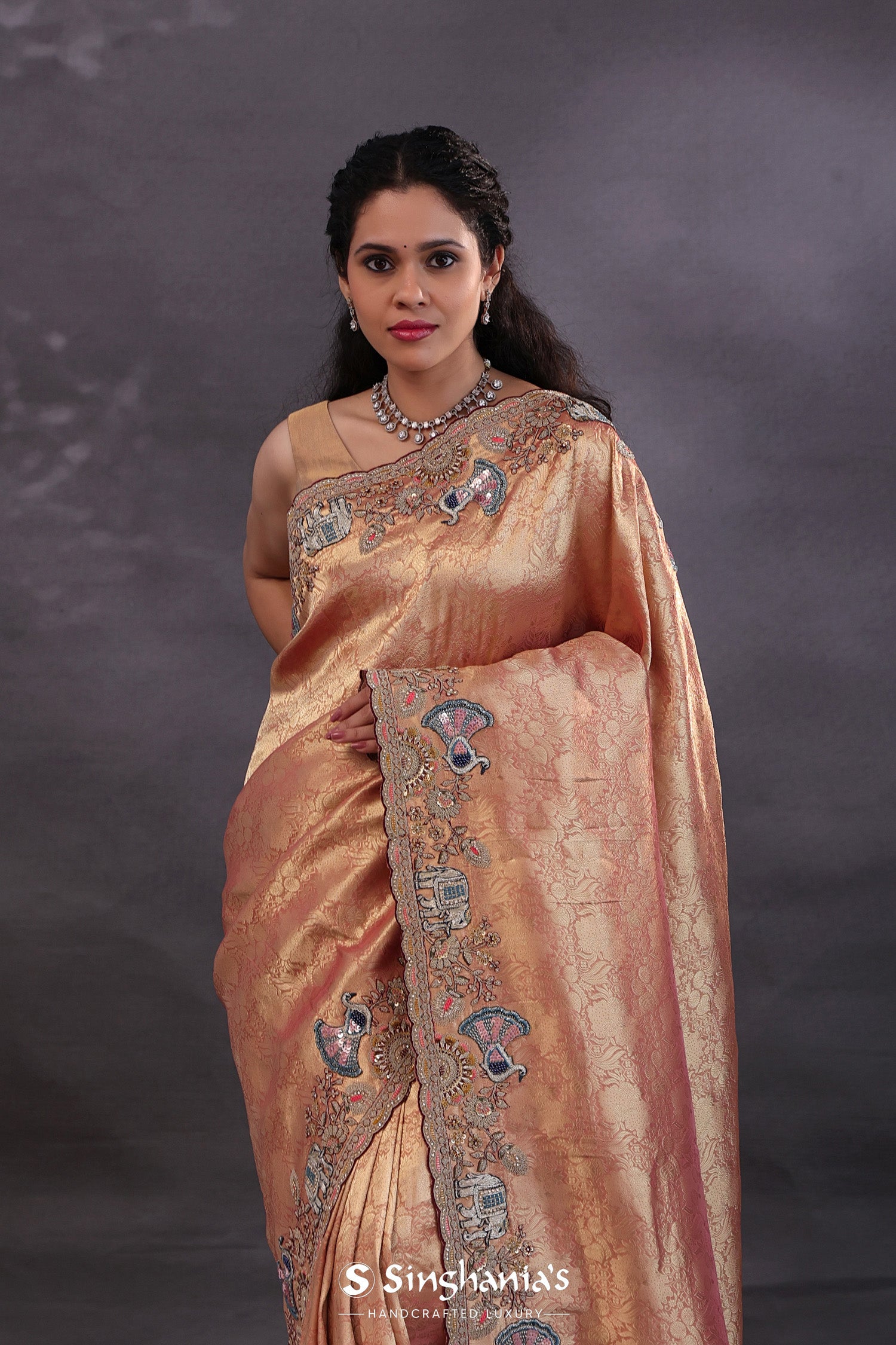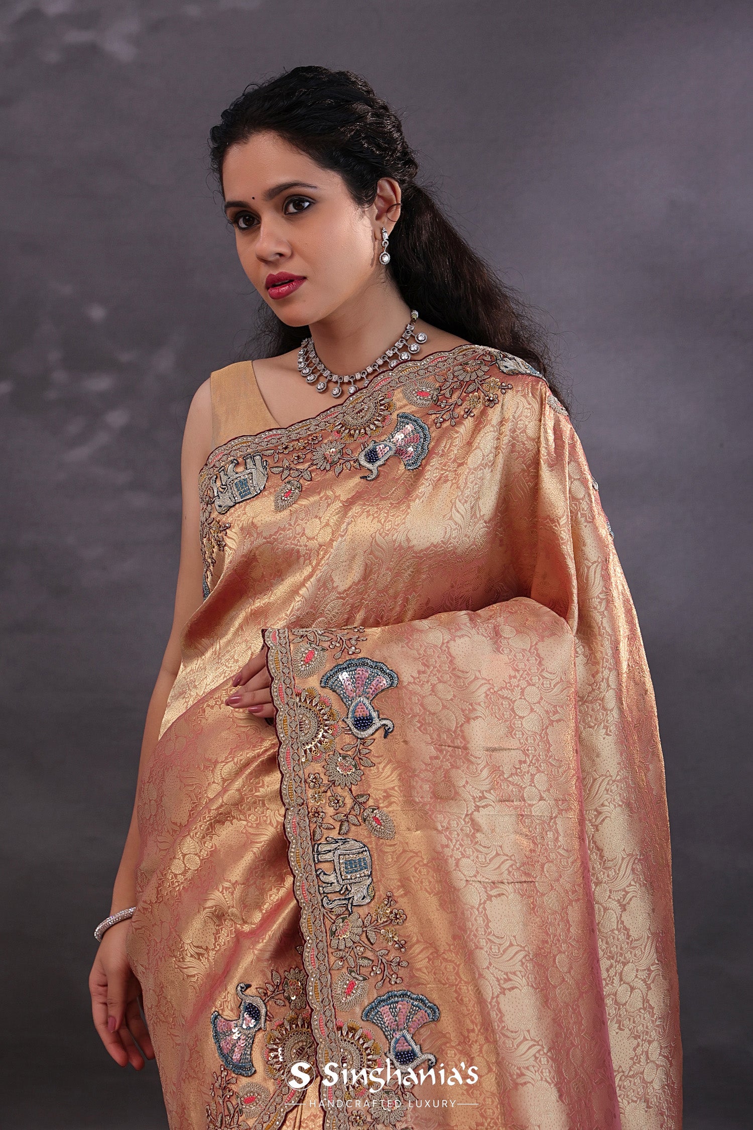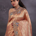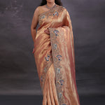 The pastel pink Banarasi tissue saree with scallop border along with floral zari self design work for an amazing look.
