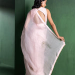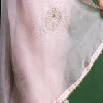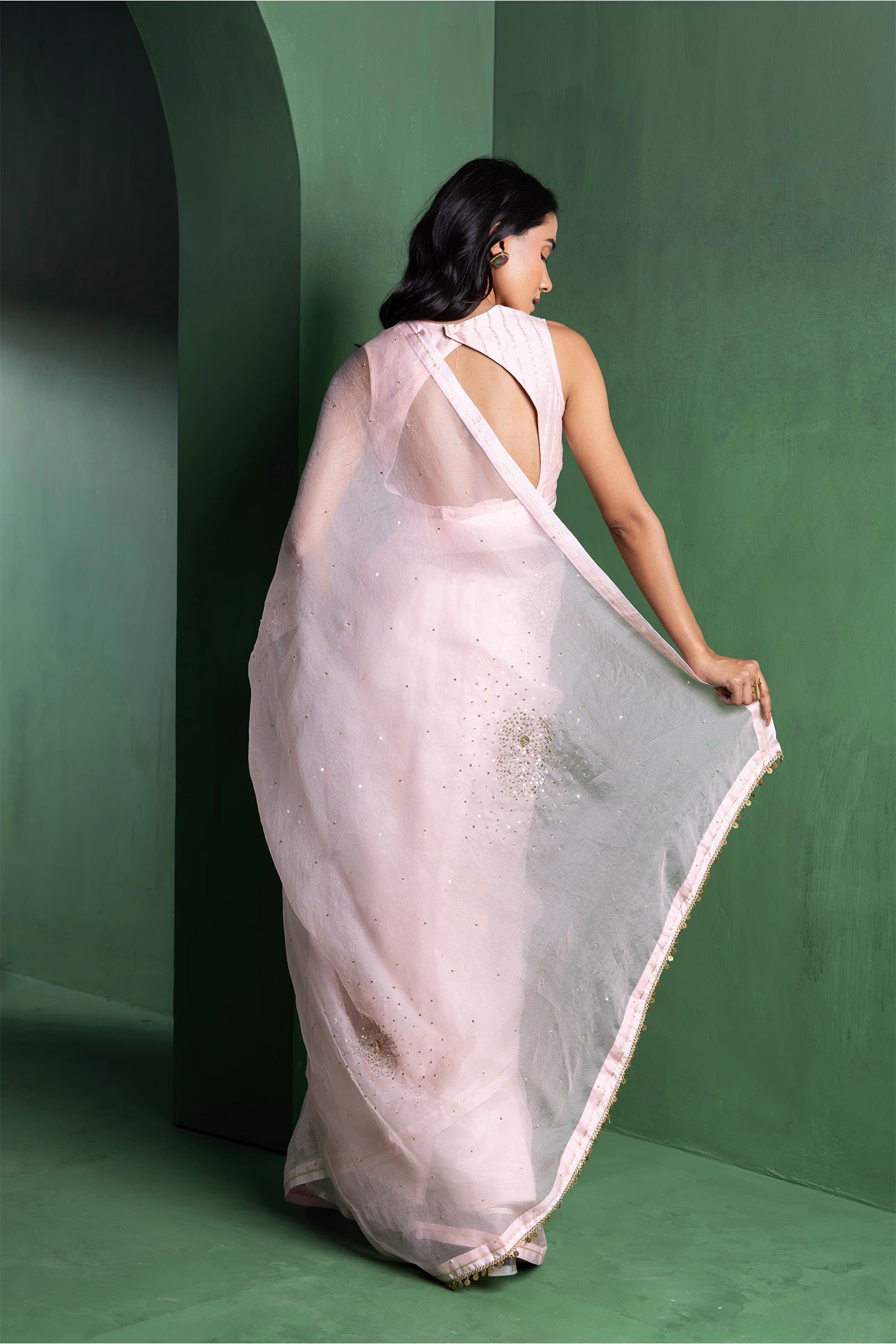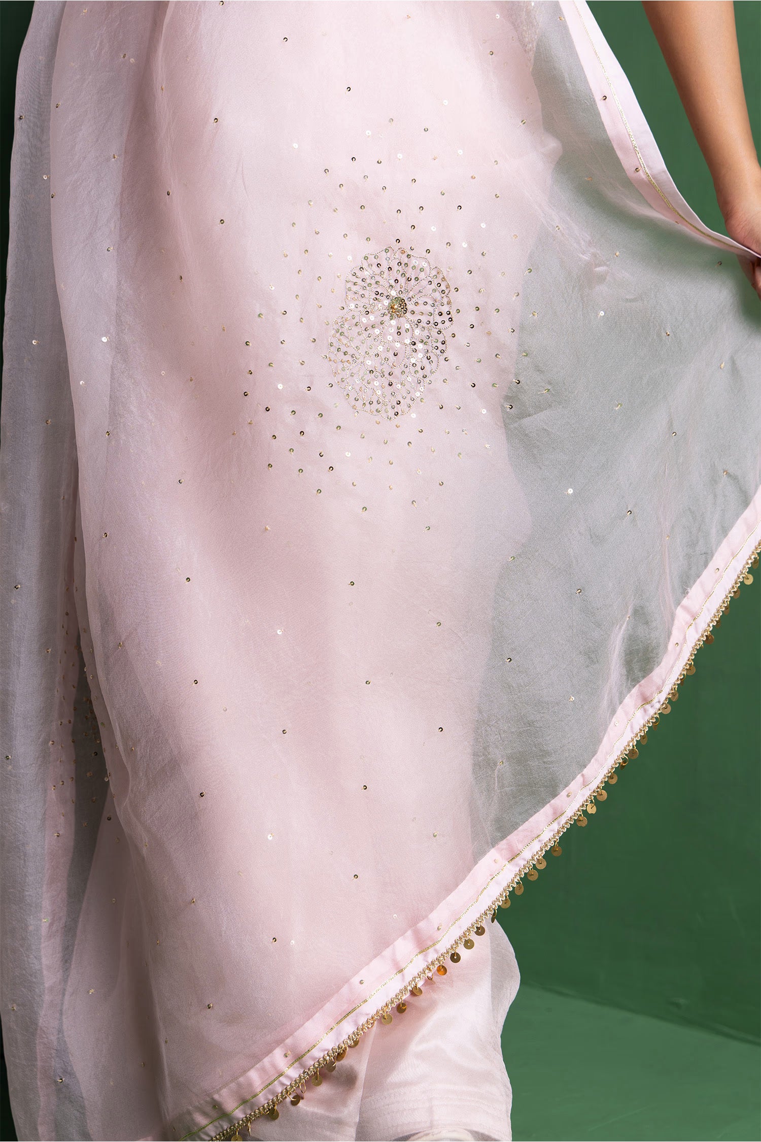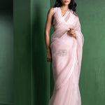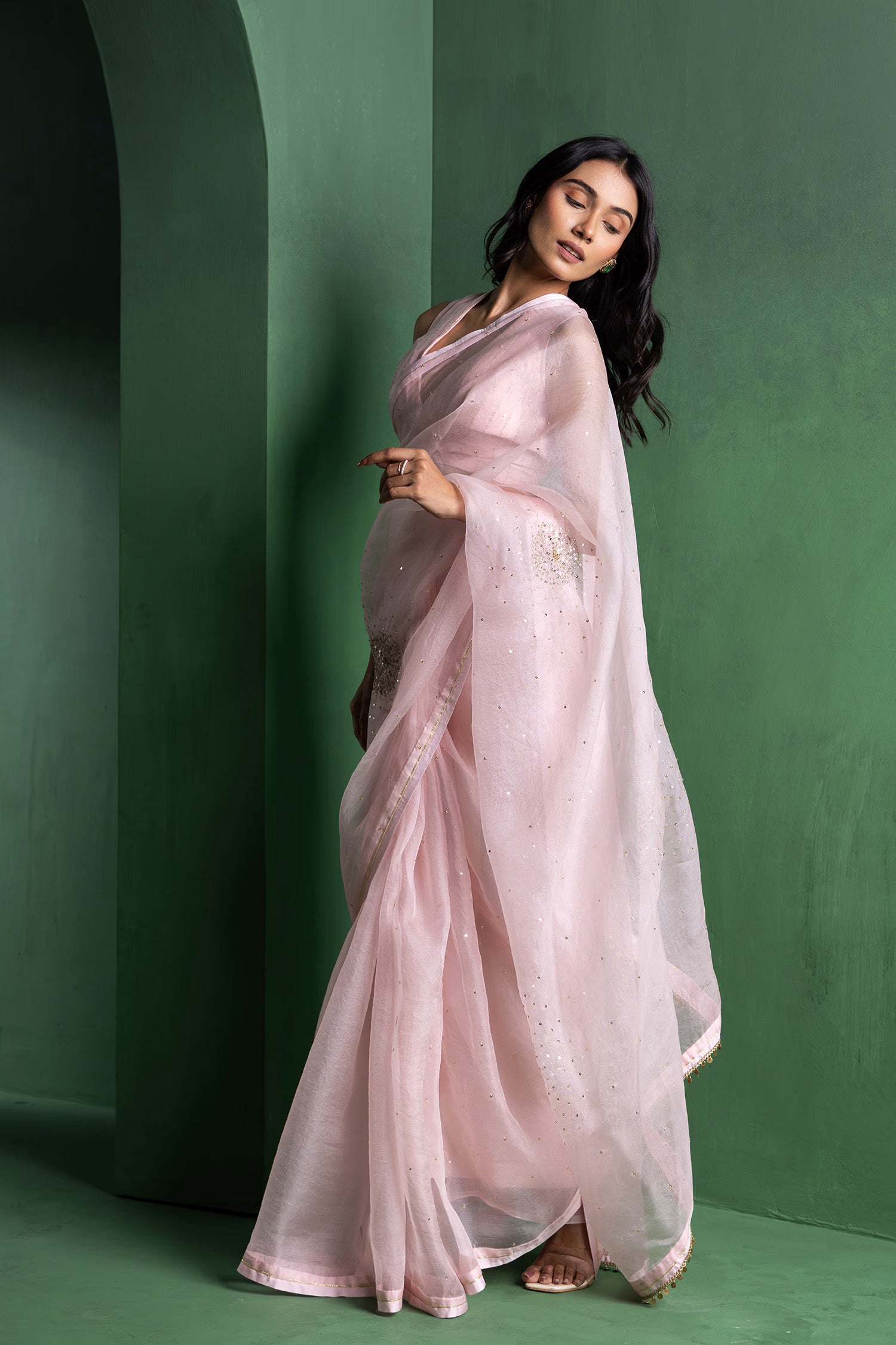 This elegant and flowy drape of this Piggy pink silk organza saree adorned with sequins work spread all over the saree complemented with chanderi jacquard blouse piece making it ideal choice for any fancy parties