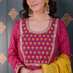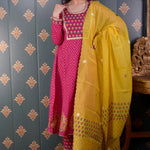 Pink Butti Chandary With Block Print Kurti Set includes Pink Banarasi Butti Chandary With Foil Print Kurta ,Pant And Dupatta With Lace Finish for a beautiful and elegant look.