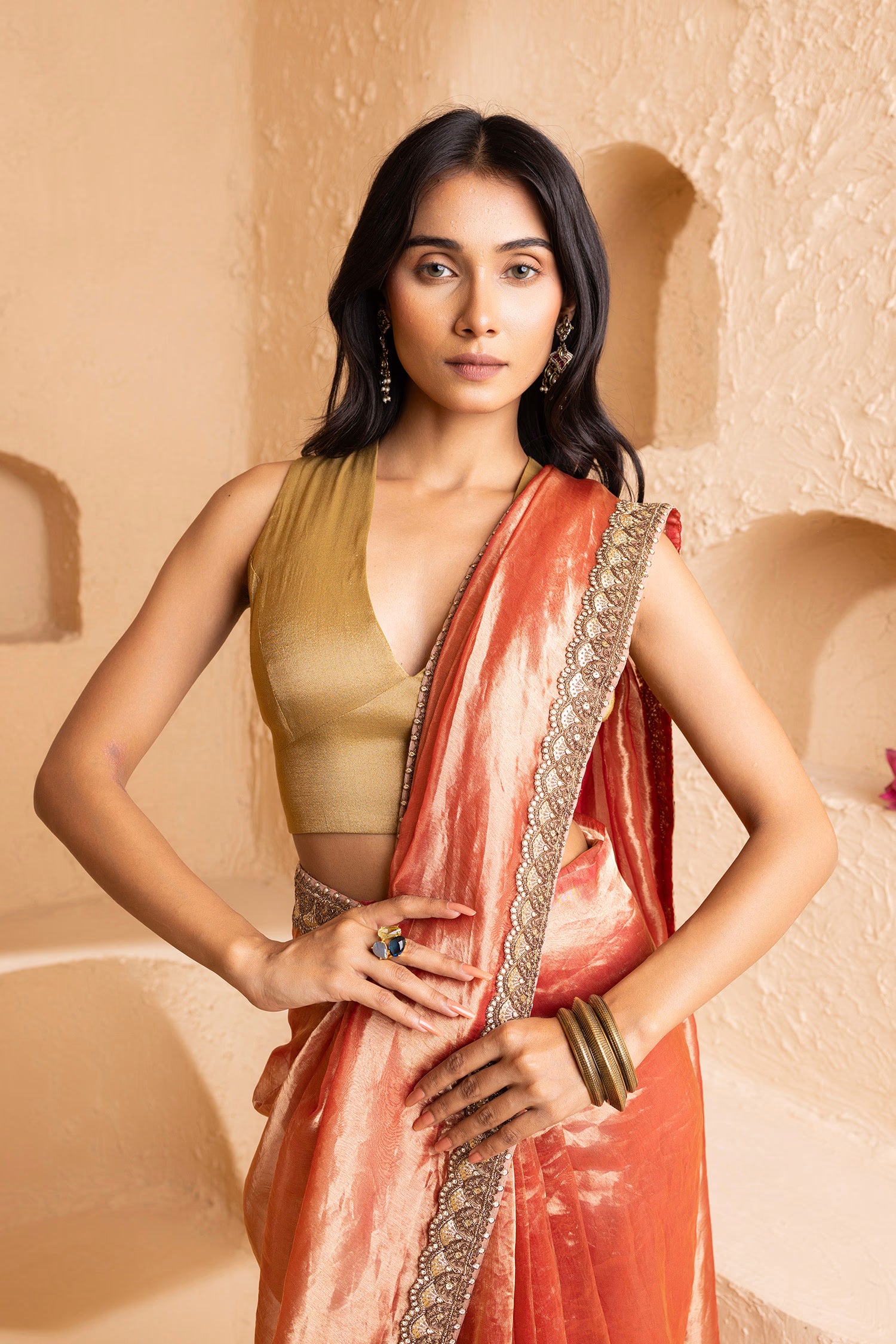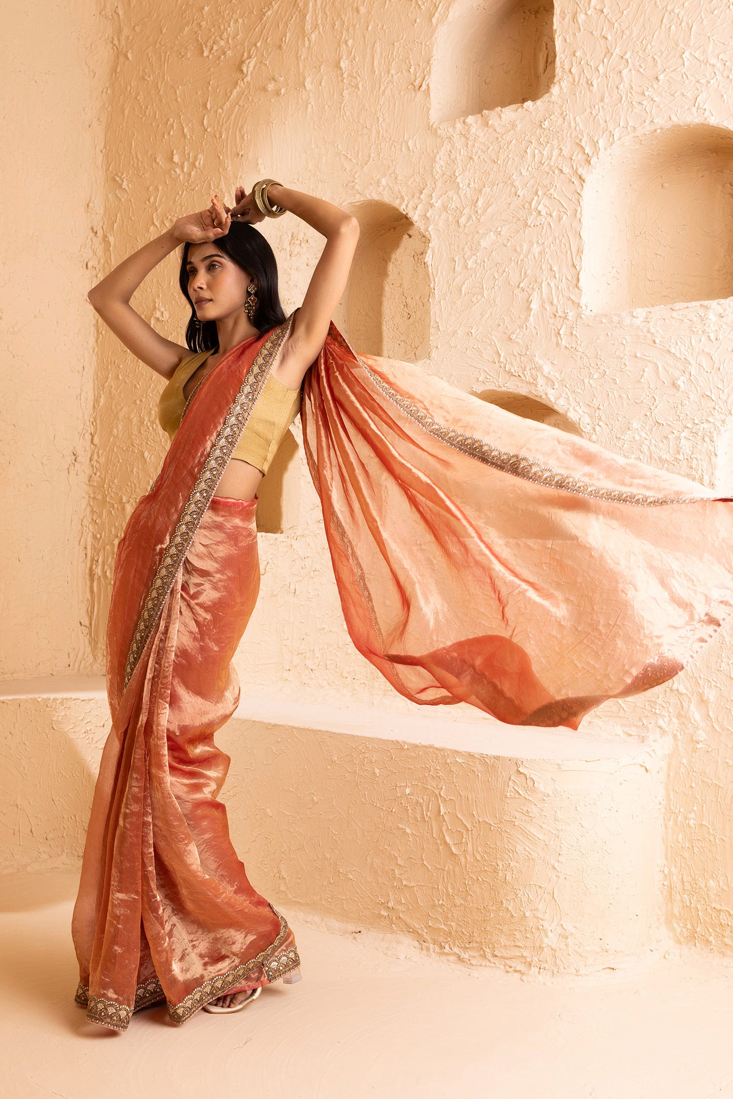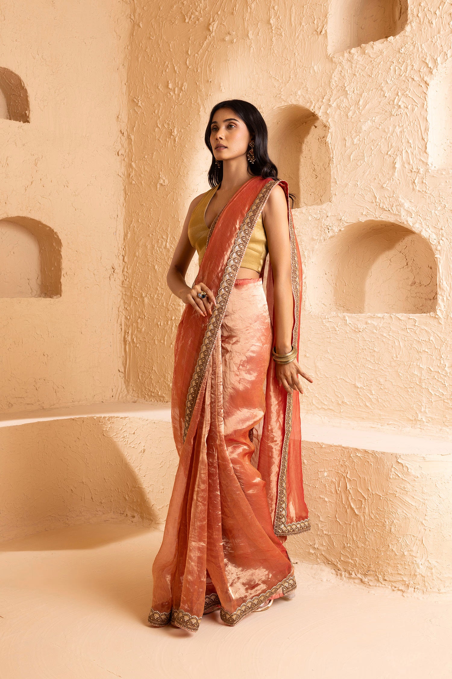 This sheen and delicate texture of the Pink silk tissue saree has a border which is embellished with sequins forming a inward scallop design at border complemented with unstitched dupion silk blouse piece making it special for your special occasions .