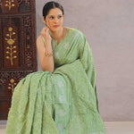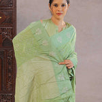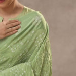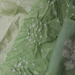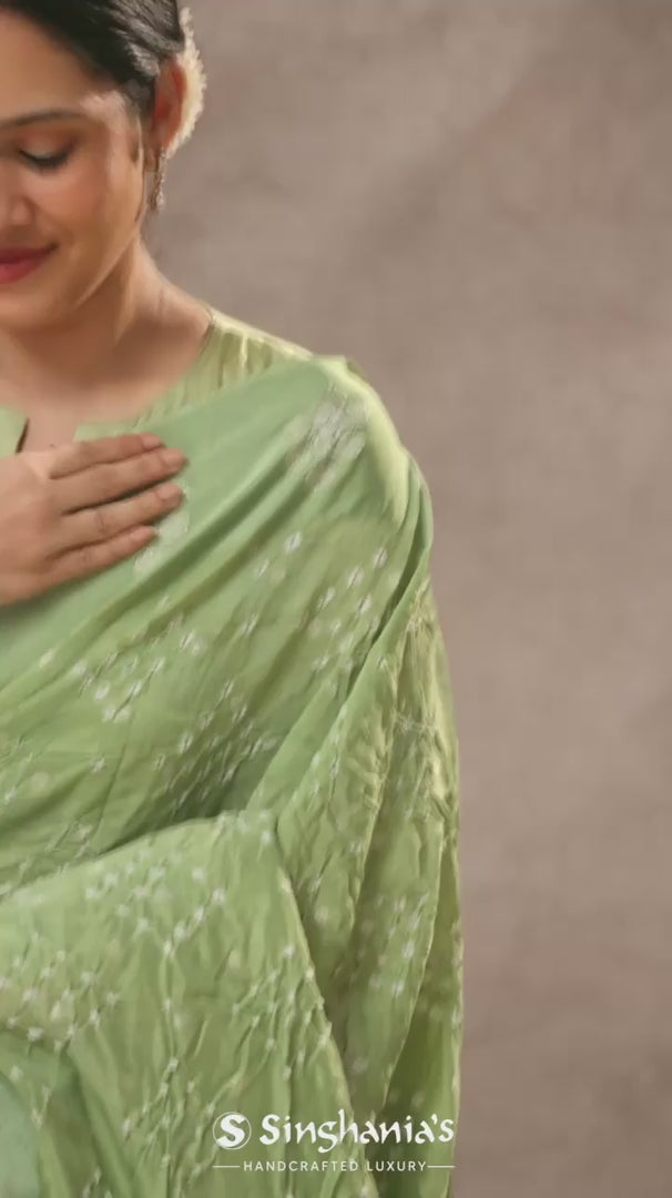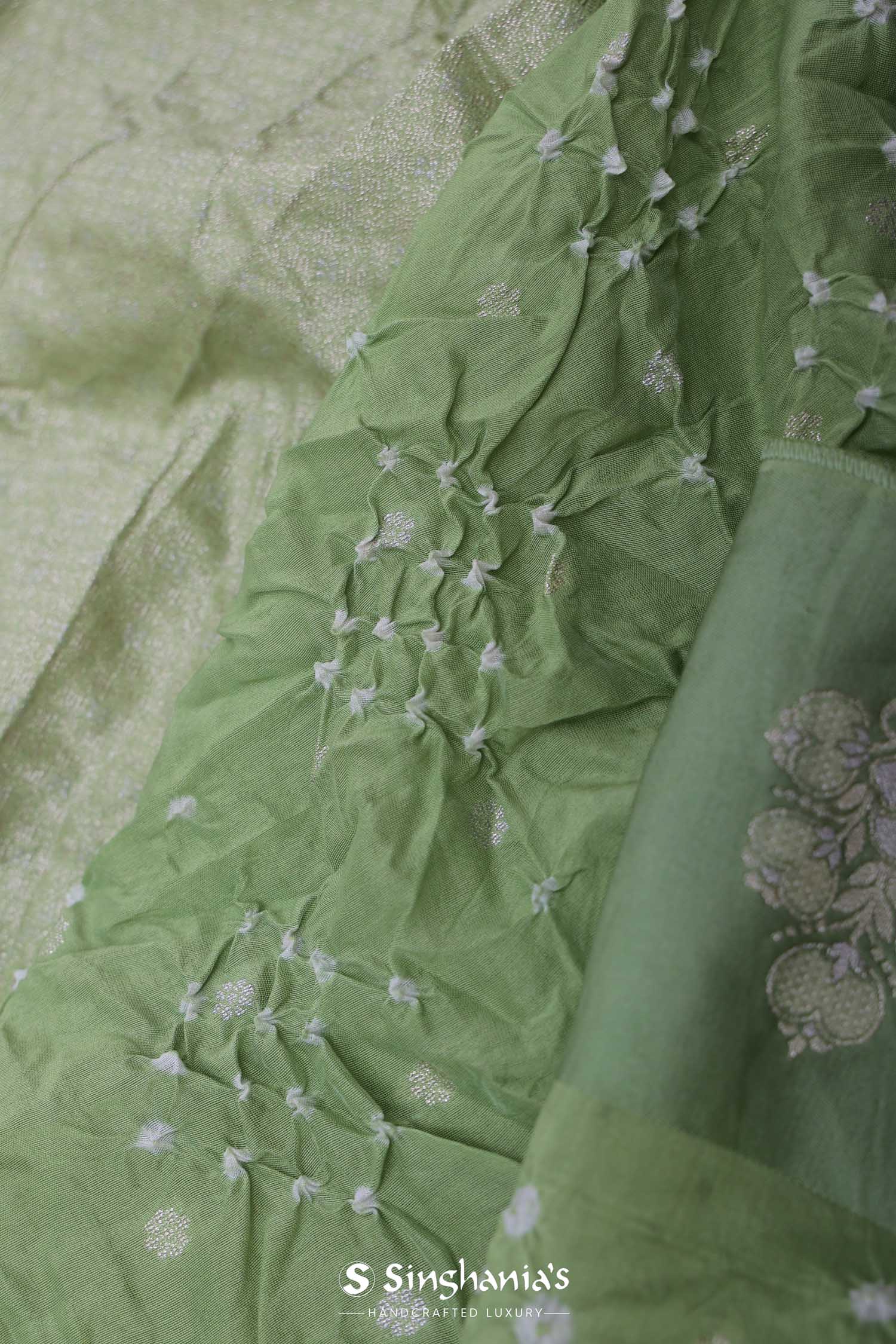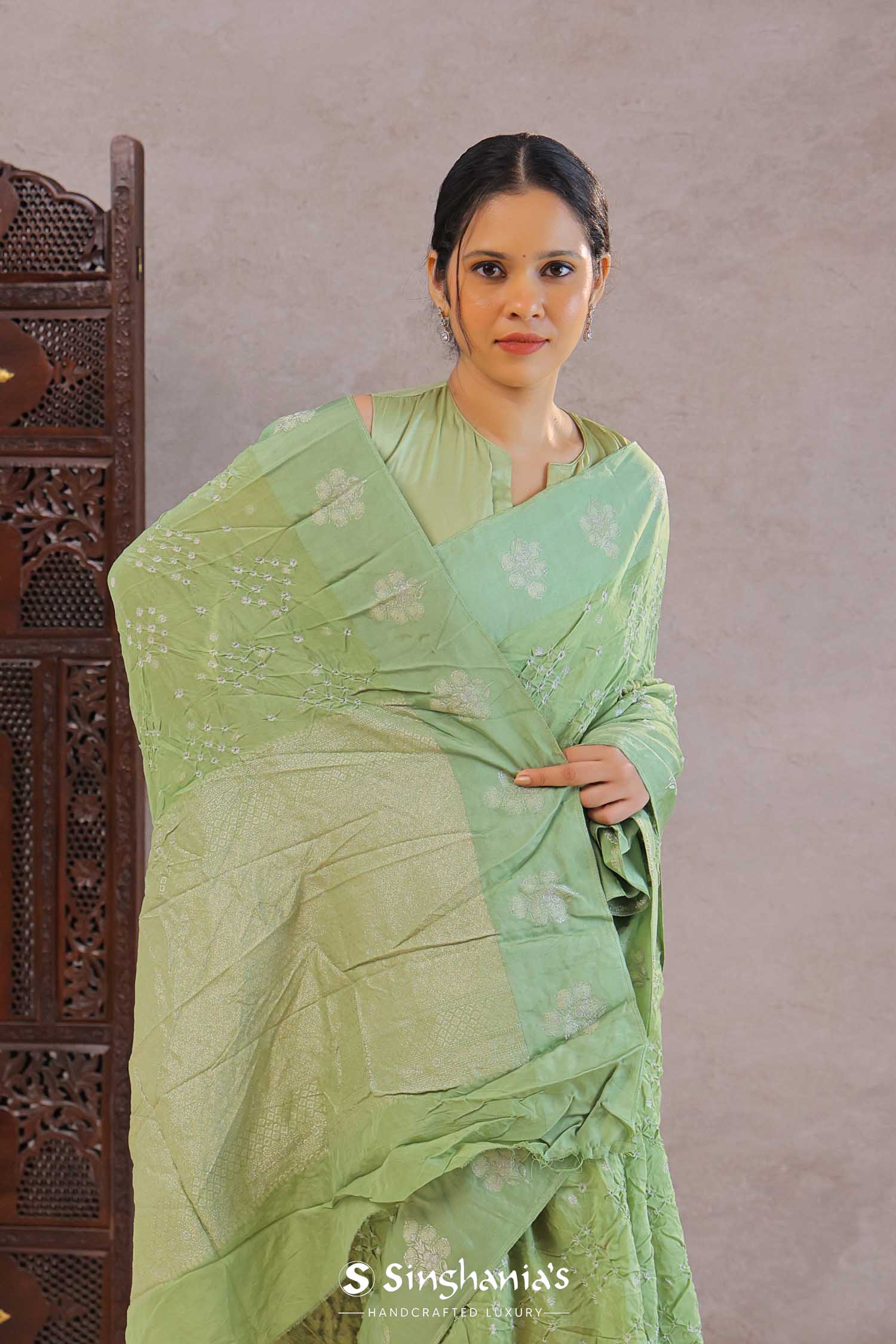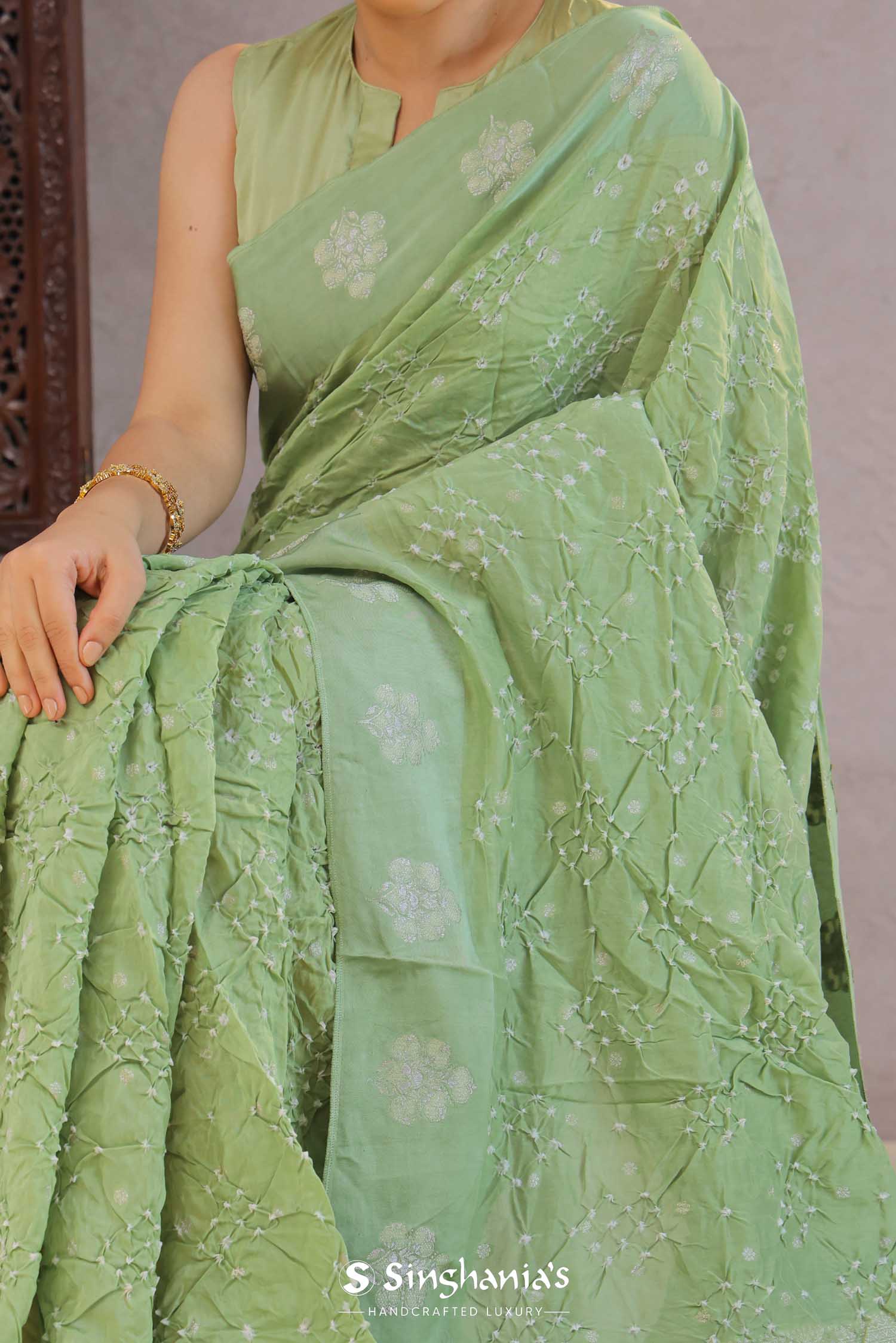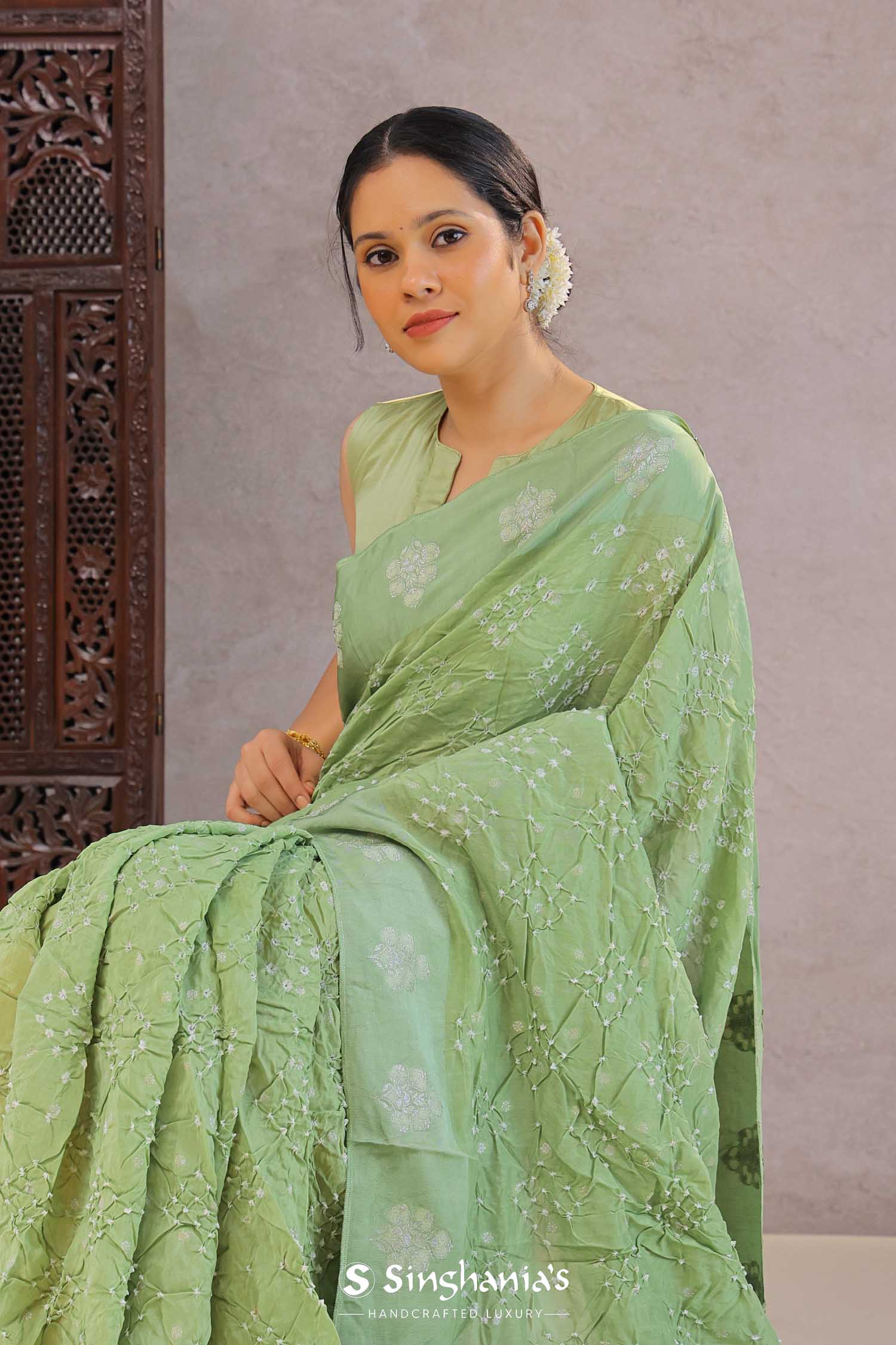 This dye pattern on Pista green bandhani silk saree with border featuring floral motifs is a ideal choice for any occasion.Making you satisfy with each drape