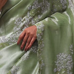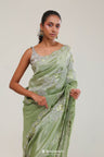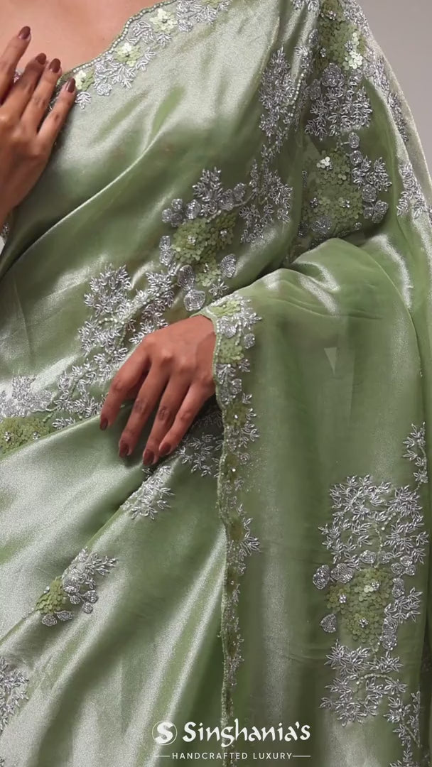 A soothing pistachio green tissue saree with floral jaal pattern on the body. The pallu and border are embellished with a floral pattern in sequins and glass beads embroidery, which accentuates the whole look. Suitable for festive wear and wedding parties.