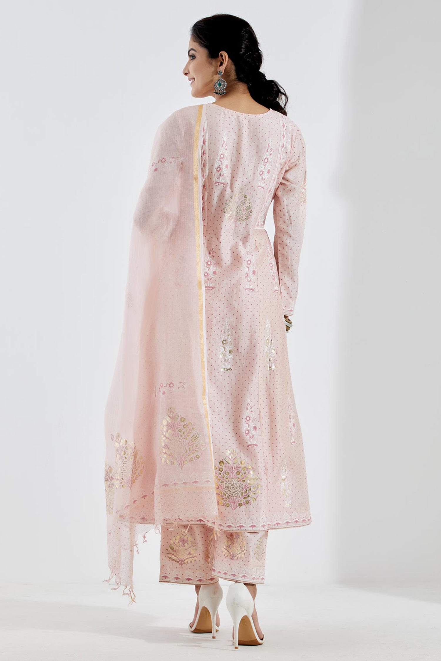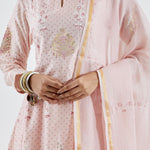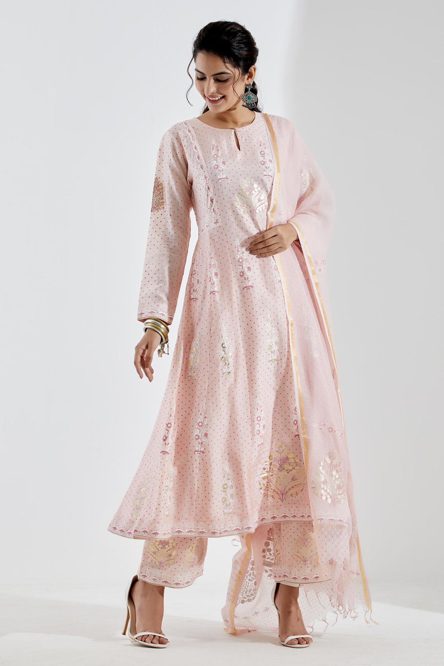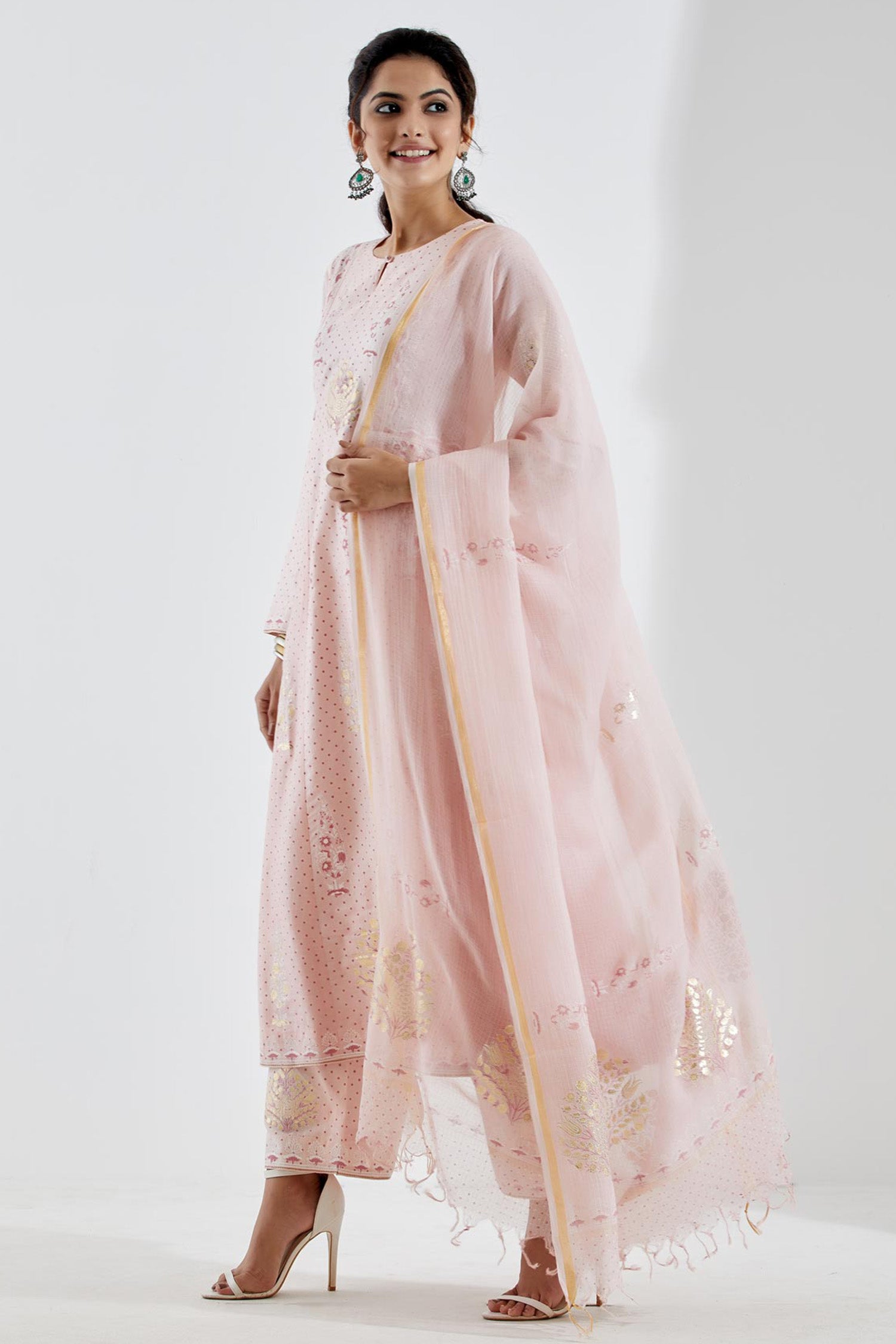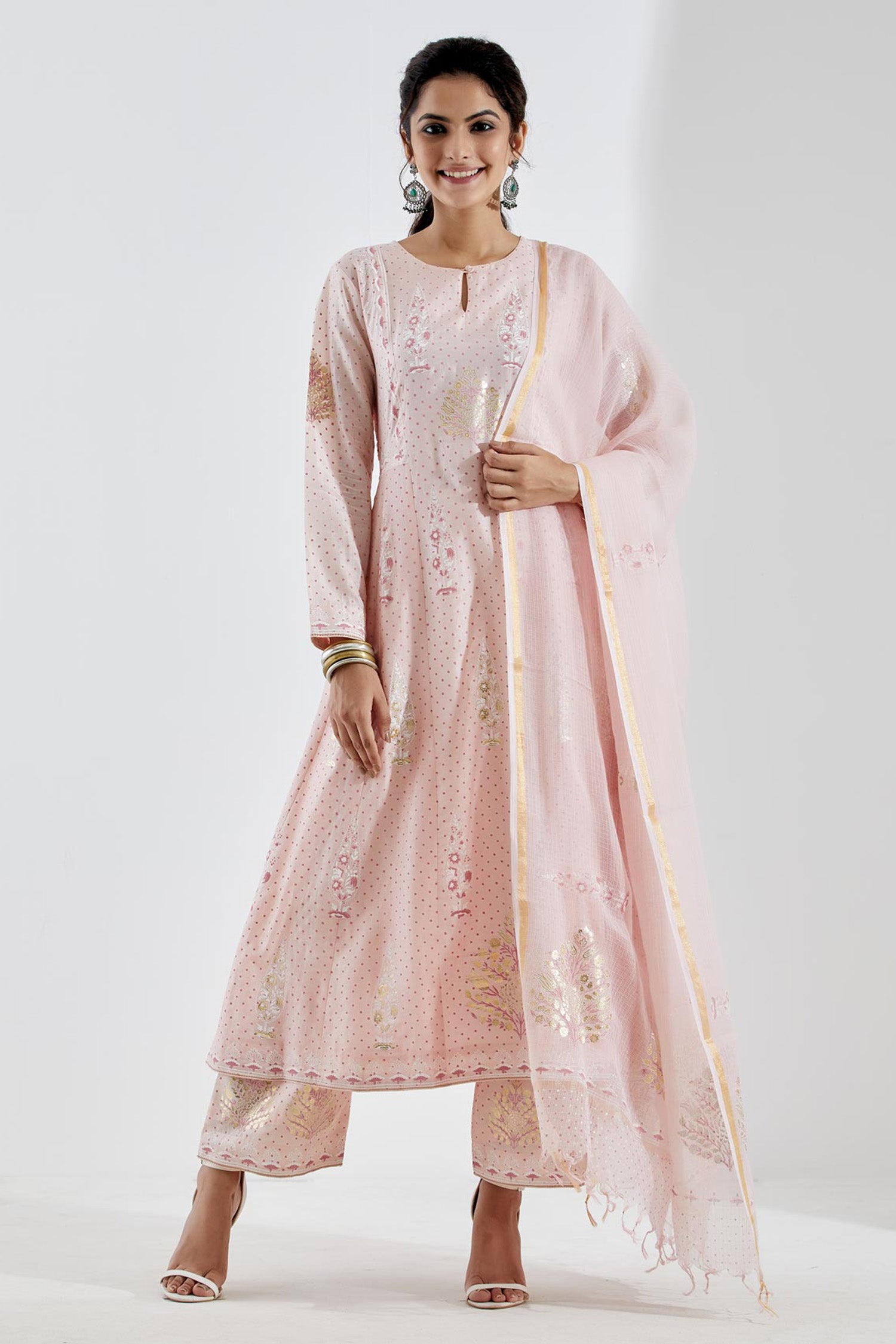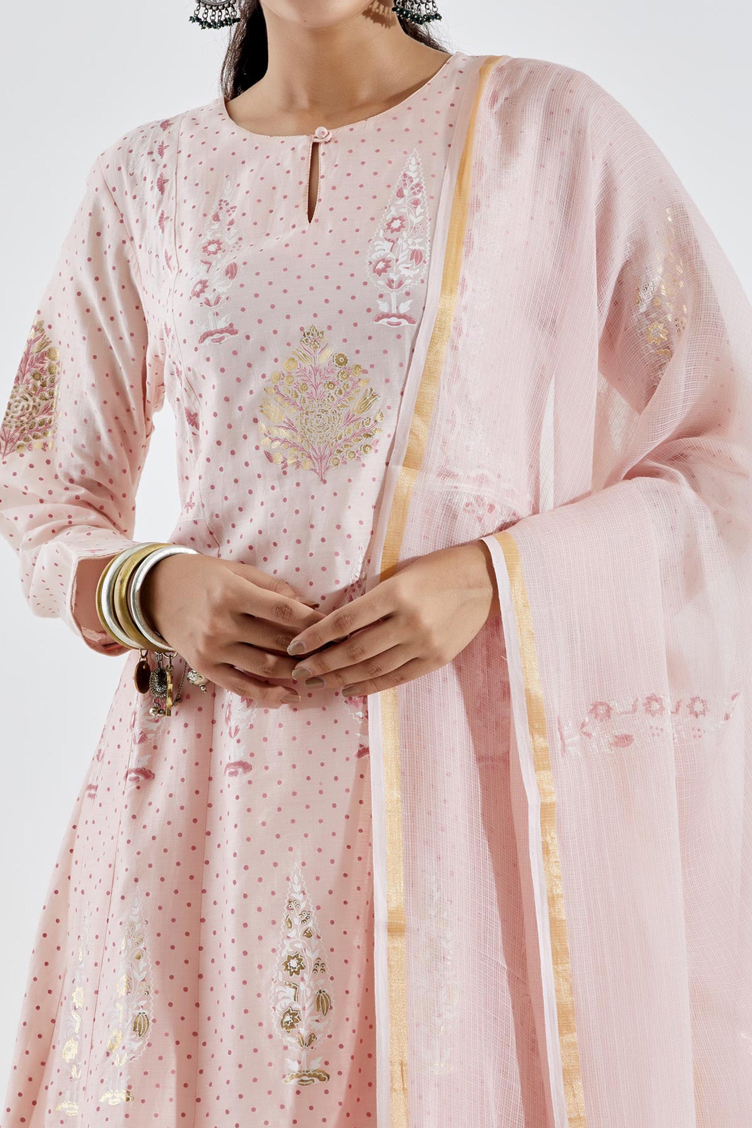 The cotton silk Kurti set with subtle foil printed floral patterns along with the matching dupatta with lace and subtle golden and silver printed design for an charismatic and stand out look.