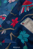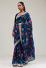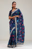 A beautiful prussian blue organza designer saree with floral jaal design all over in colourful jamdani-styled threadwork embroidery. Accentuated with small munia-inspired embroidery border, this saree is suitable for festive and wedding occasions.