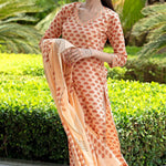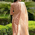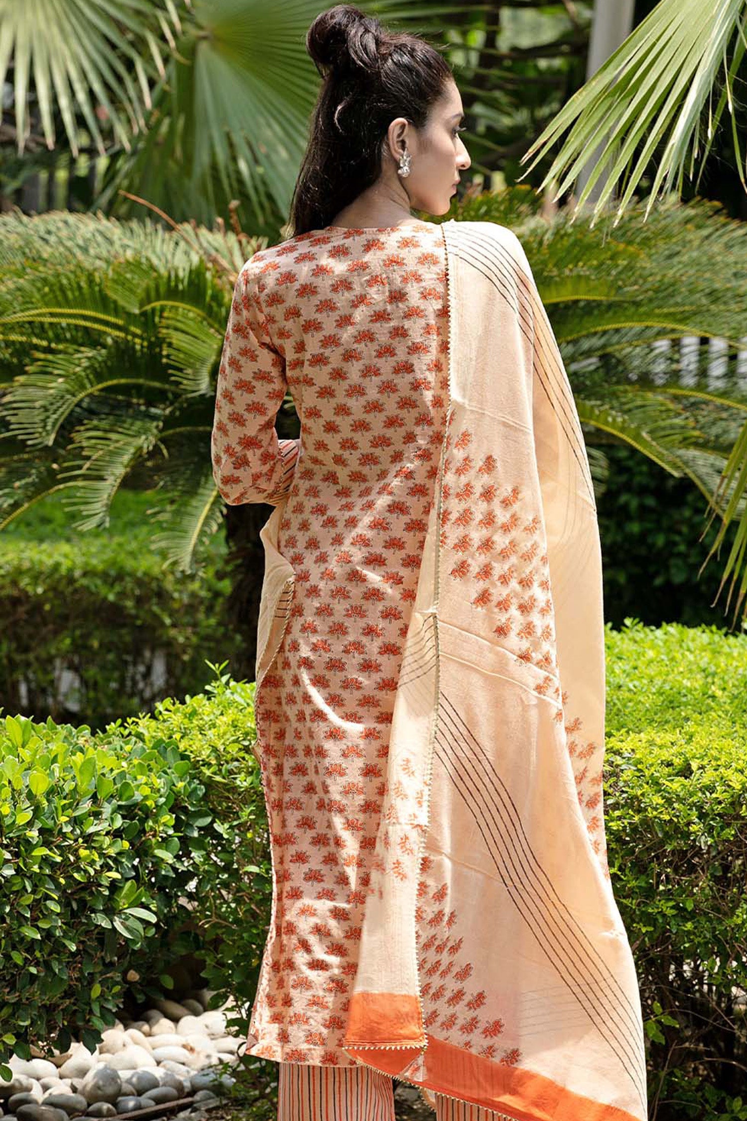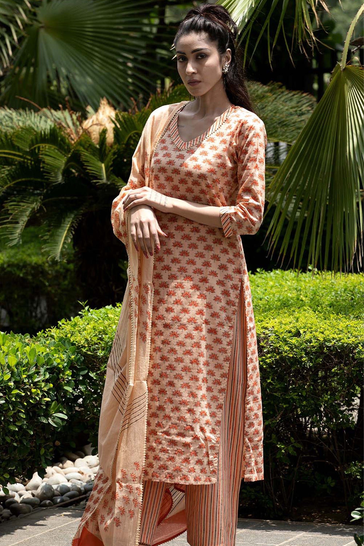 The elegant Light orange kurta set crafted from the pure cotton with the block floral print pattern along with a striped pattern bottom and a matching dupatta with it's soft pattern gives it a comfortable and stylish look.