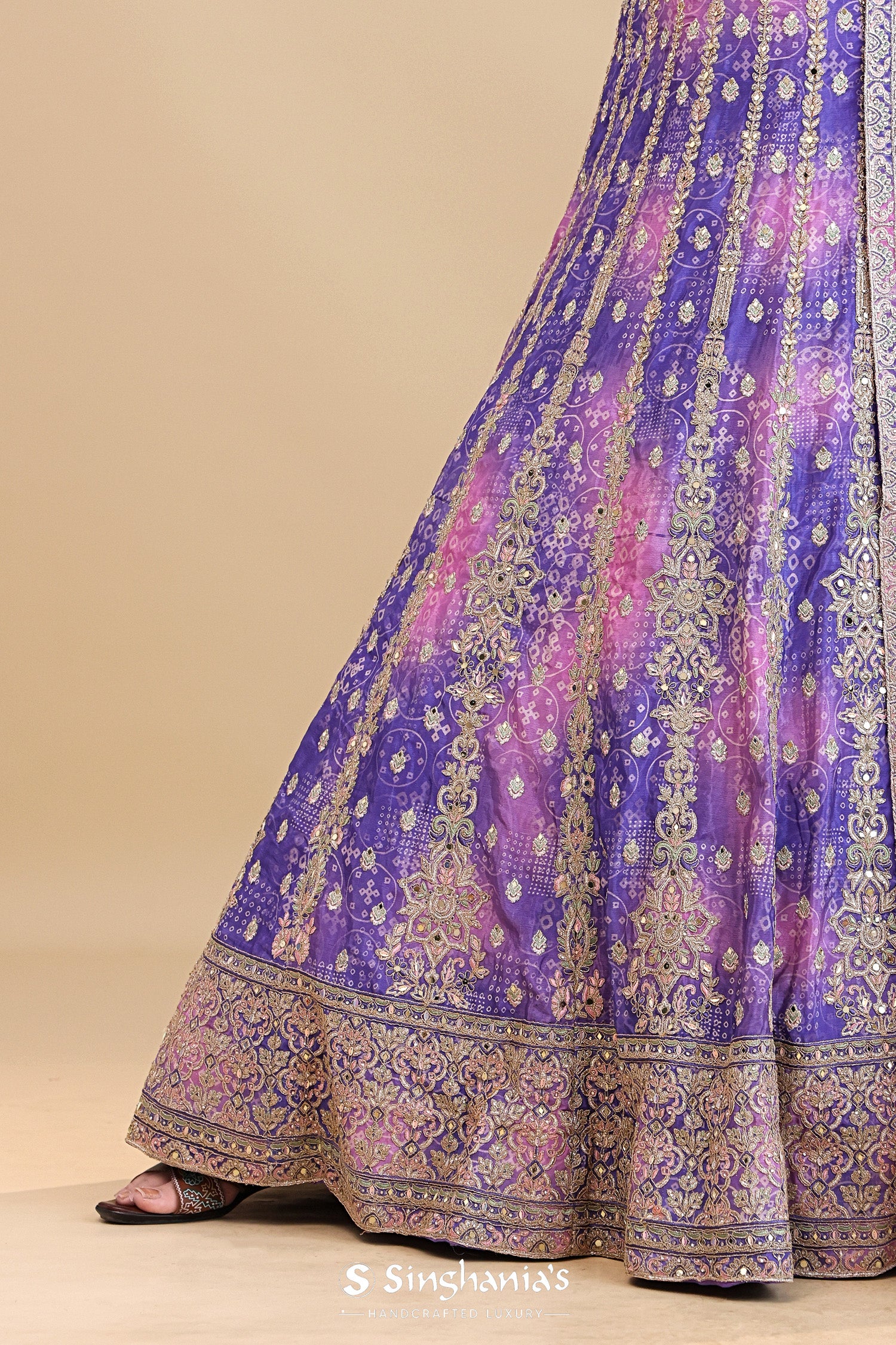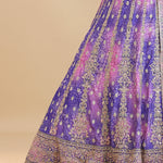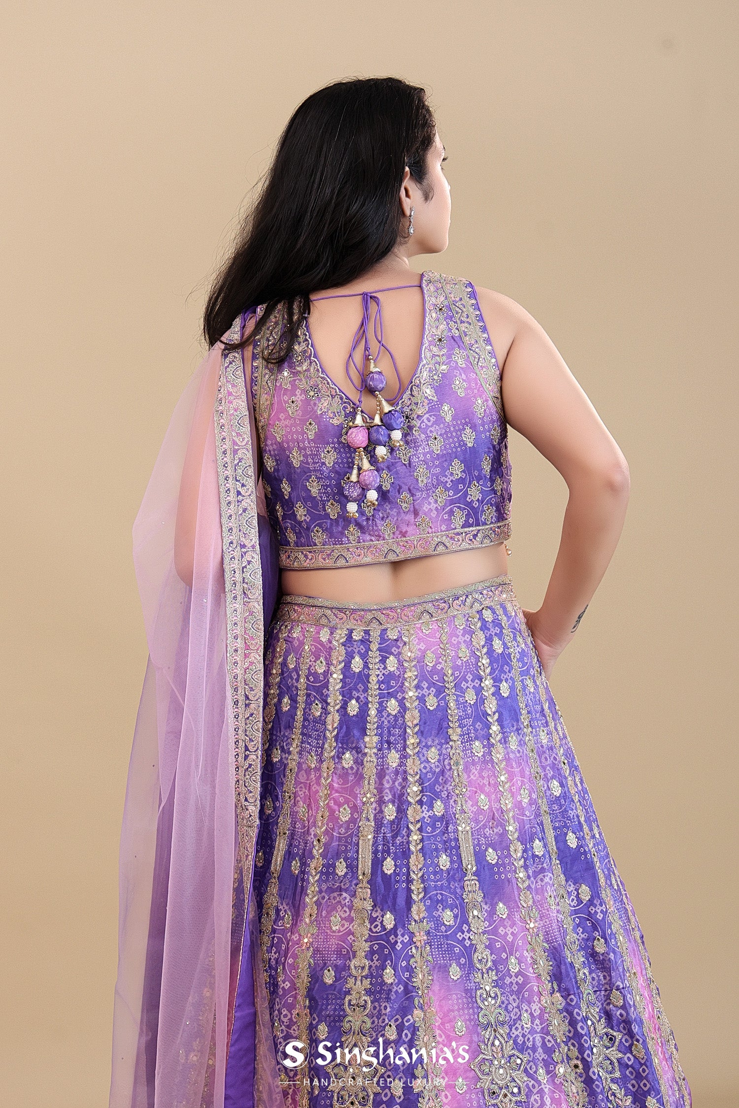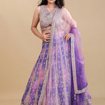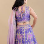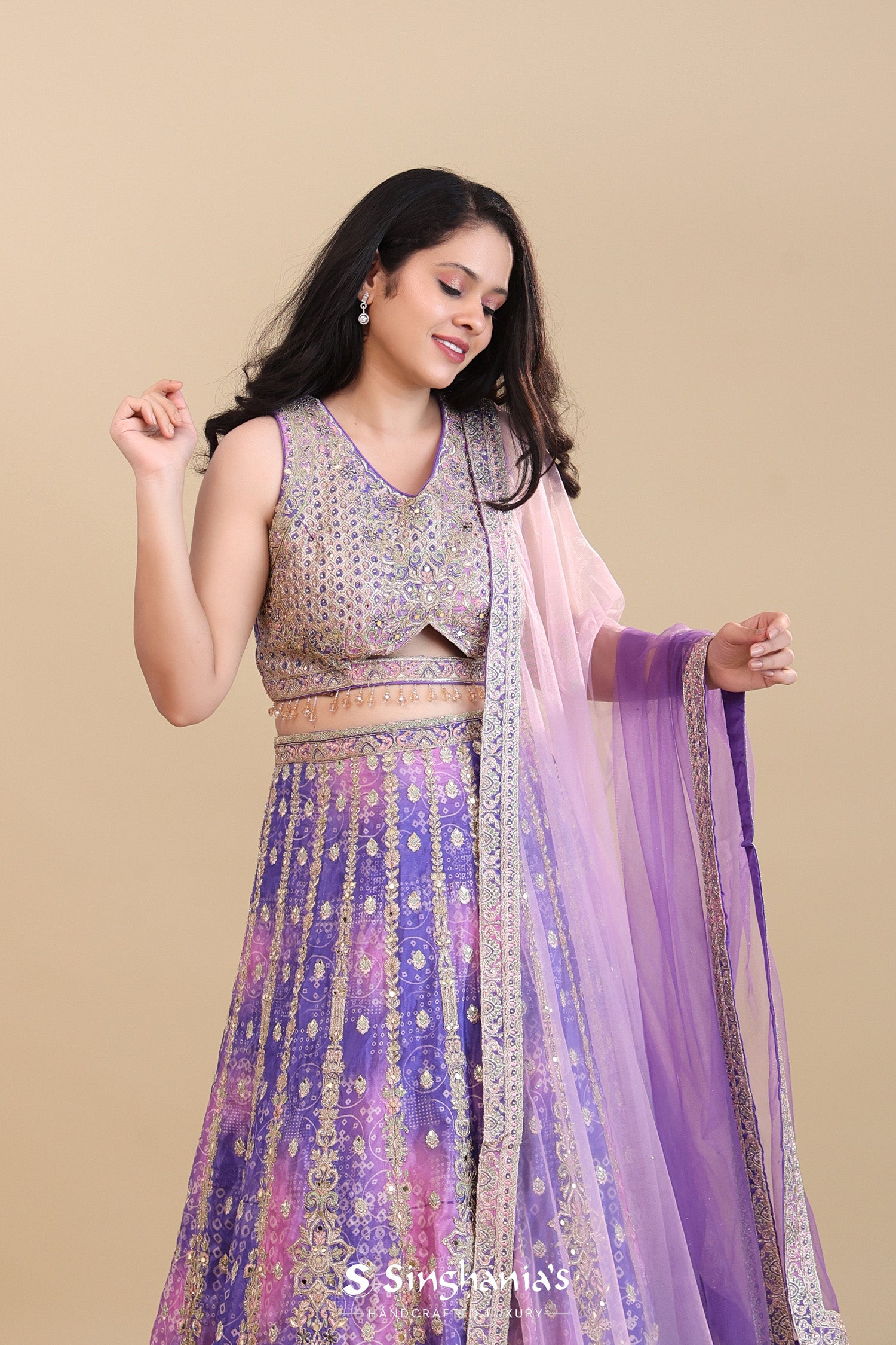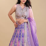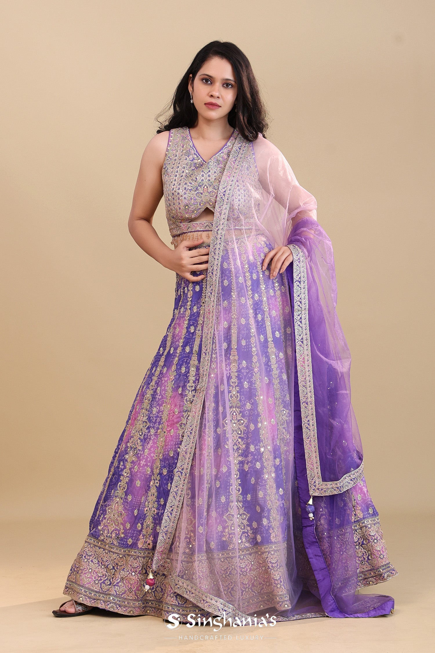 The V neckline of the crop top of Purple chinon silk lehenga set adorned with embroidery work along with beautiful two color lehenga zari embroidery . The netted dupatta adds the finishing touch to the garment