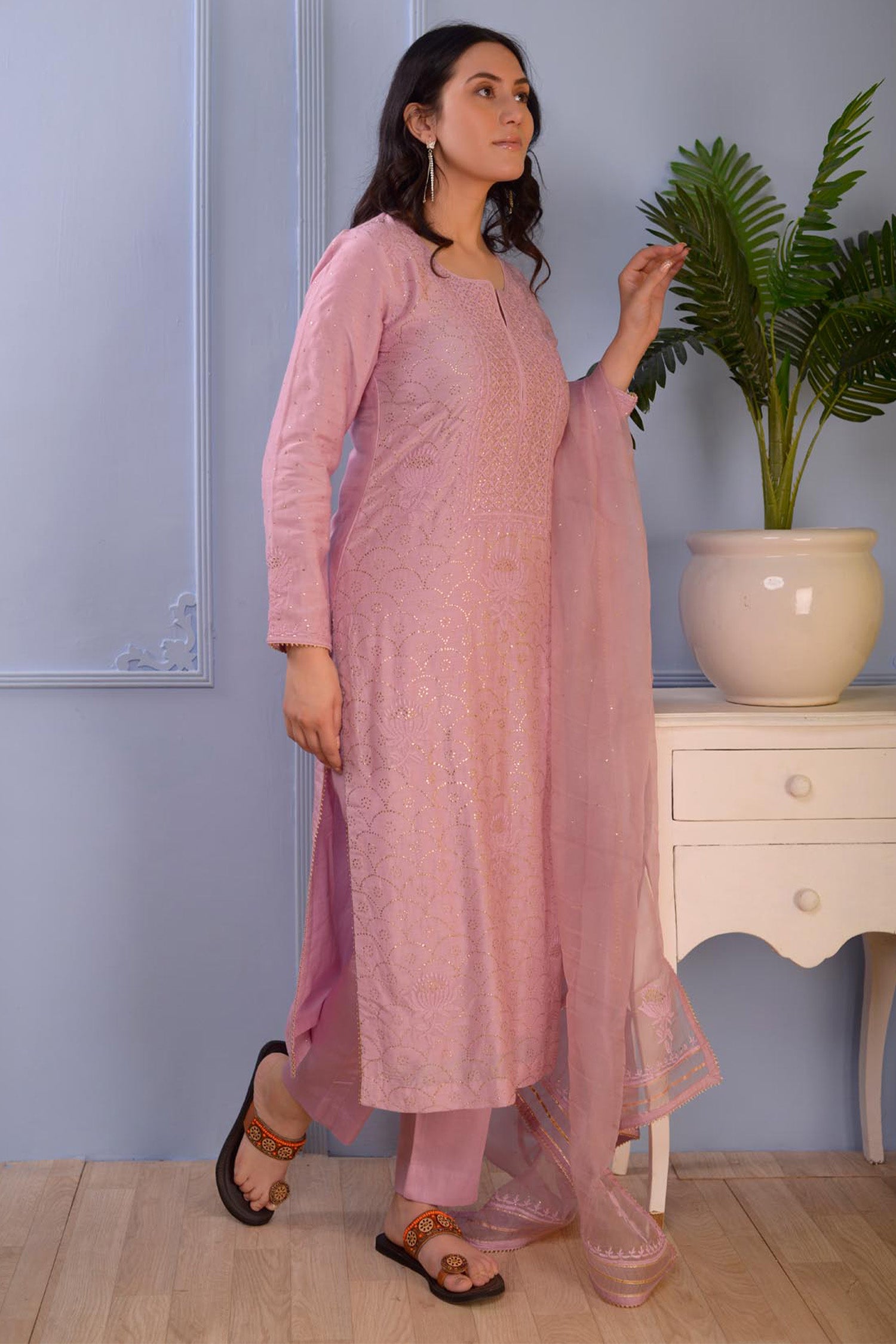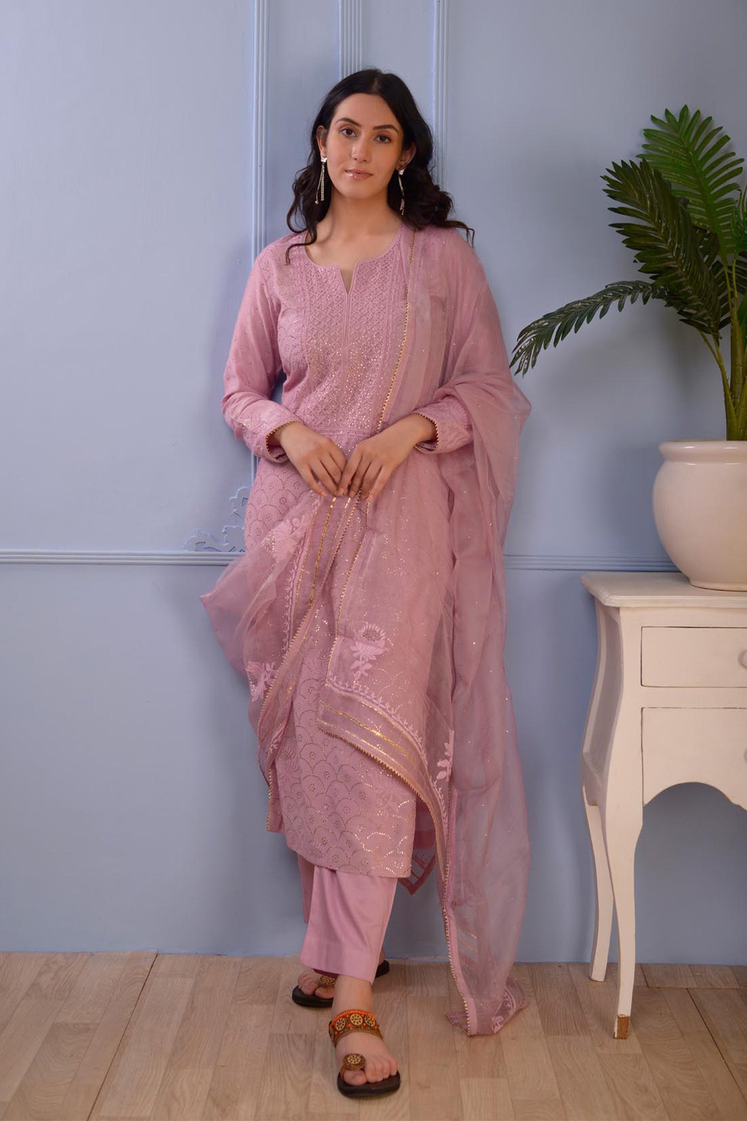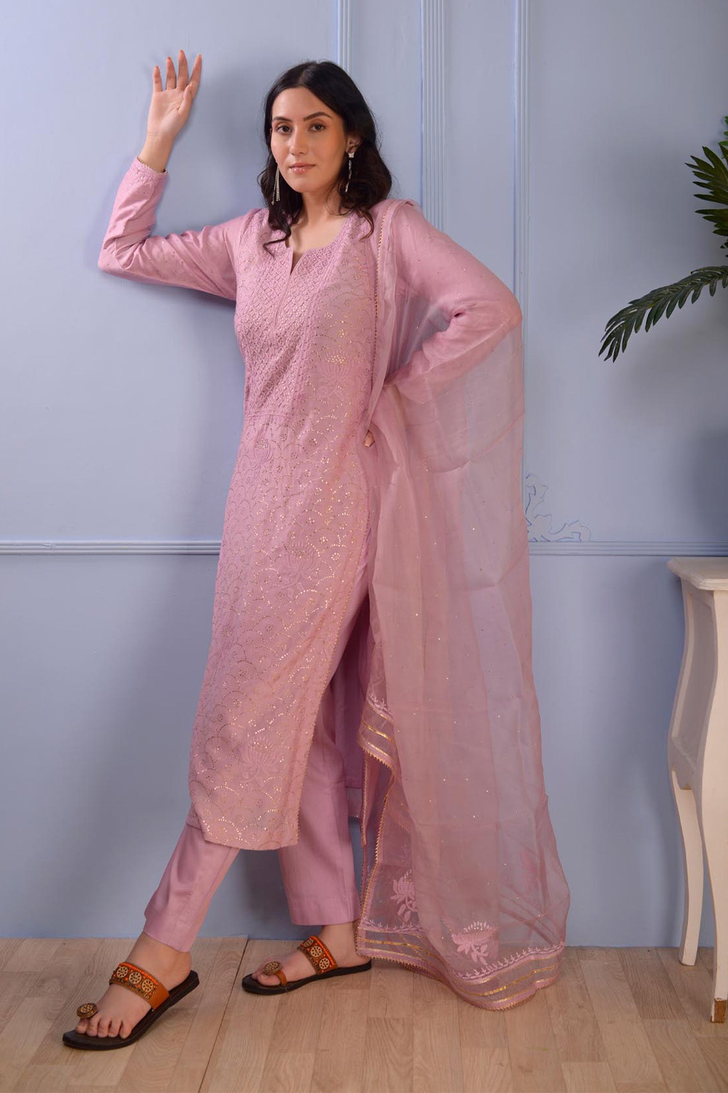 The Straight Kurta set includes the Cotton Silk Lucknowi Kurta With Gotta Finish and an Organza Dupatta With Lace Finish for a Vibrant Look .
