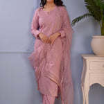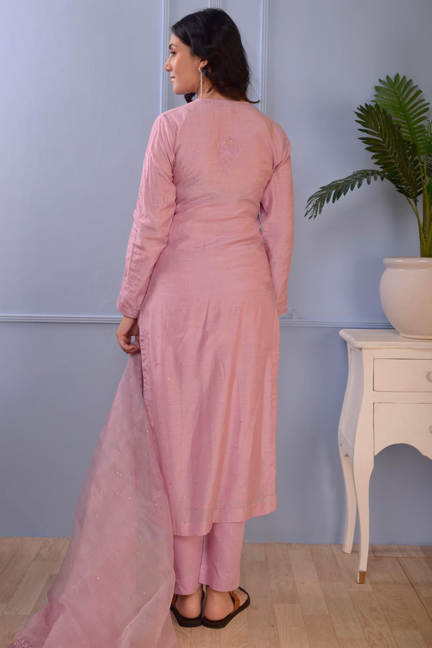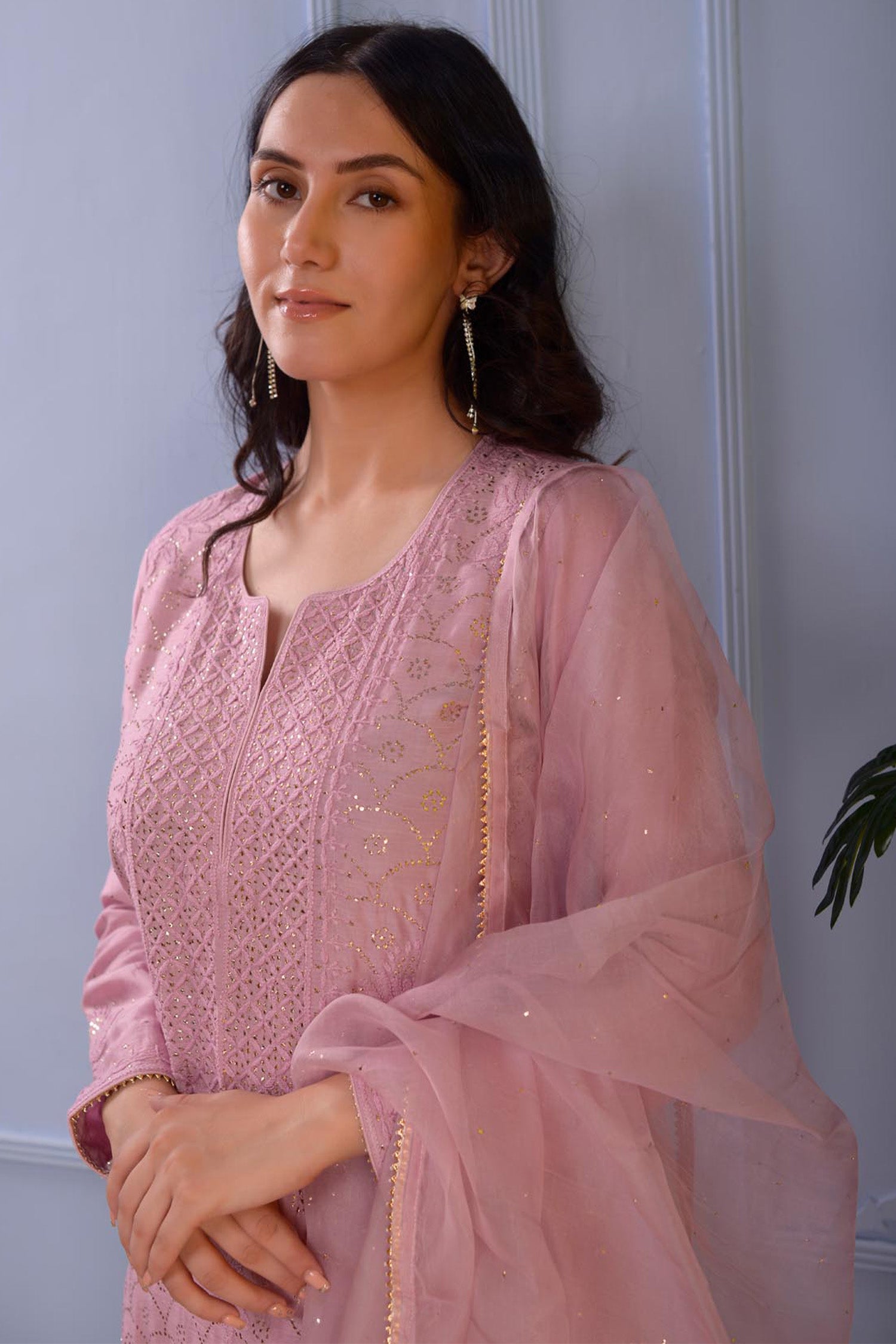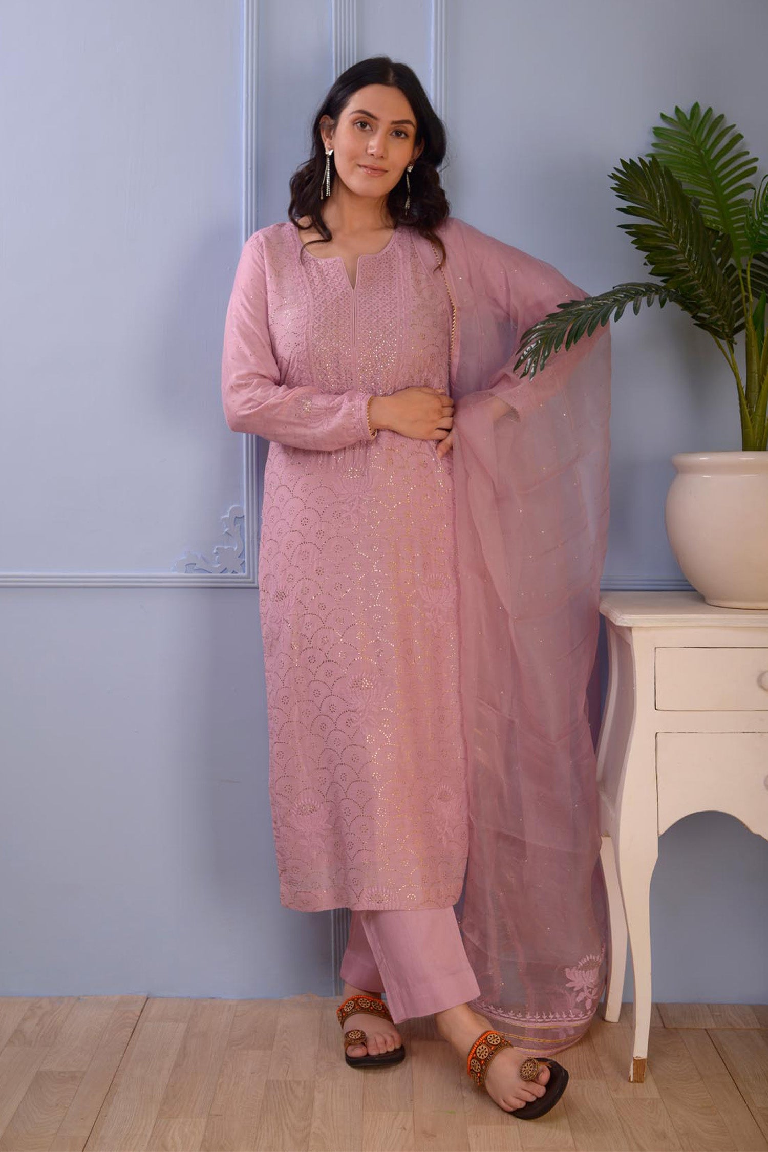 The Straight Kurta set includes the Cotton Silk Lucknowi Kurta With Gotta Finish and an Organza Dupatta With Lace Finish for a Vibrant Look .