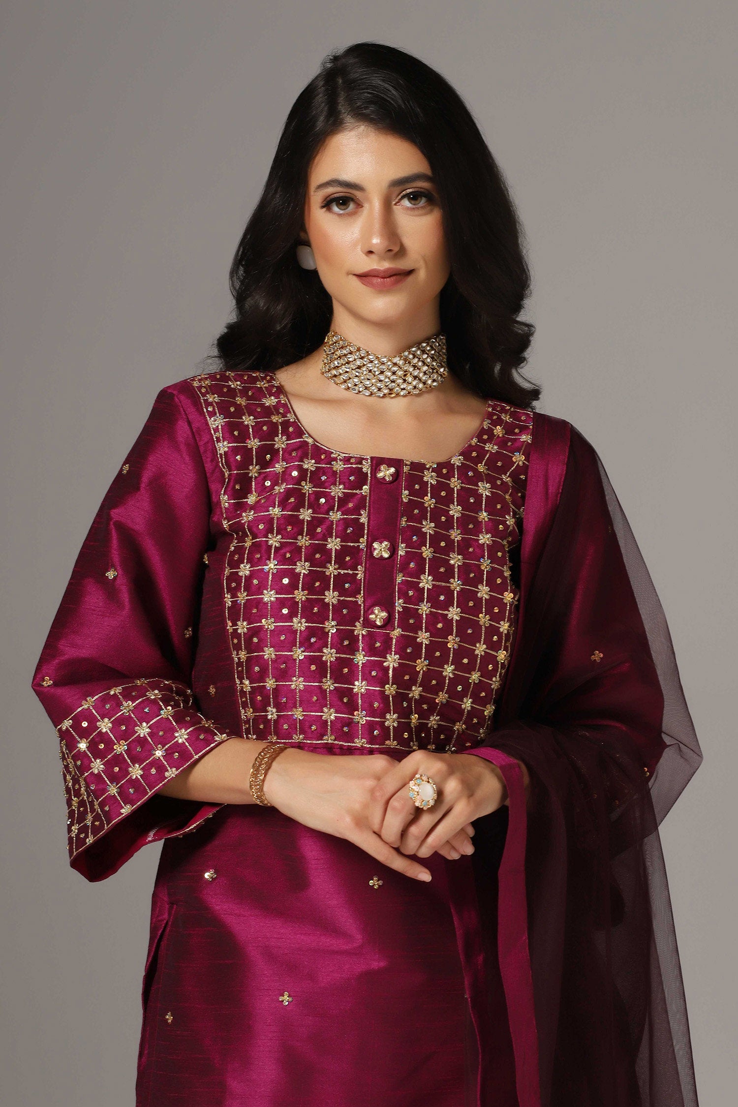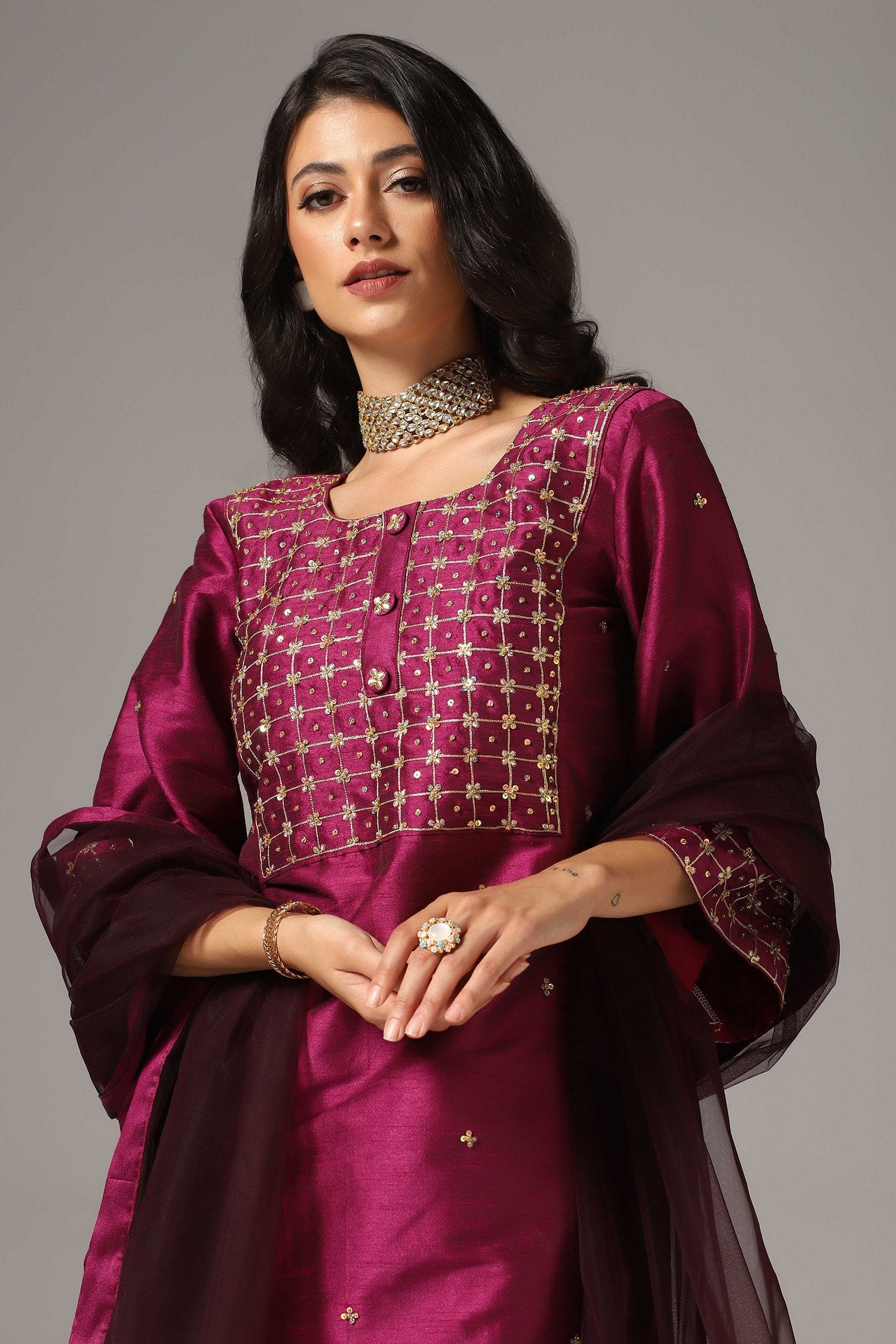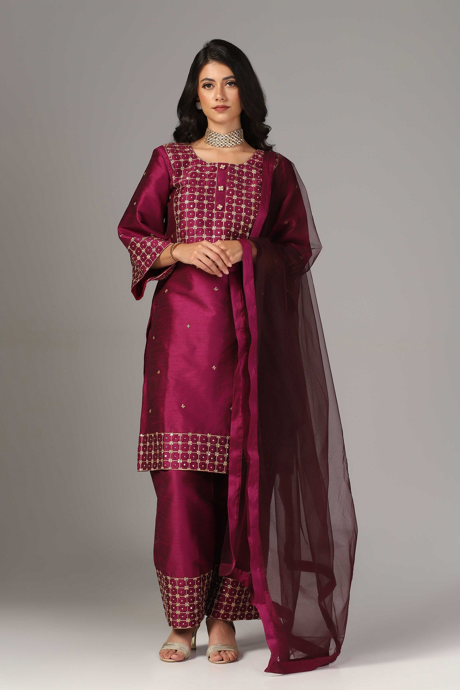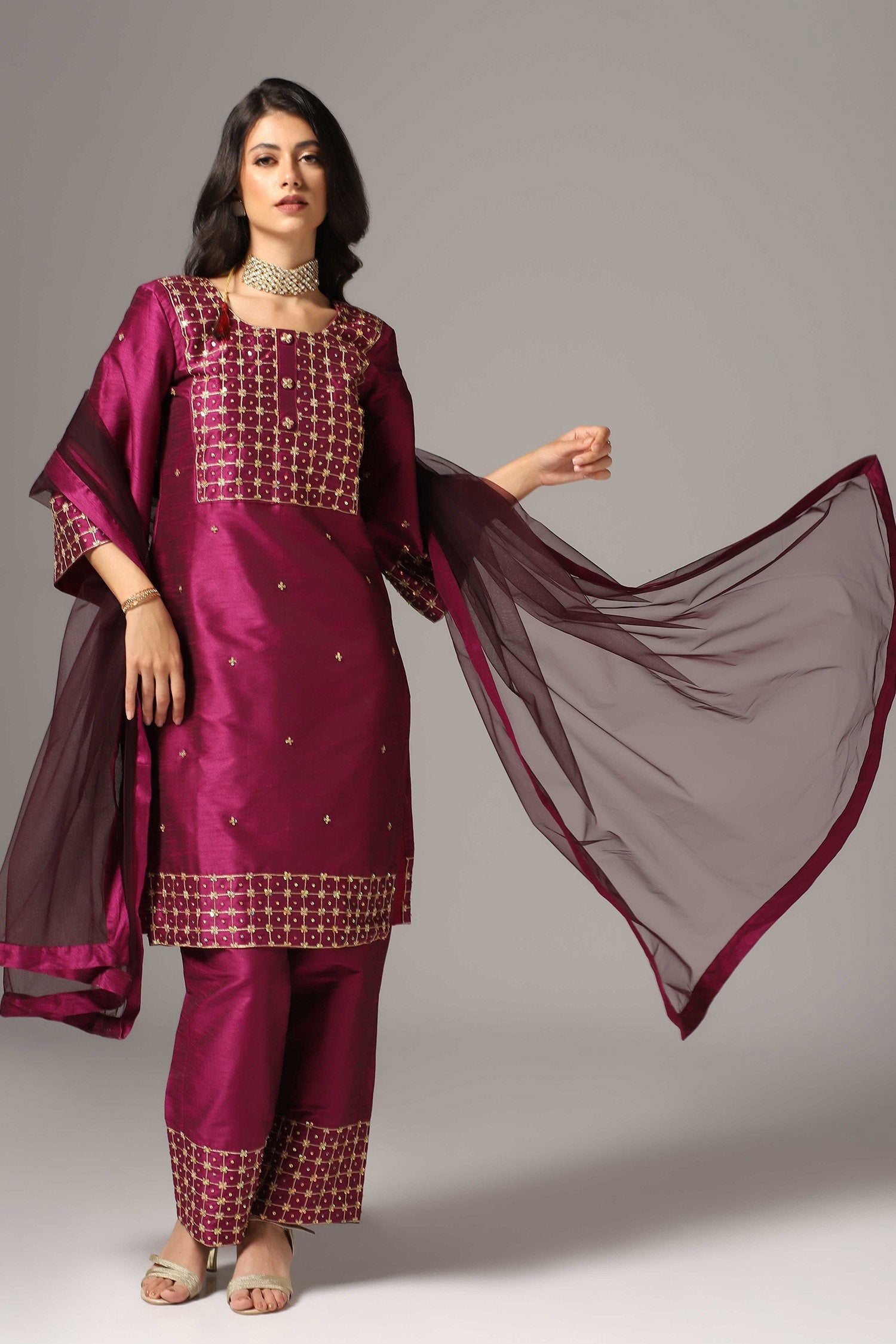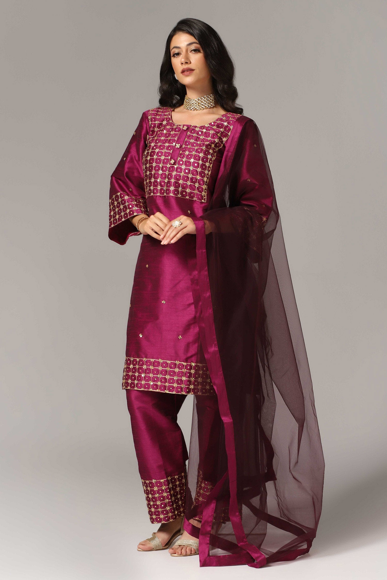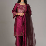 The purple raw silk gold zari embroidered and hand crafted with sequence work kurti with palazzo pants and dupatta for an elegant look.