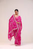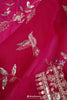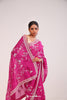 This delightful organza saree in rani pink colour has floral-butterfly jaal embroidery with intricately embroidered floral pattern, border and pallu, in silver sequins and glass beads. Suitable for festive wear, and wedding parties.