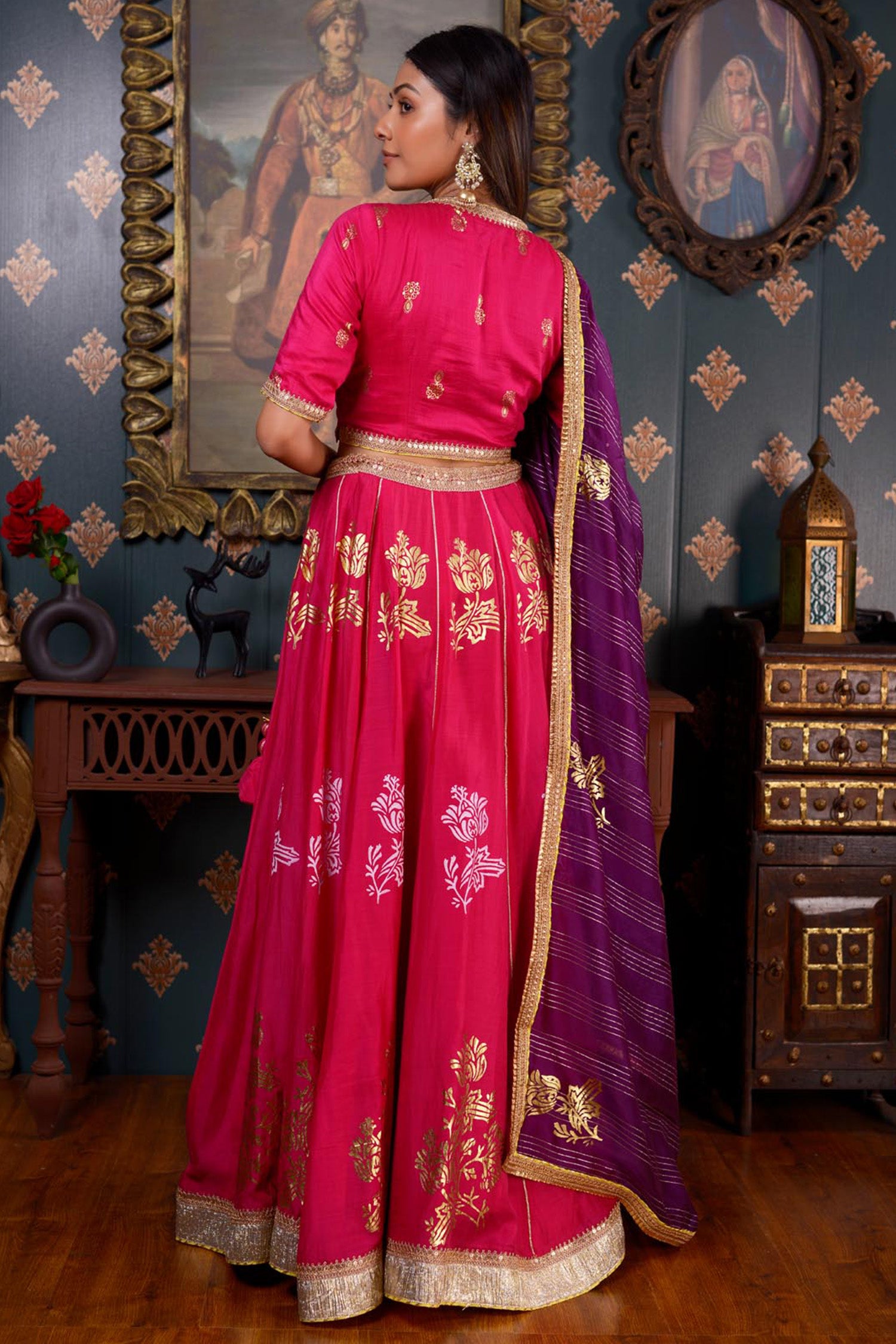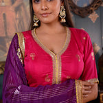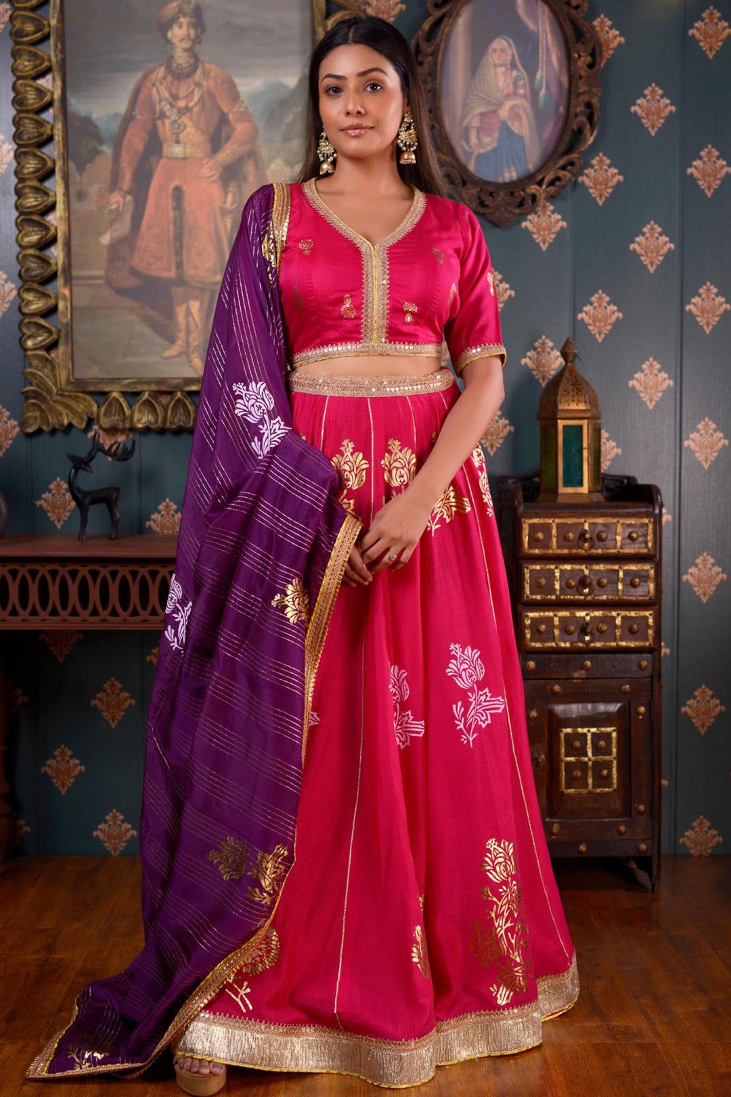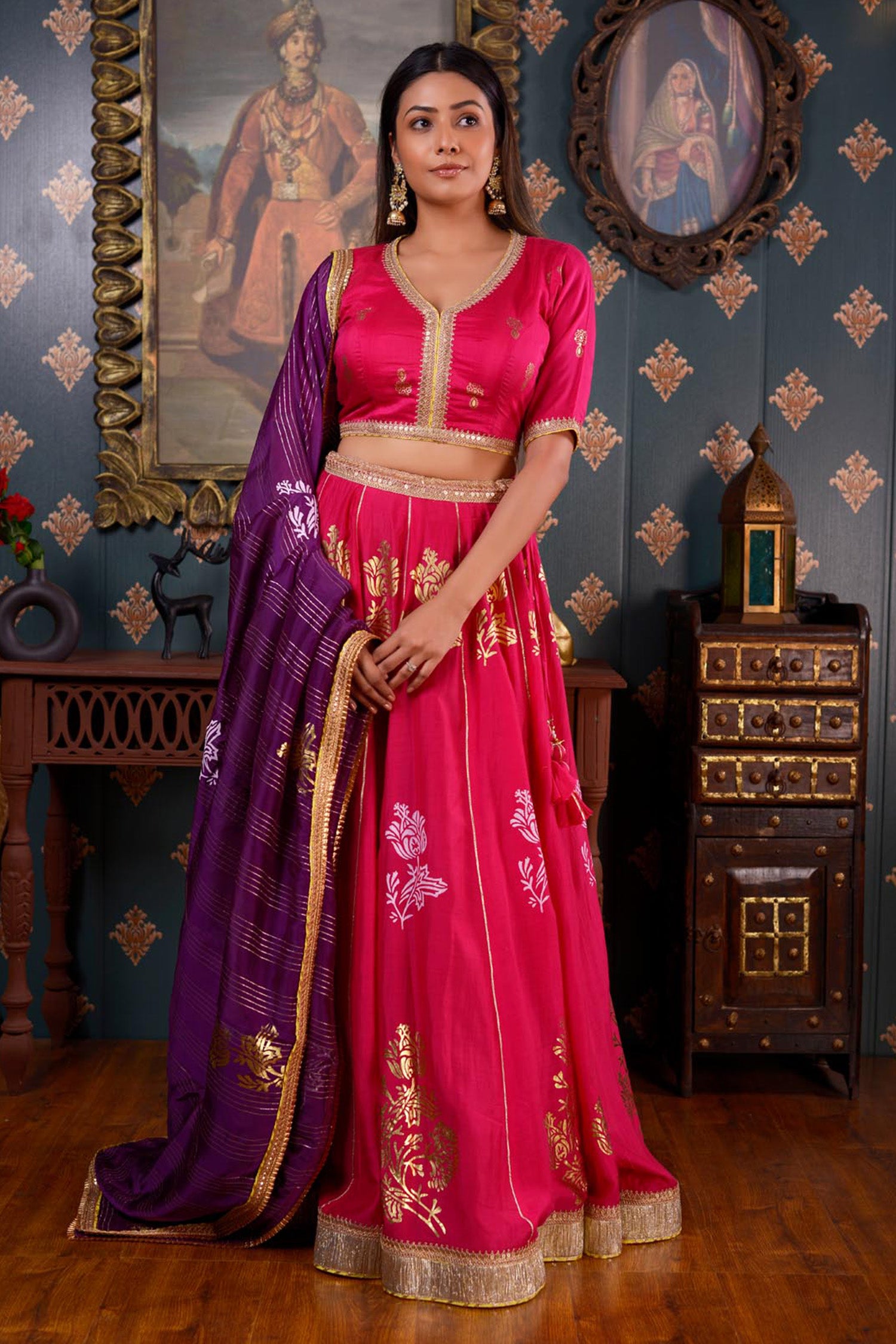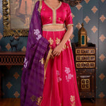 The Dark Pink Lehenga set includes a Print Cotton Silk Lehenga and a Blouse With Hand Embroidery Mirror Work Neck and a contrasting Organza Dupatta.