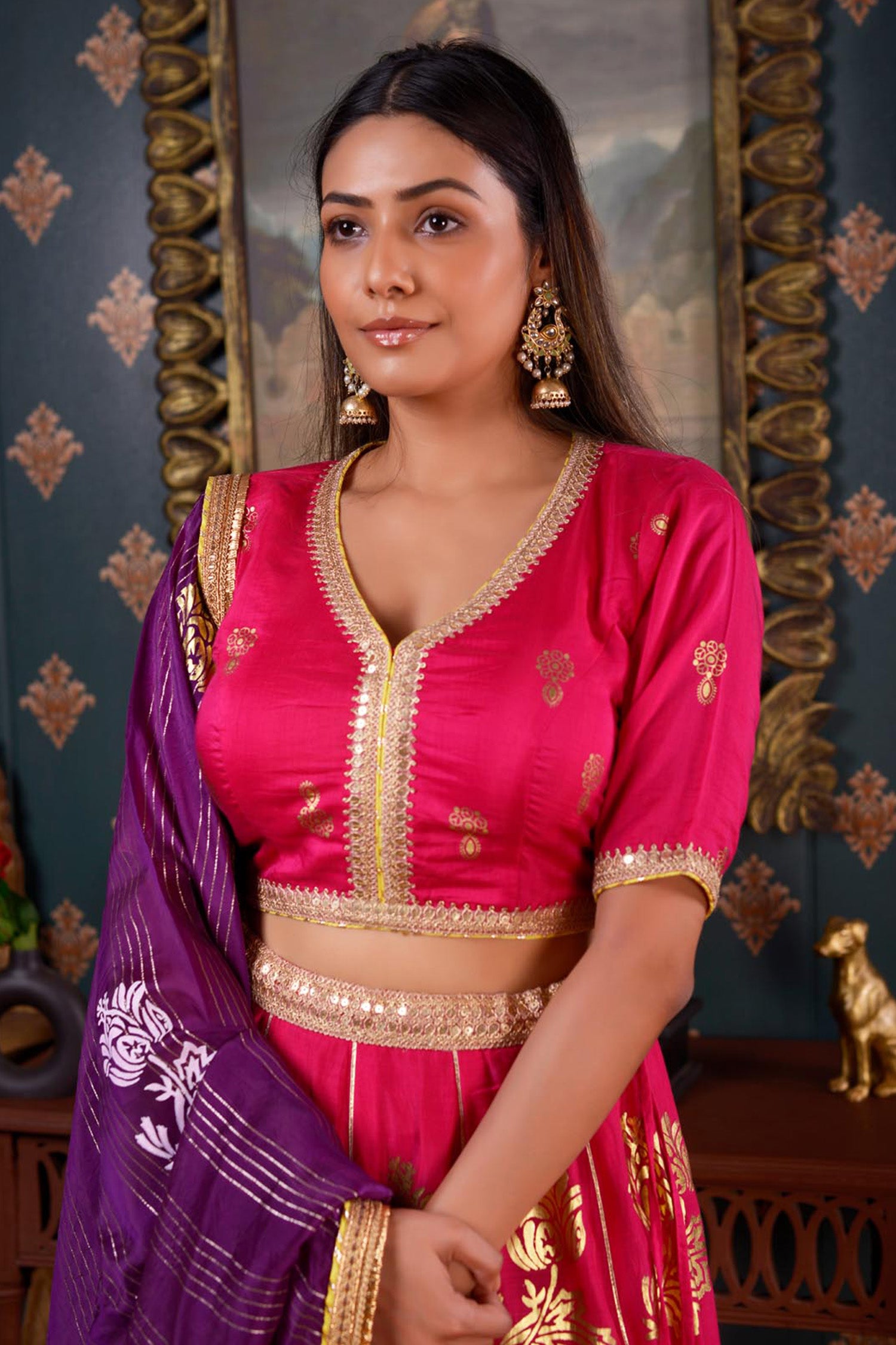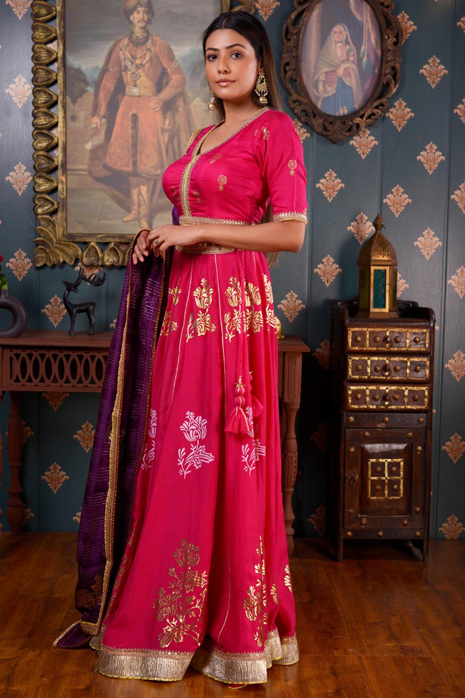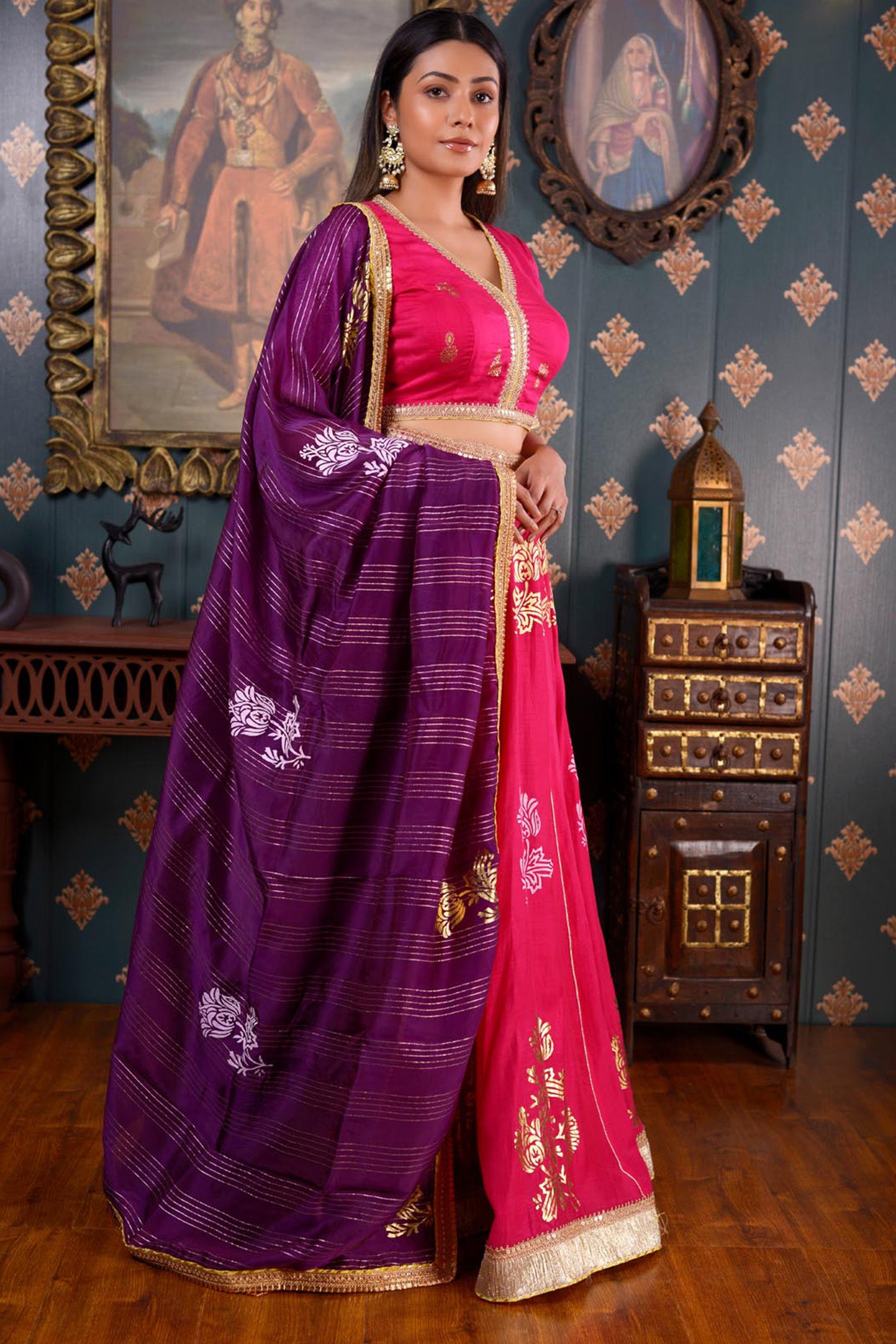 The Dark Pink Lehenga set includes a Print Cotton Silk Lehenga and a Blouse With Hand Embroidery Mirror Work Neck and a contrasting Organza Dupatta.