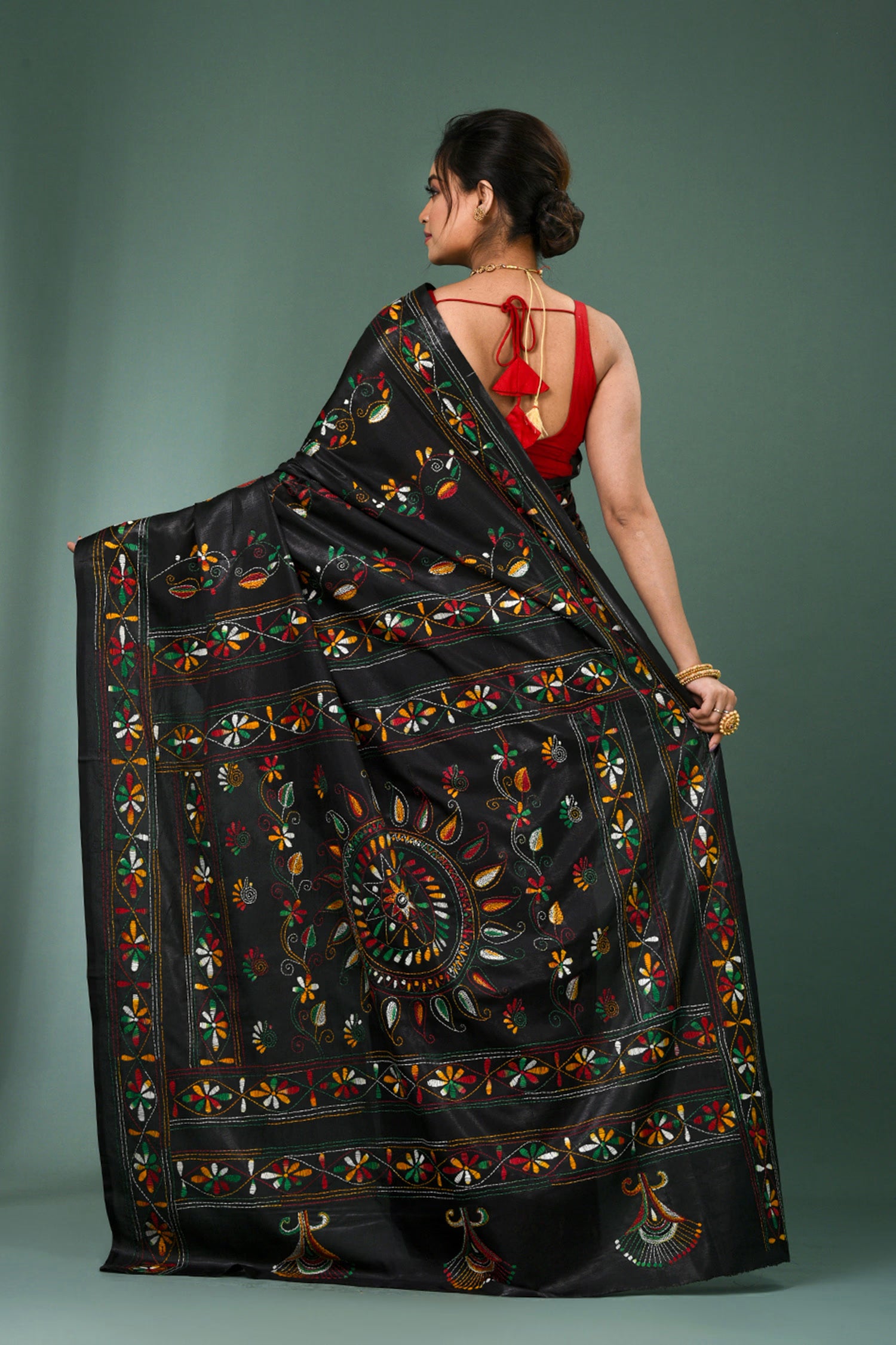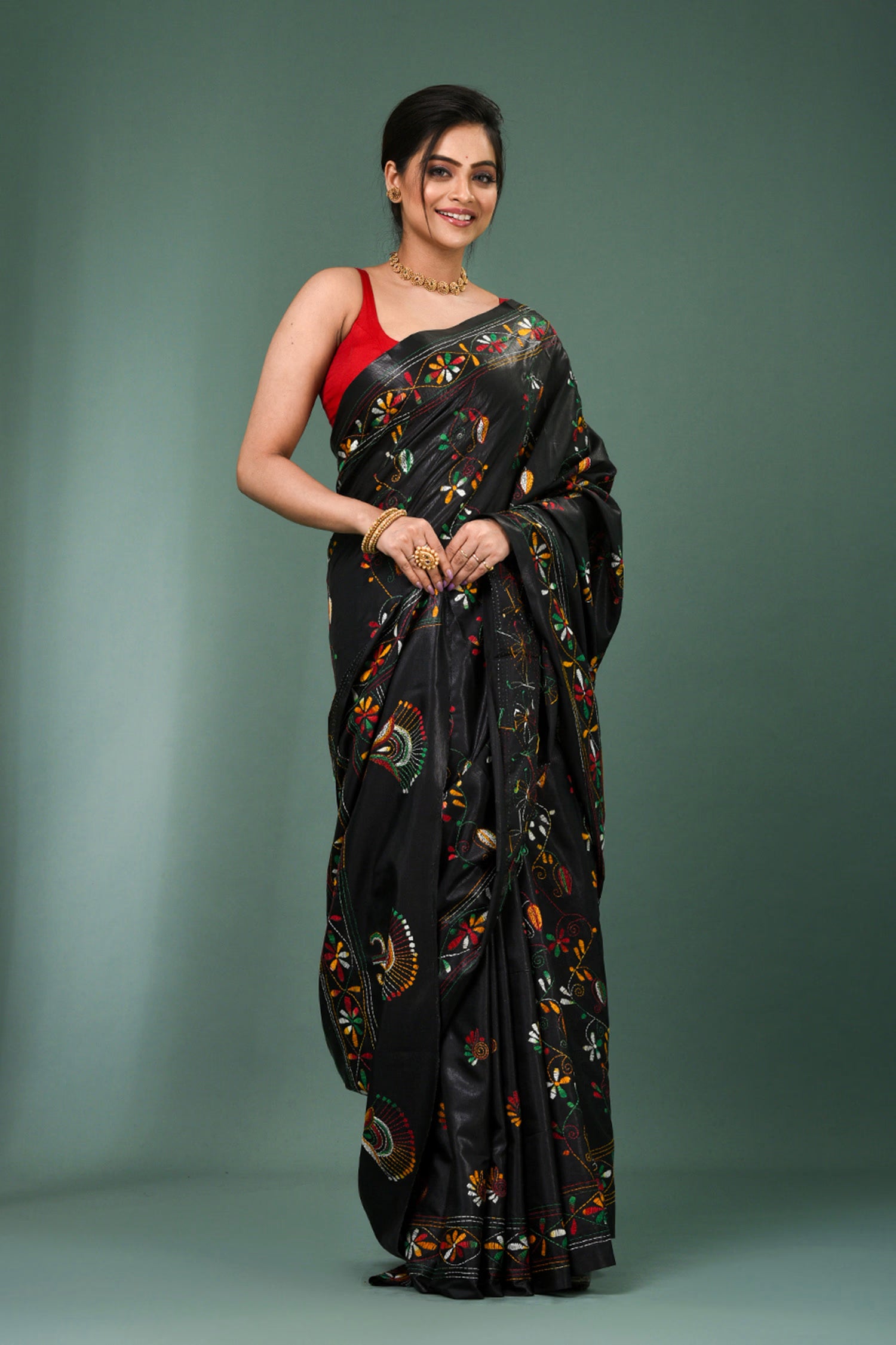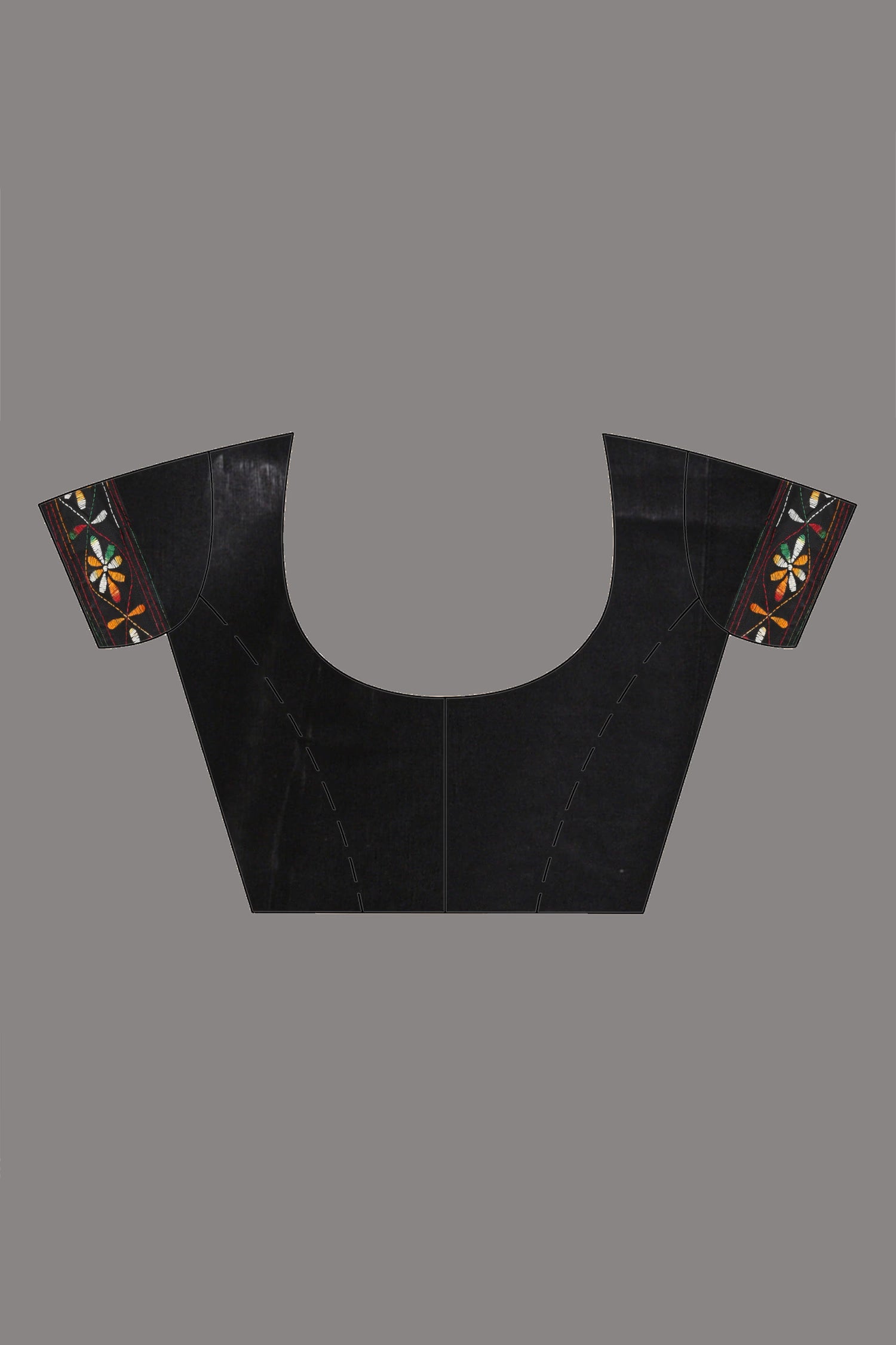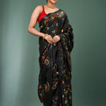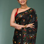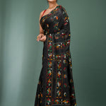 The beautiful floral embroidered design in contrast colors on the body and across the border of raven black blended silk saree complemented with unstitched blouse