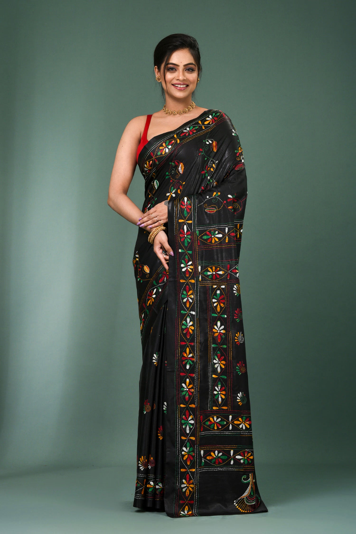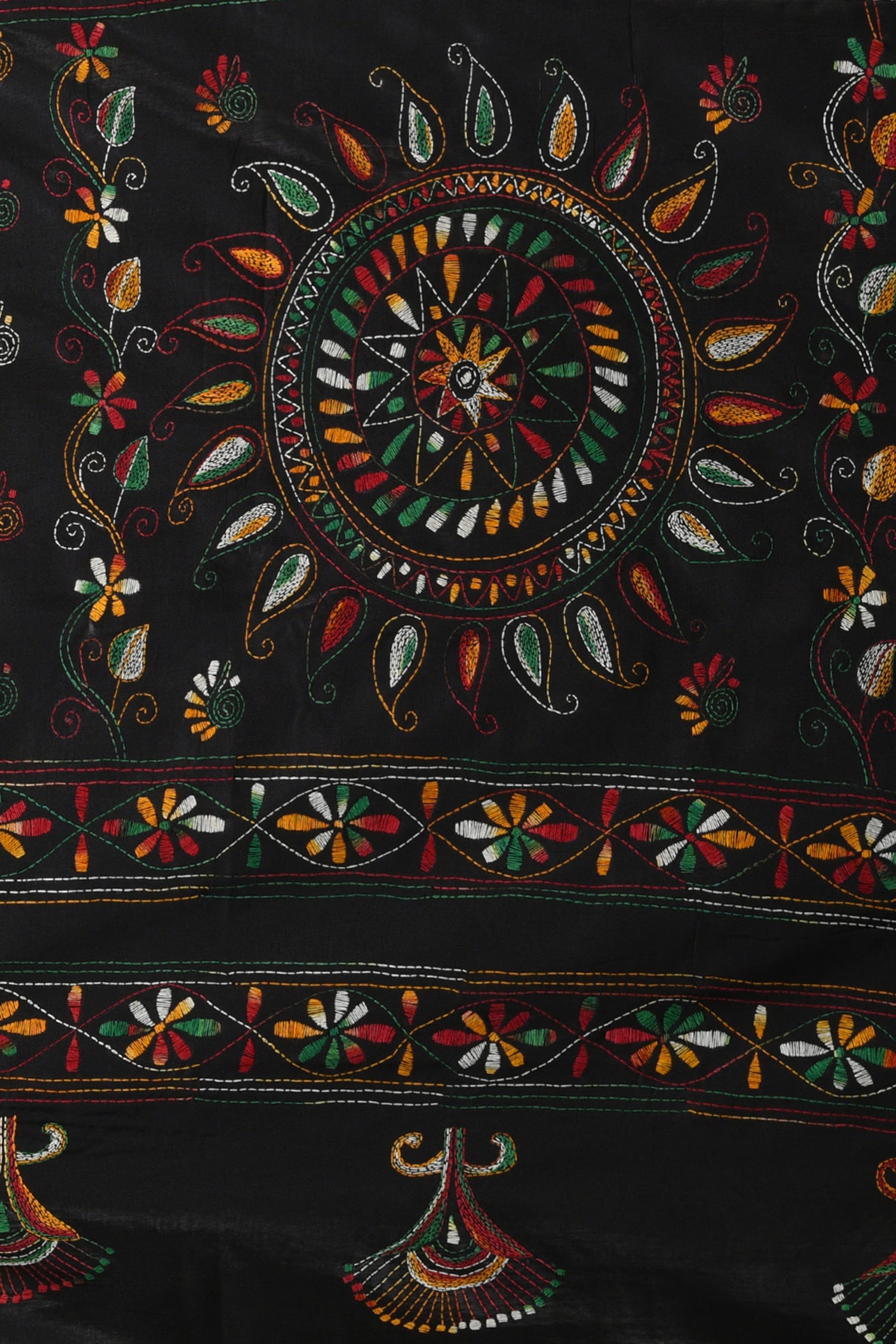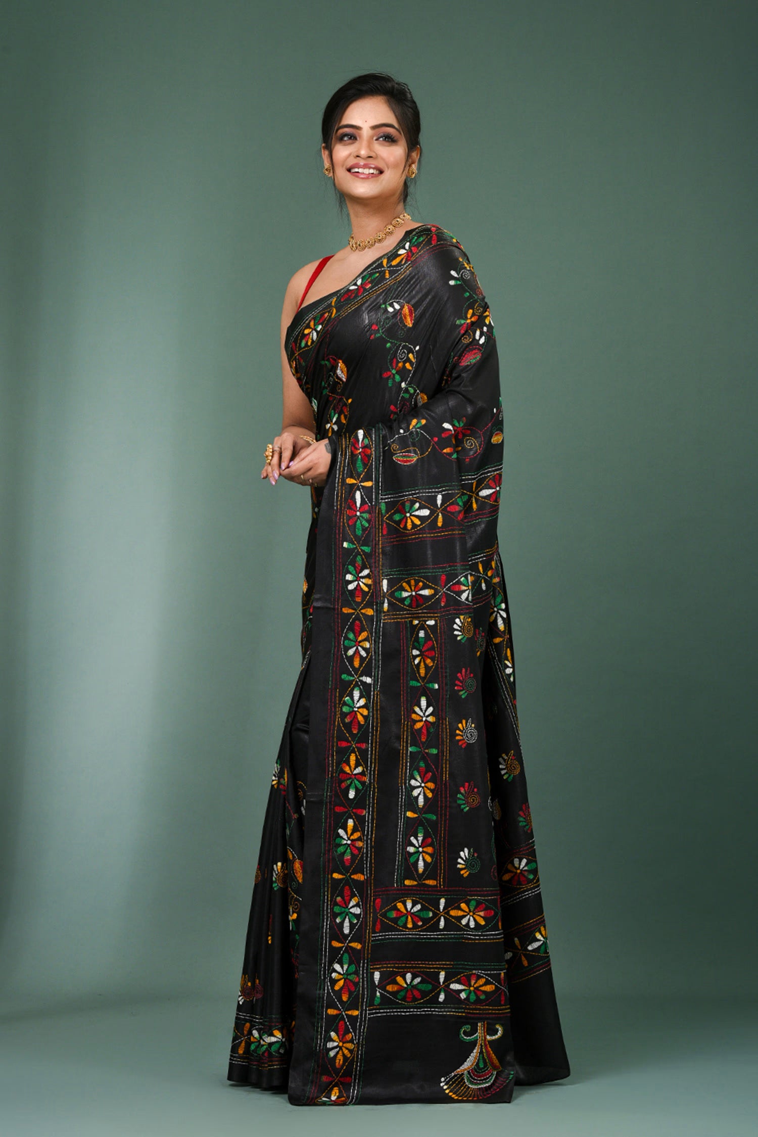 The beautiful floral embroidered design in contrast colors on the body and across the border of raven black blended silk saree complemented with unstitched blouse