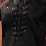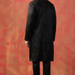 The embroidery work embellished on Raven Black silk blend kurta set with mandarin neckline complemented with full sleeves making it perfect for traditional occasions