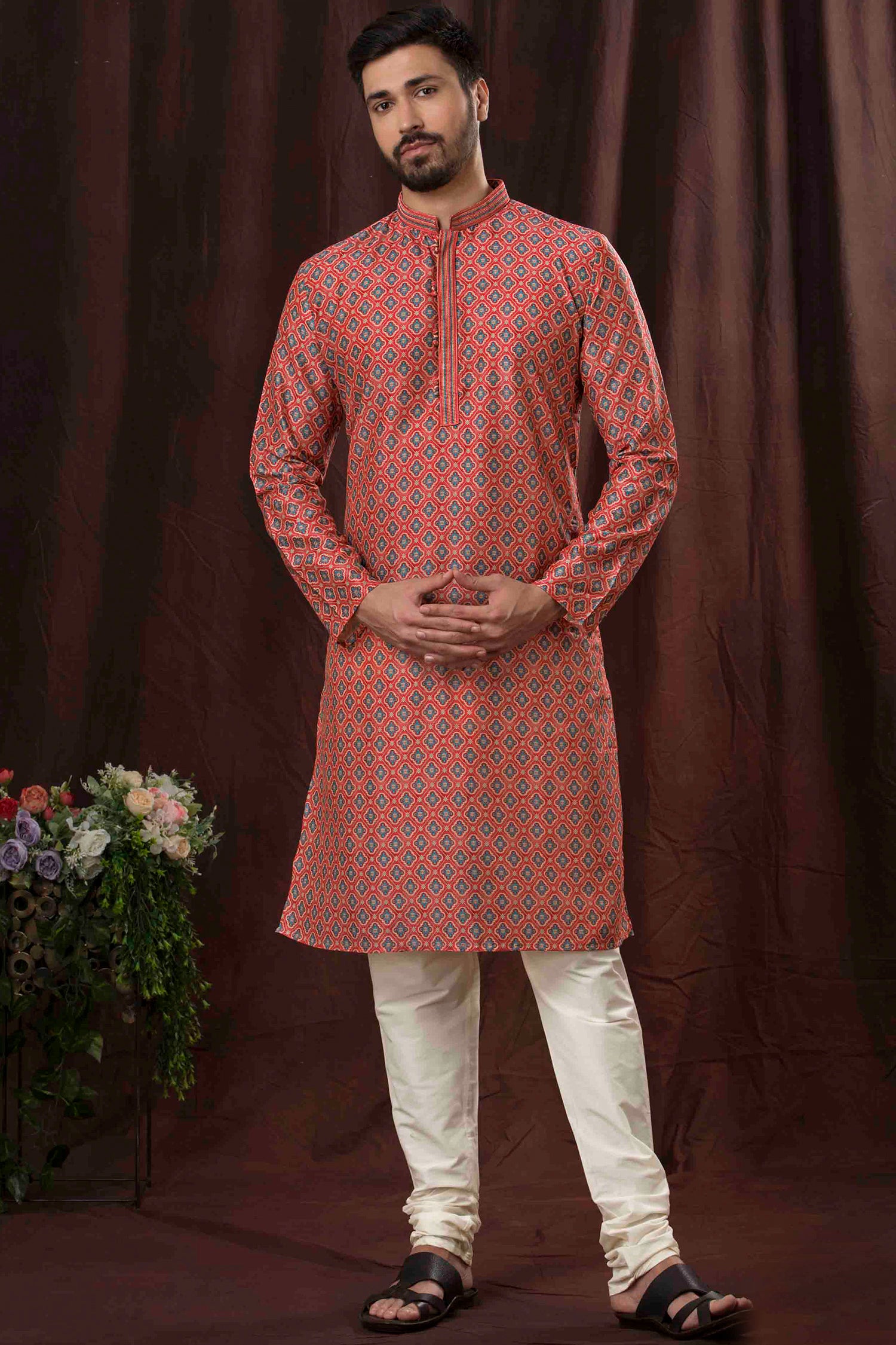 This red art silk digital printed kurta set adorned with unique design around the collar neck paired with off white churidar which emits sophisticated look