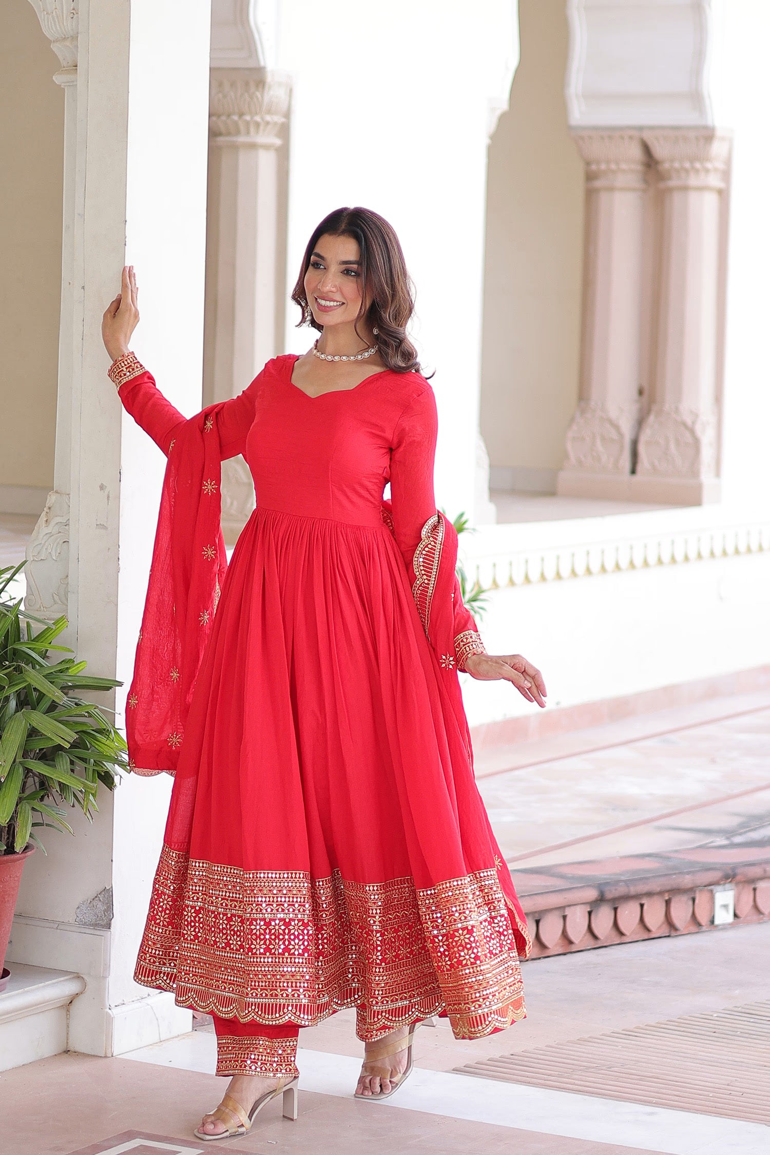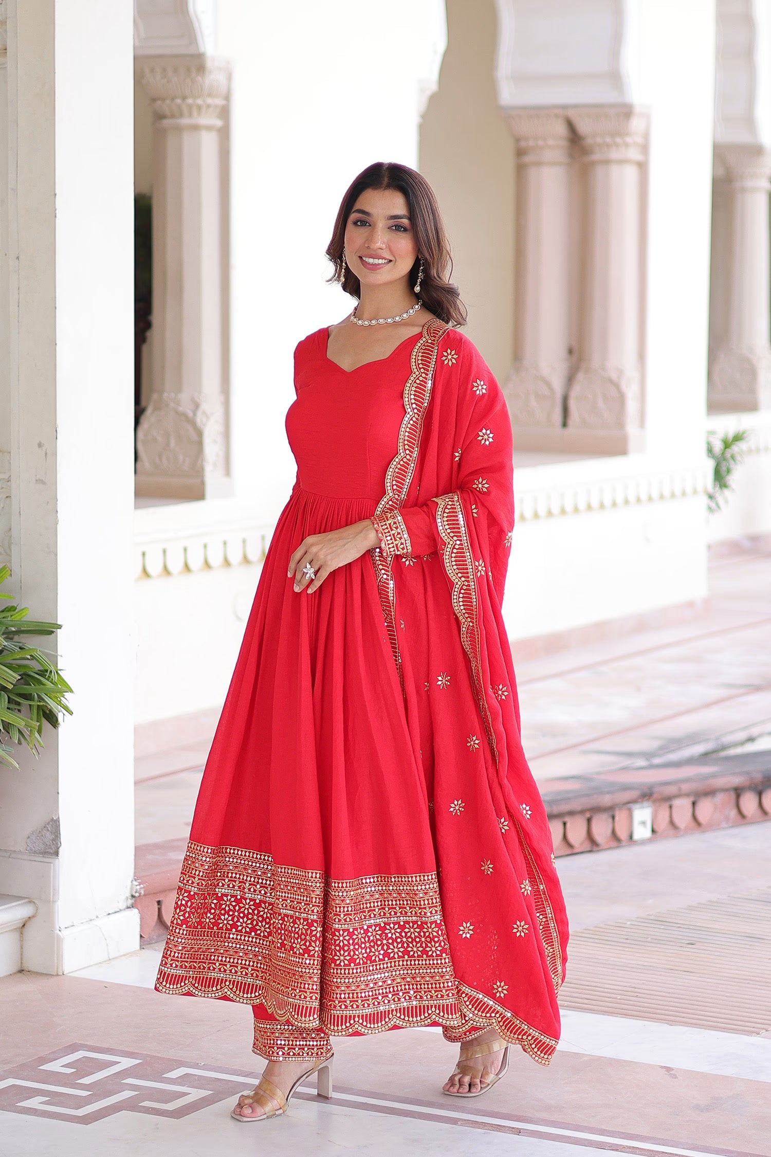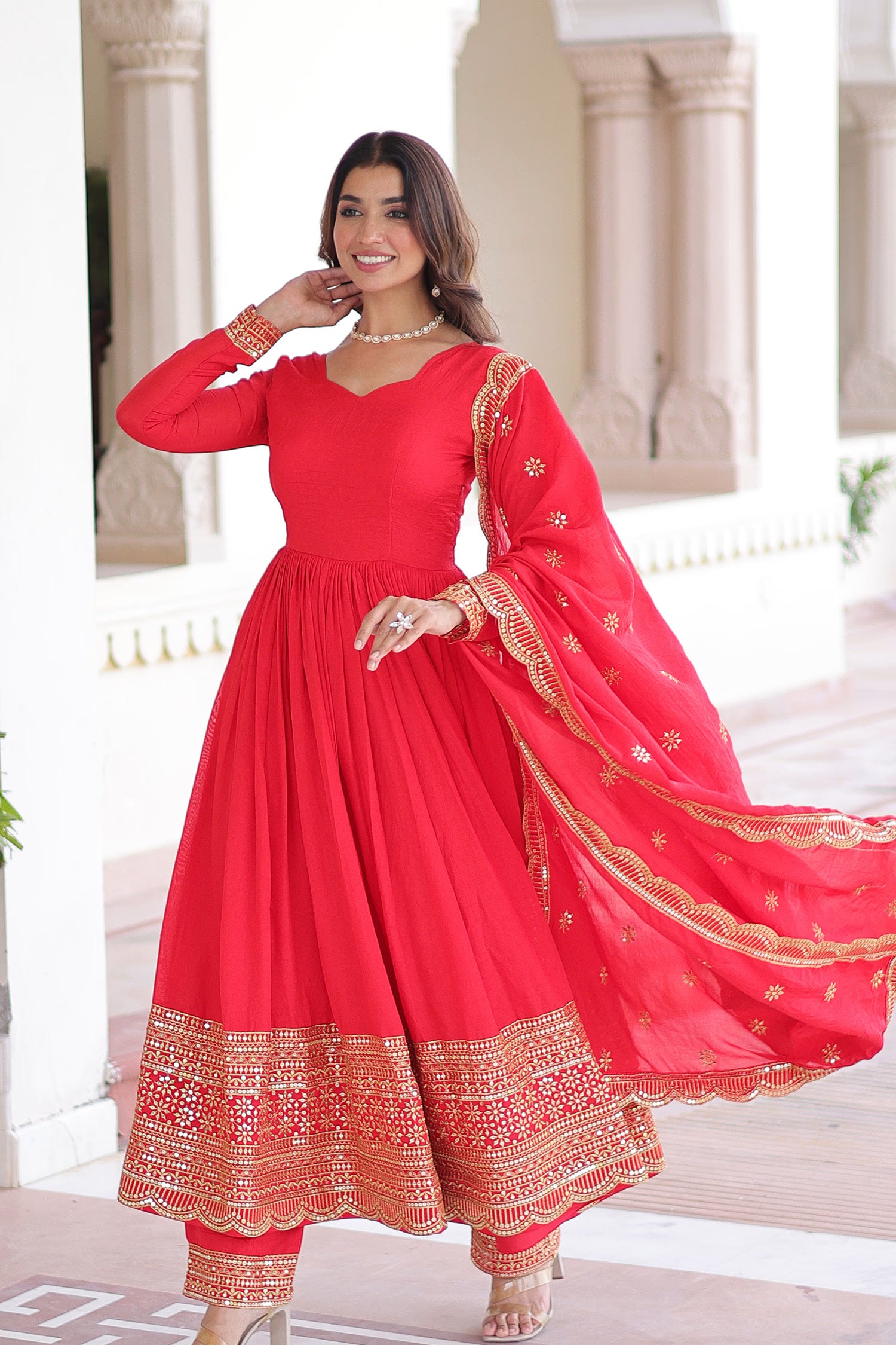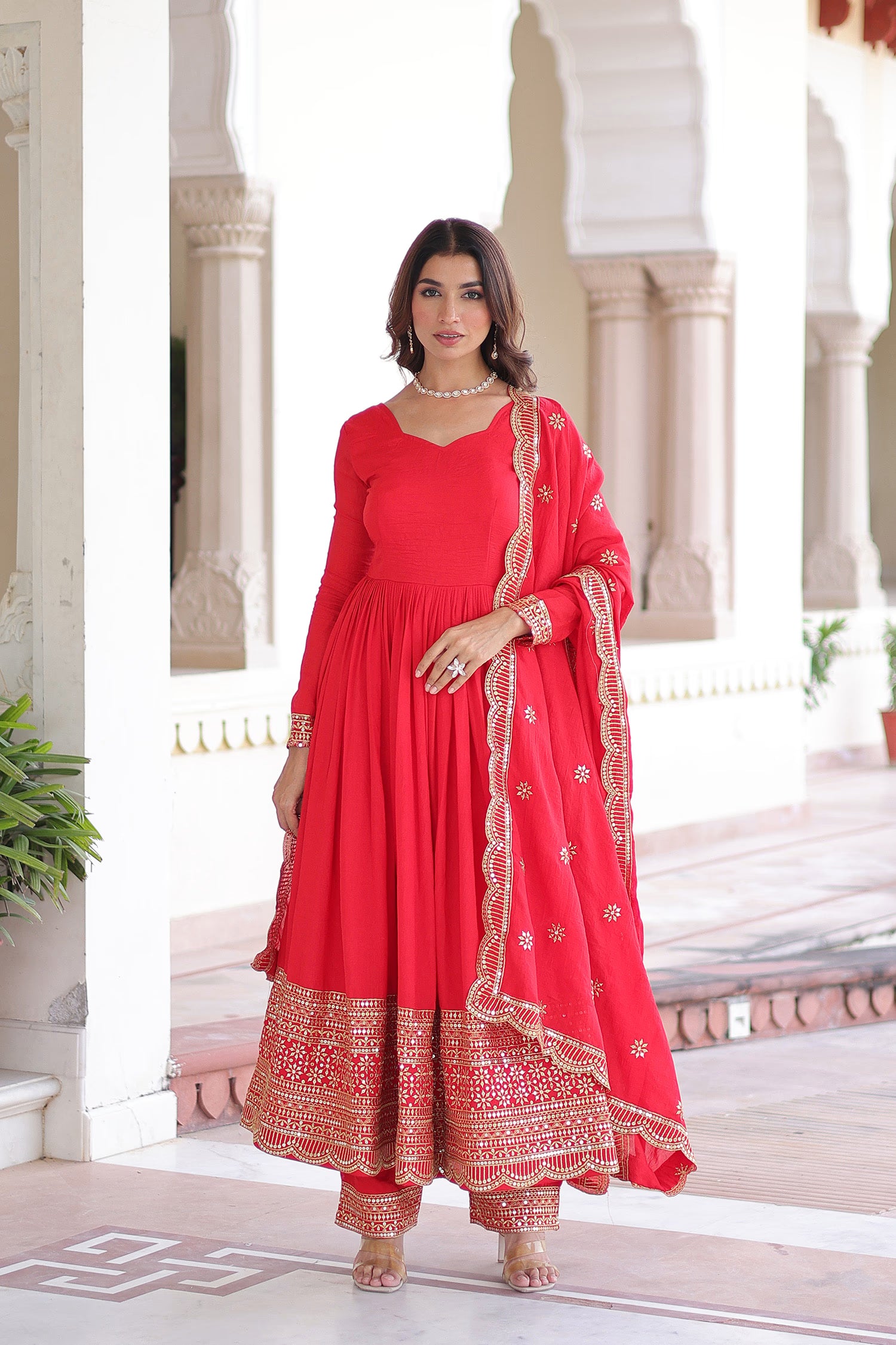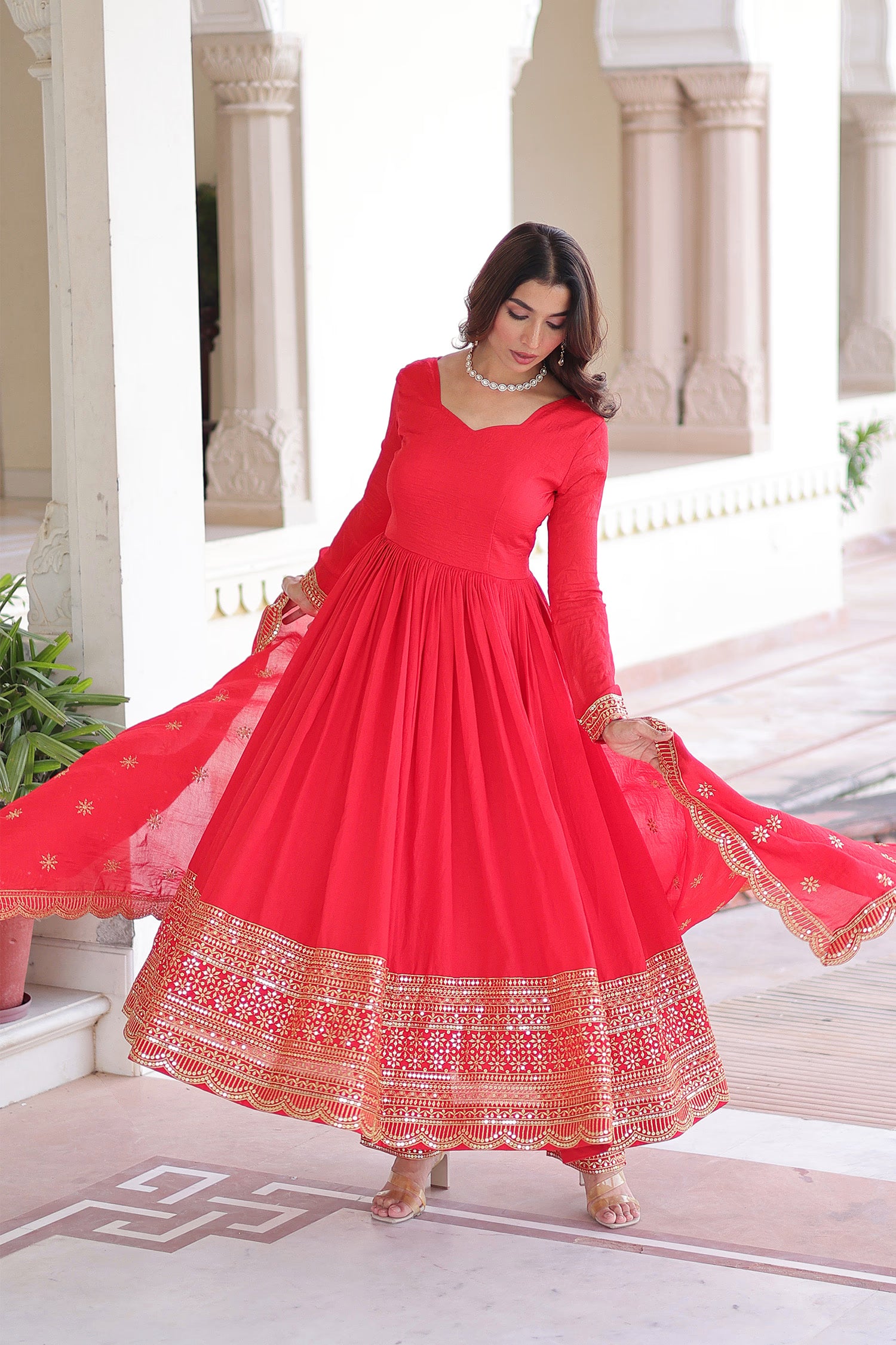 This sweetheart neckline of this Red anarkali set along with full sleeves adorned with sequins and embroidery complemented with scallop dupatta