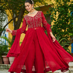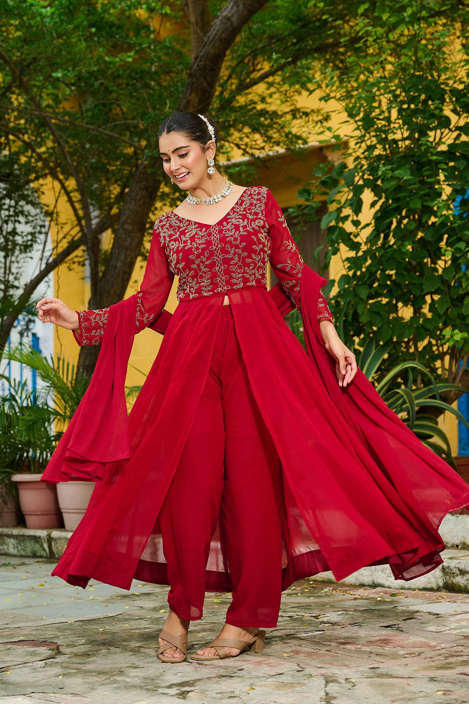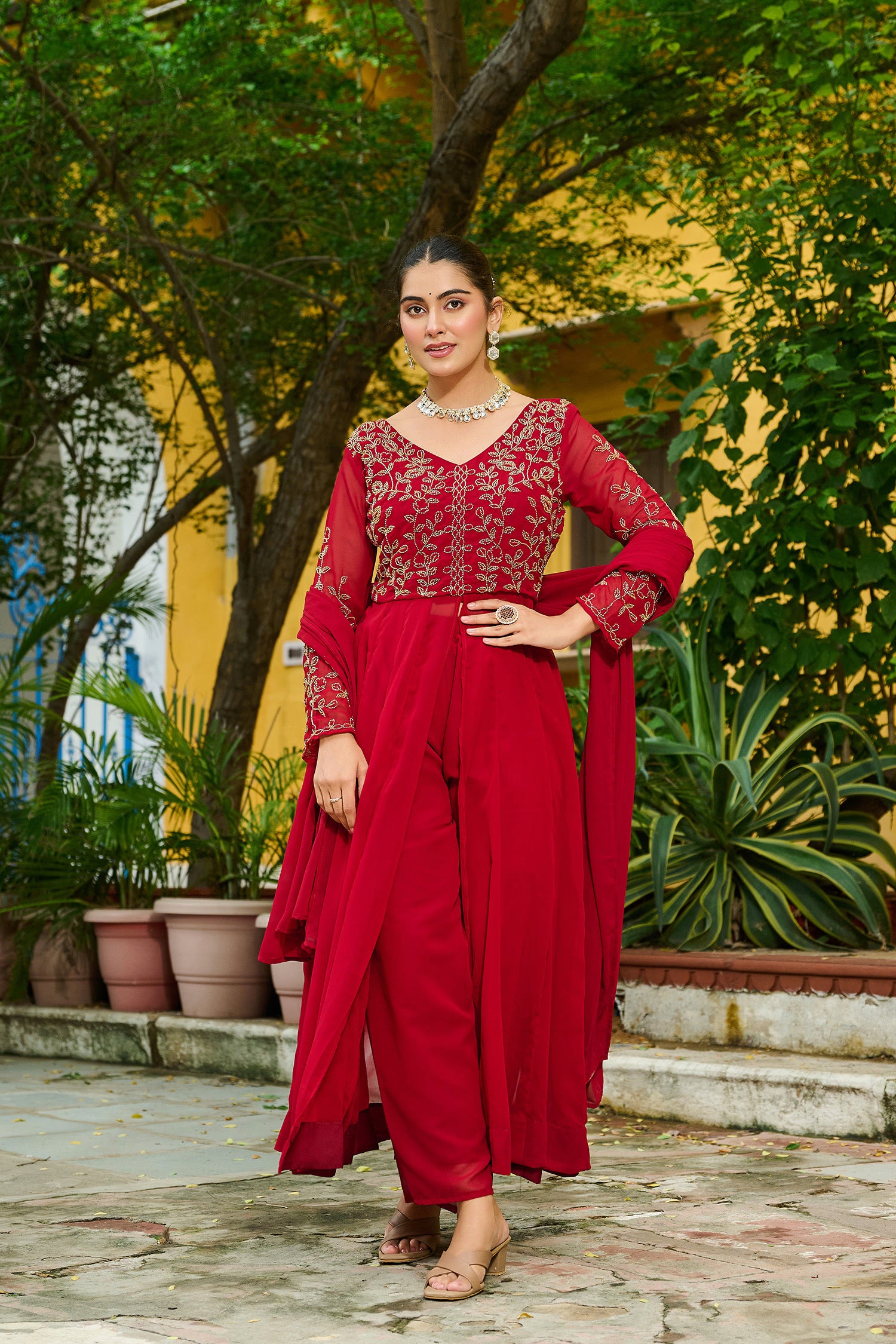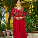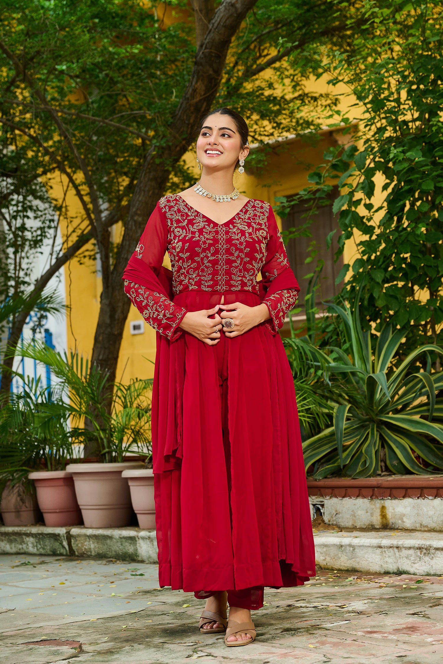 Red Faux Blooming Embroidered Anarkali Set With Slit