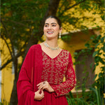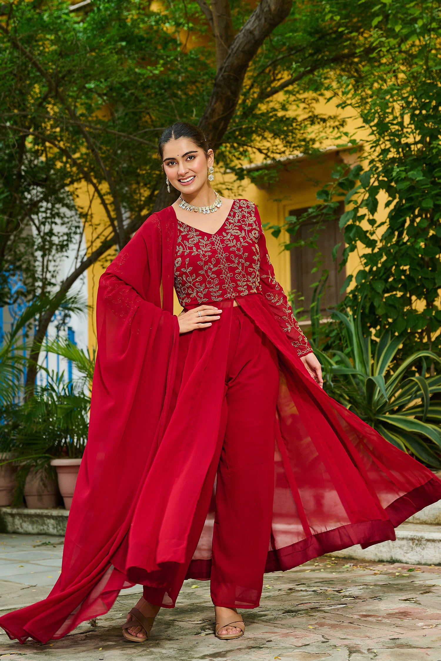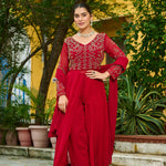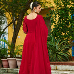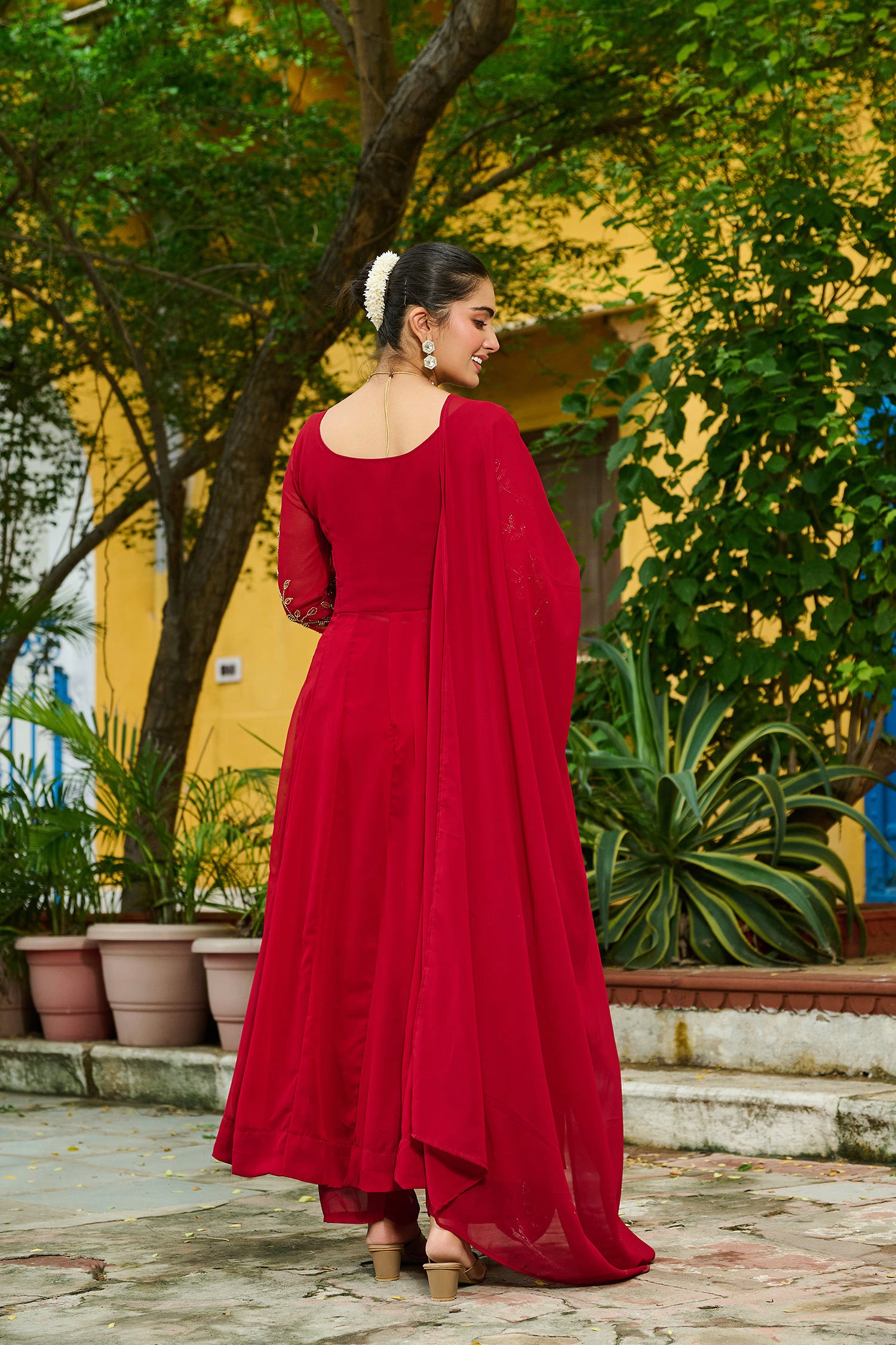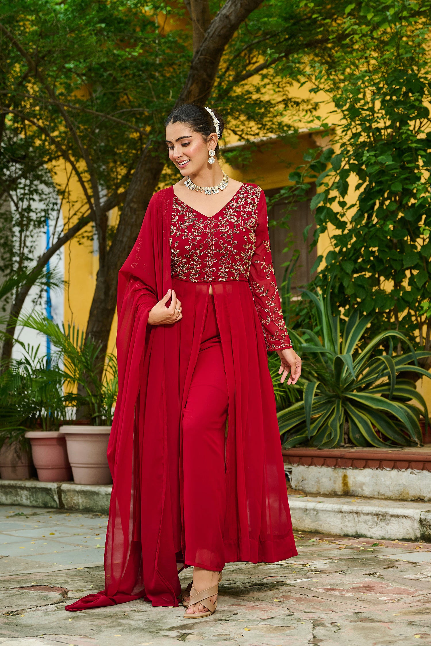 Red Faux Blooming Embroidered Anarkali Set With Slit