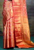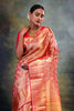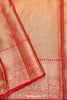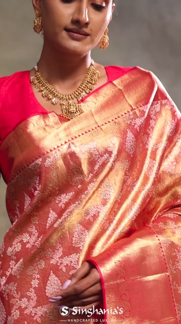 A red gold kanjivaram silk saree where the body features floral ogival jaali in gold-tilfi zari weaving, complemented by a contrast broad border displaying classical floral pattern. The rich pallu is designed with floral pattern. Perfect for wedding ceremonies and grand celebrations.