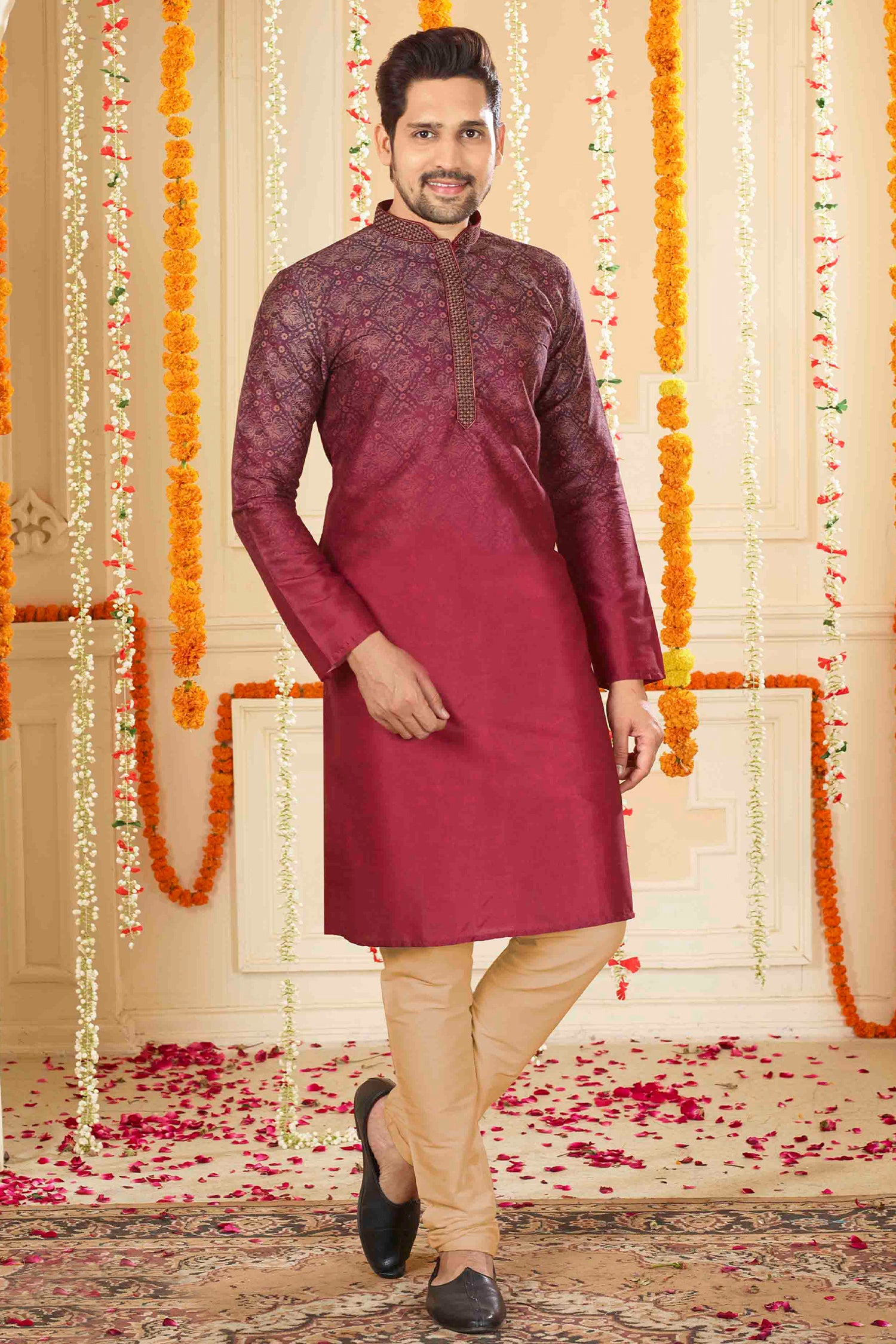 Red gradient art silk kurta set with embroidery collar neck which is adorned with unique design complemented beige pant emits rich and royal look for auspicious occasion.