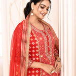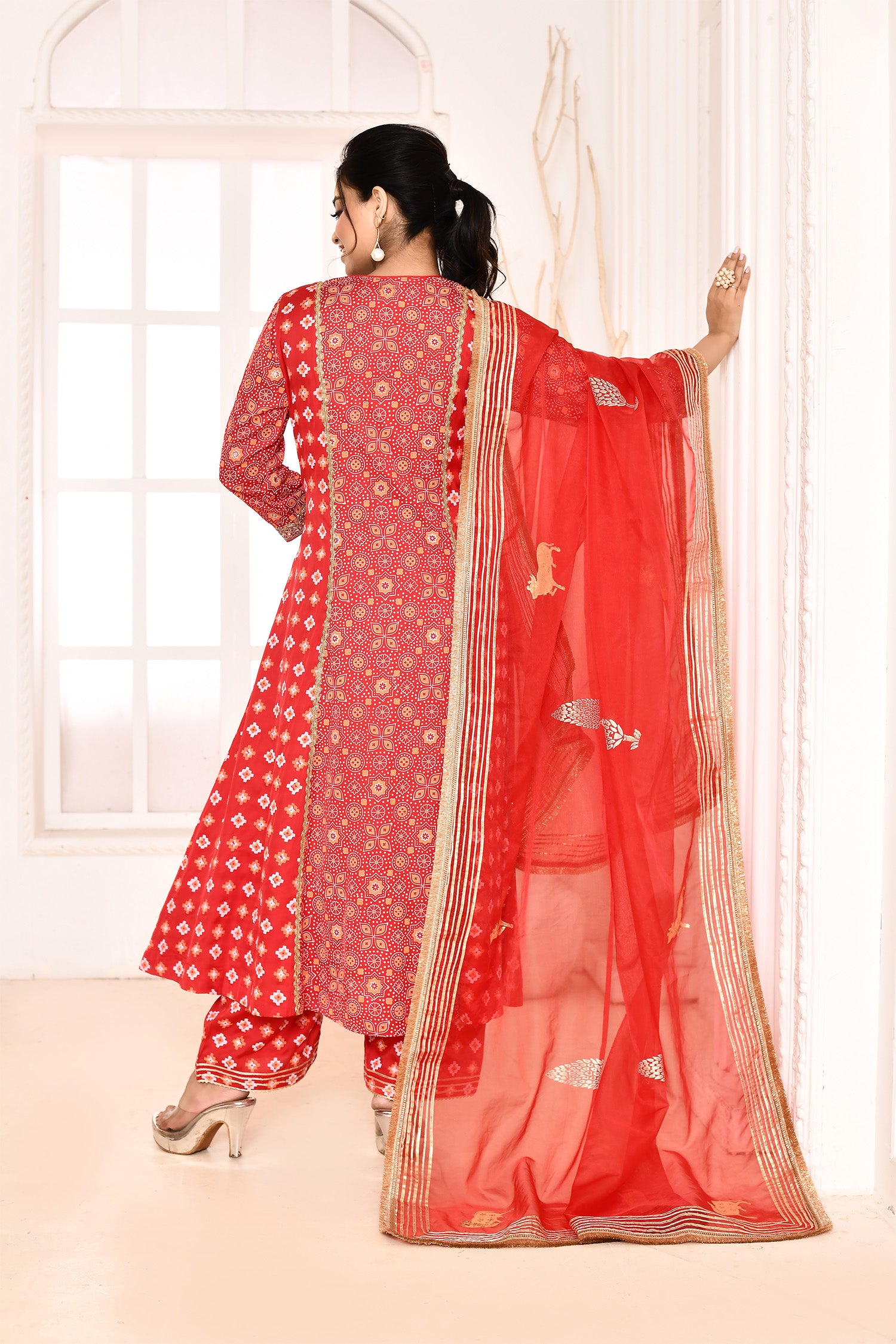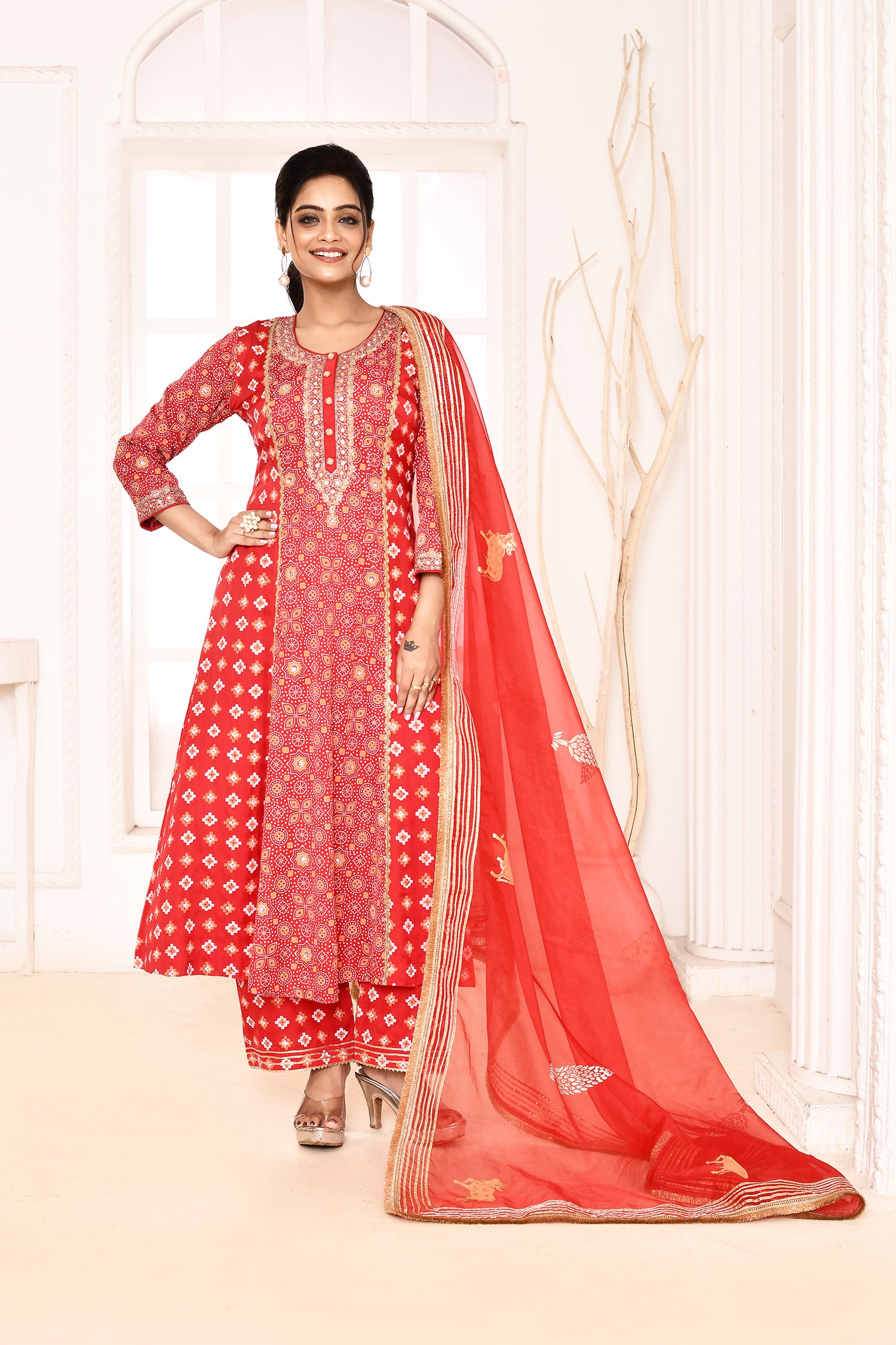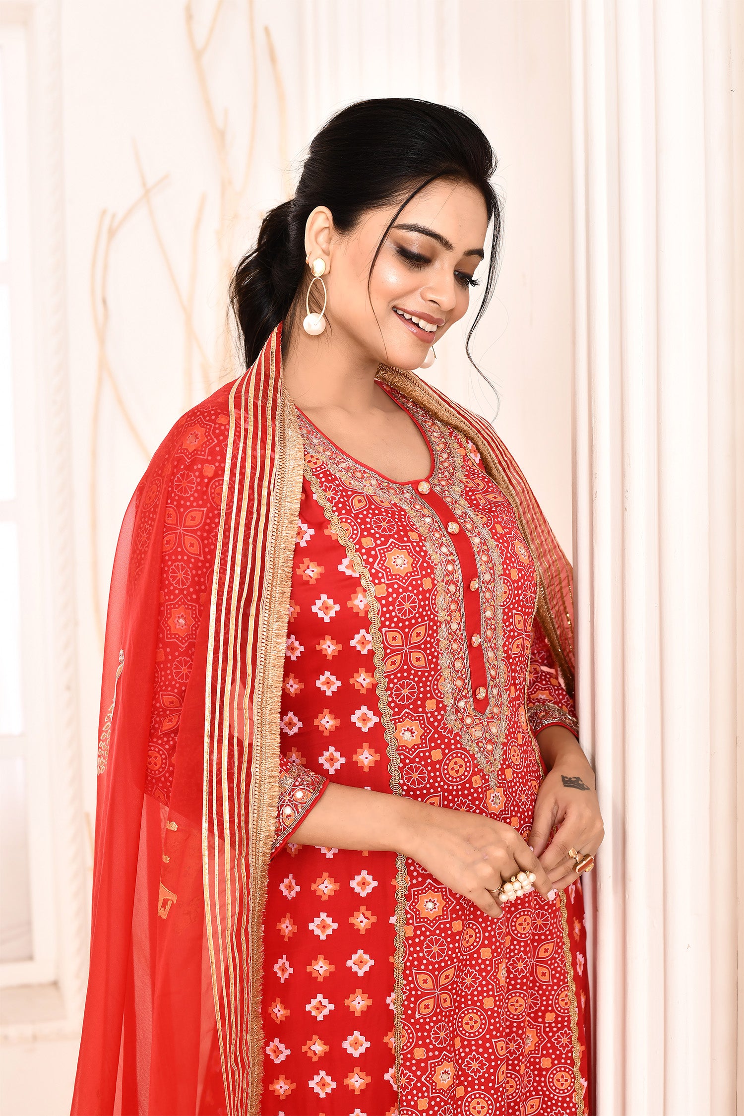 Red Hand Embroidery With Block Printed A-Line Kurta And Palazzo
