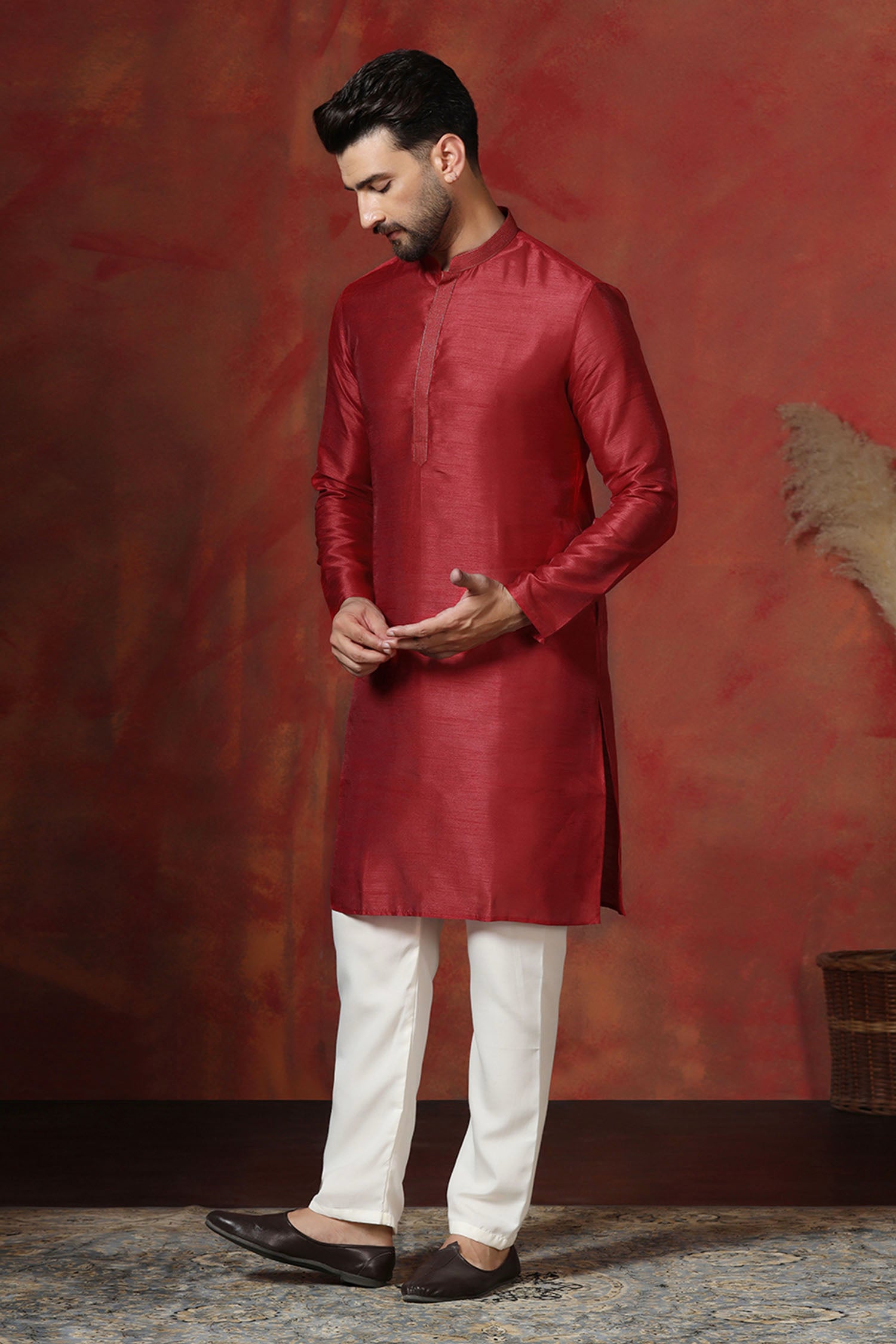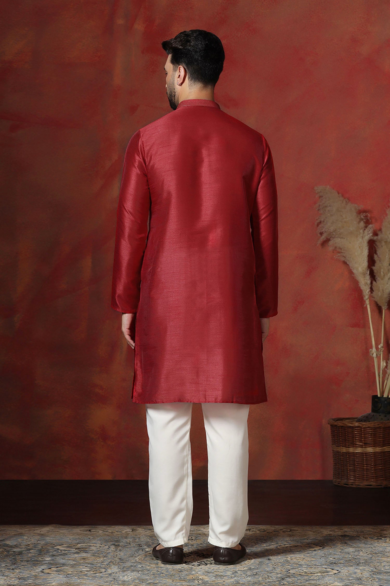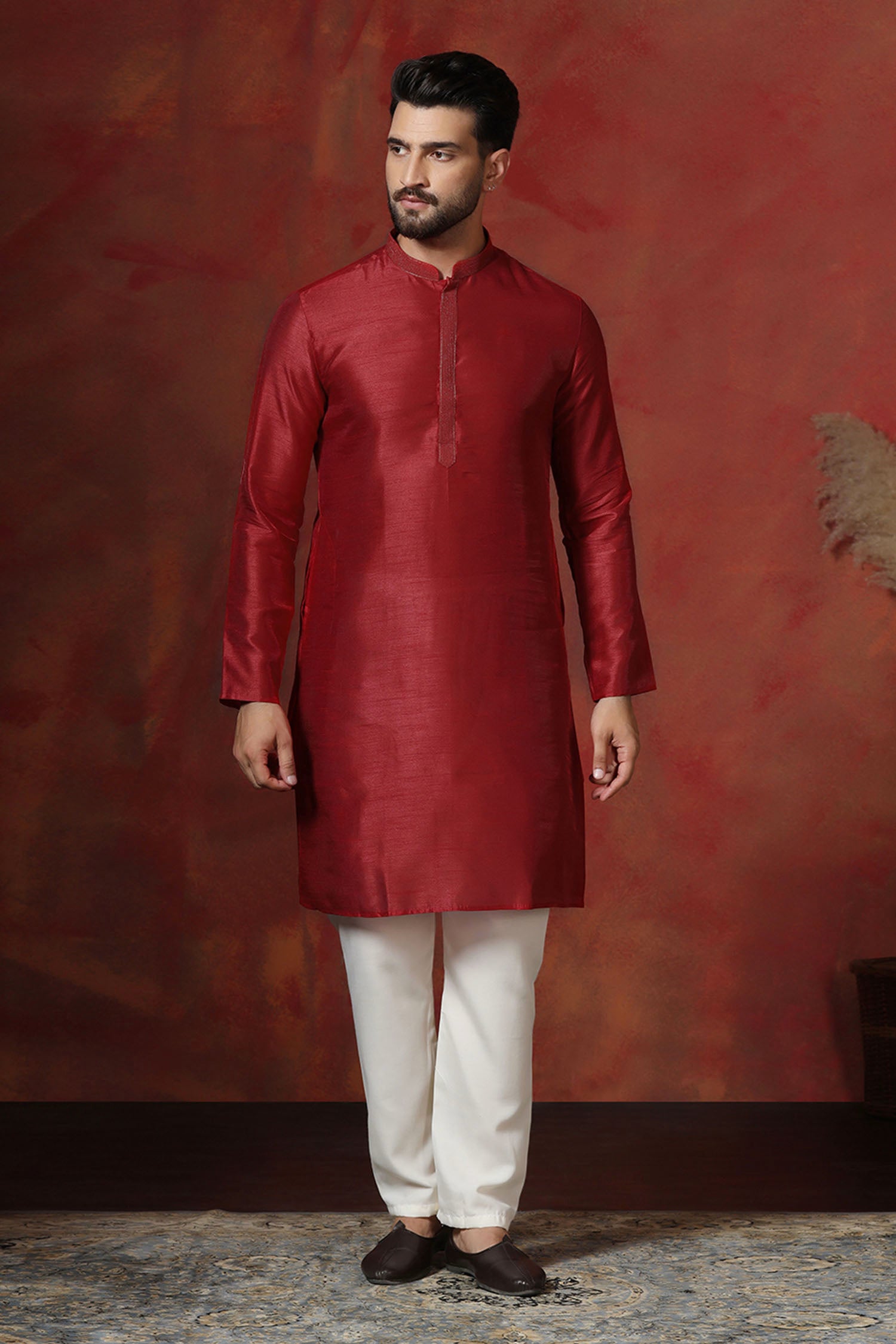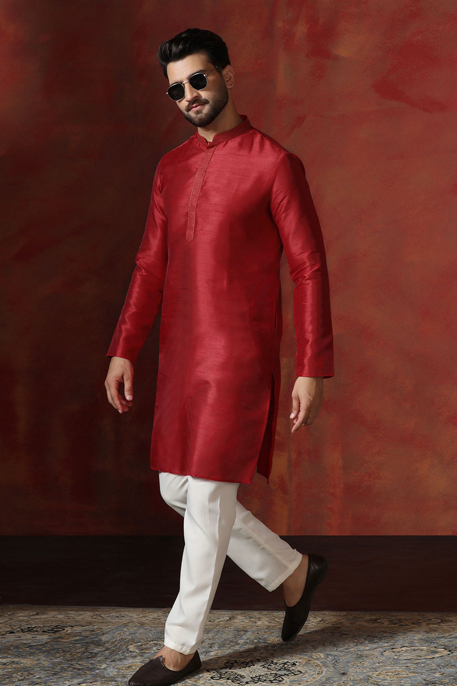 This red solid dupion kurta with mandarin neckline and full sleeves complemented with white pajama making it best choice for traditional occasions